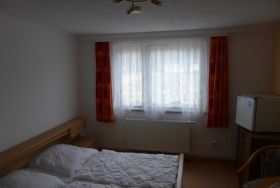 Zimmer mit Doppelbett, Tisch und 2 Stühlen. Es gibt einen Kleiderschrank und einen Minikühlschrank im Zimmer, ebenso wie einen Fernseher..