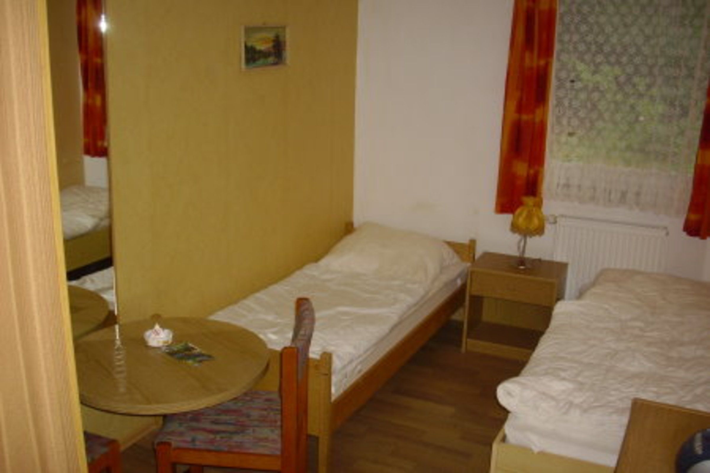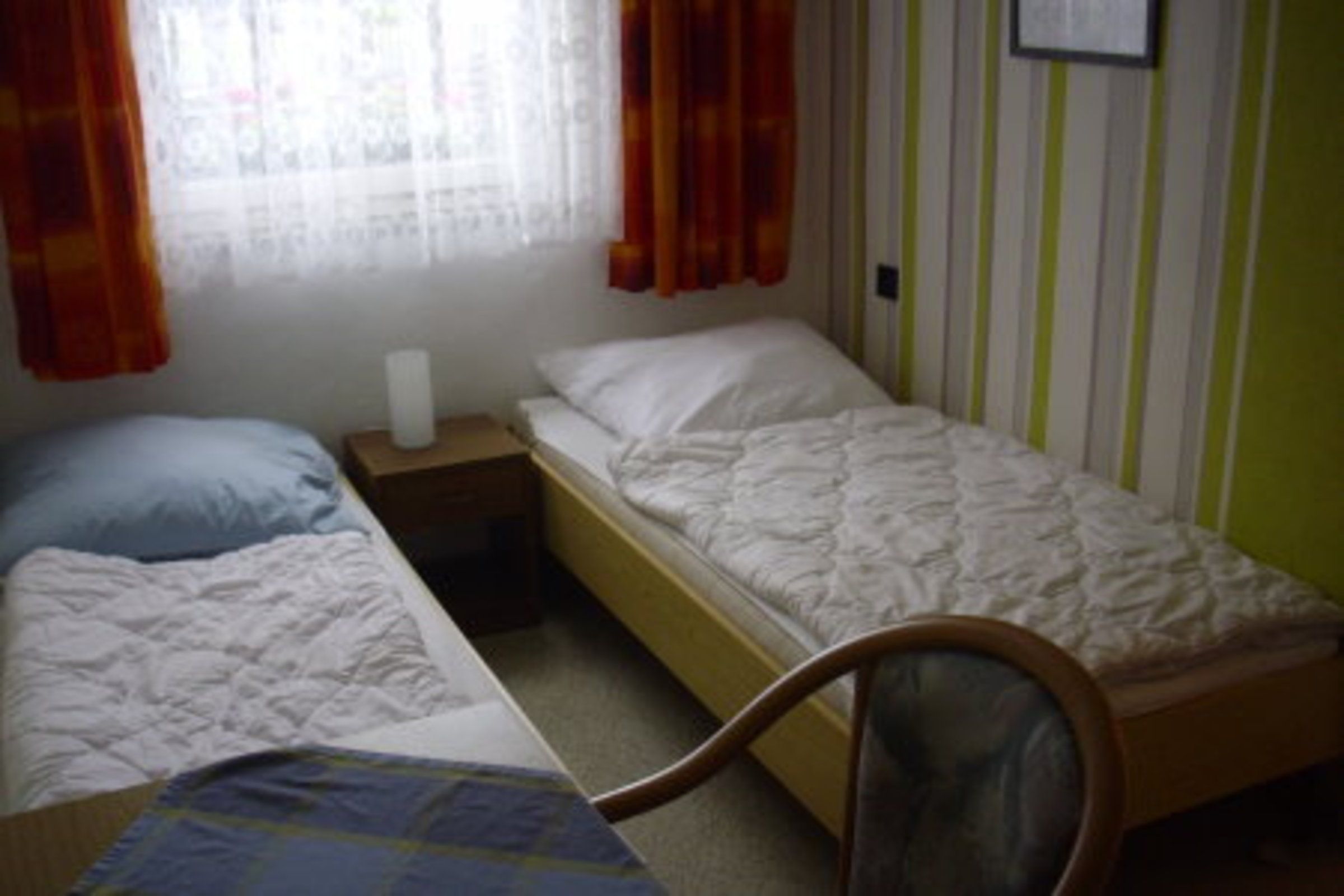 Schmales, einfach möbliertes Zweibettzimmer mit zwei durch Nachtschrank getrennten Einzelbetten, mit Kleiderschrank, Tisch und 2 Stühlen, Größe ca. 10 m², Fernheizung und TV befinden sich auch im Zimmer