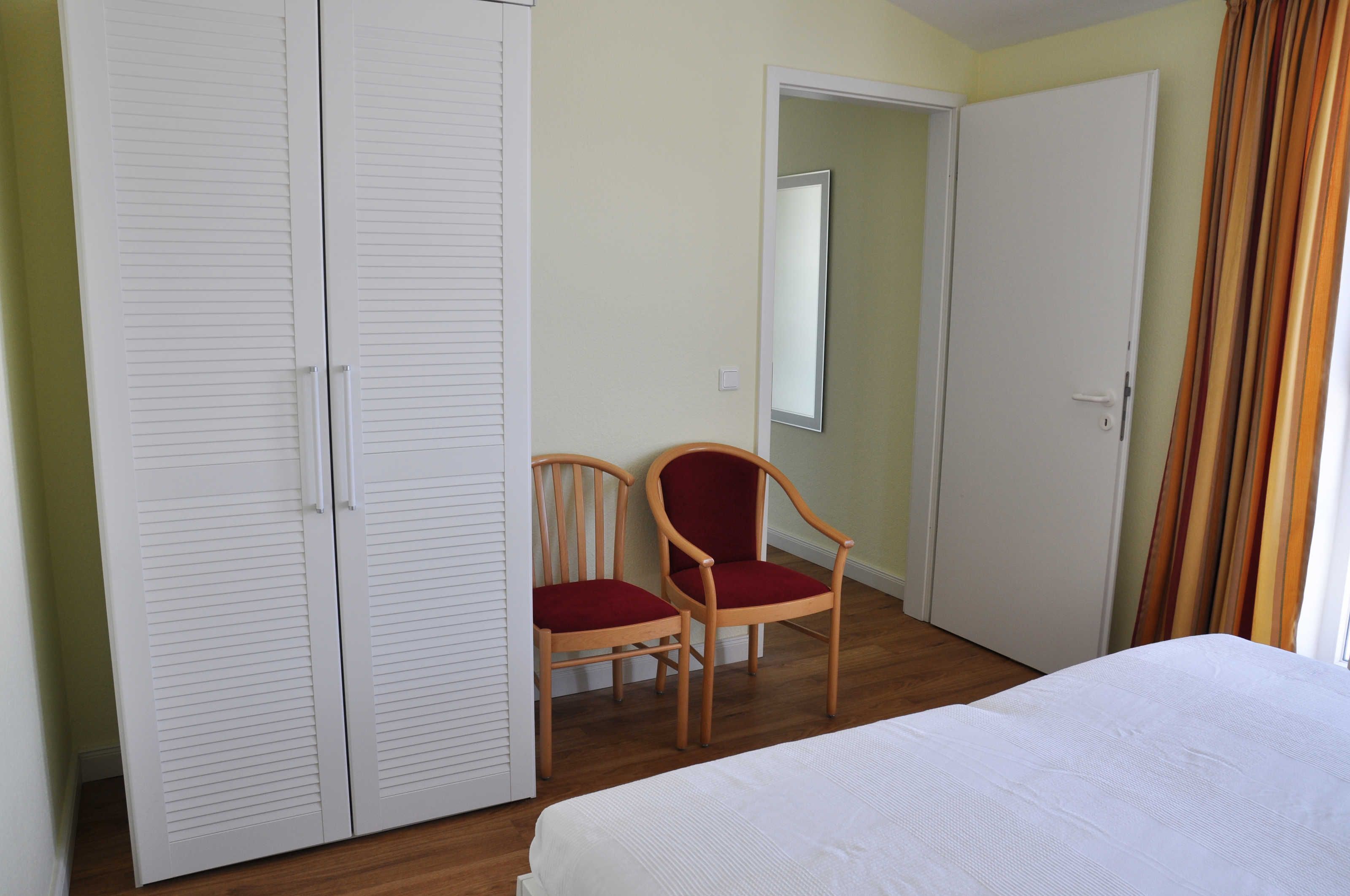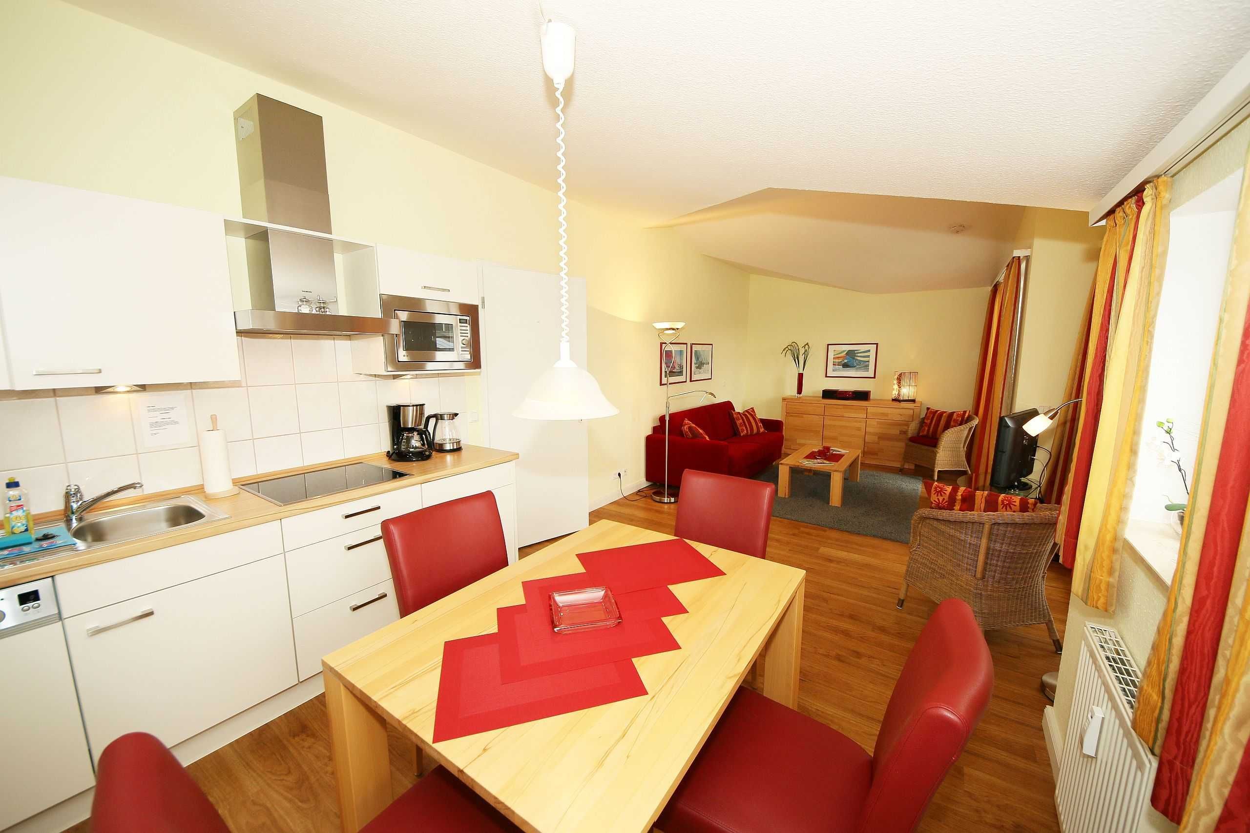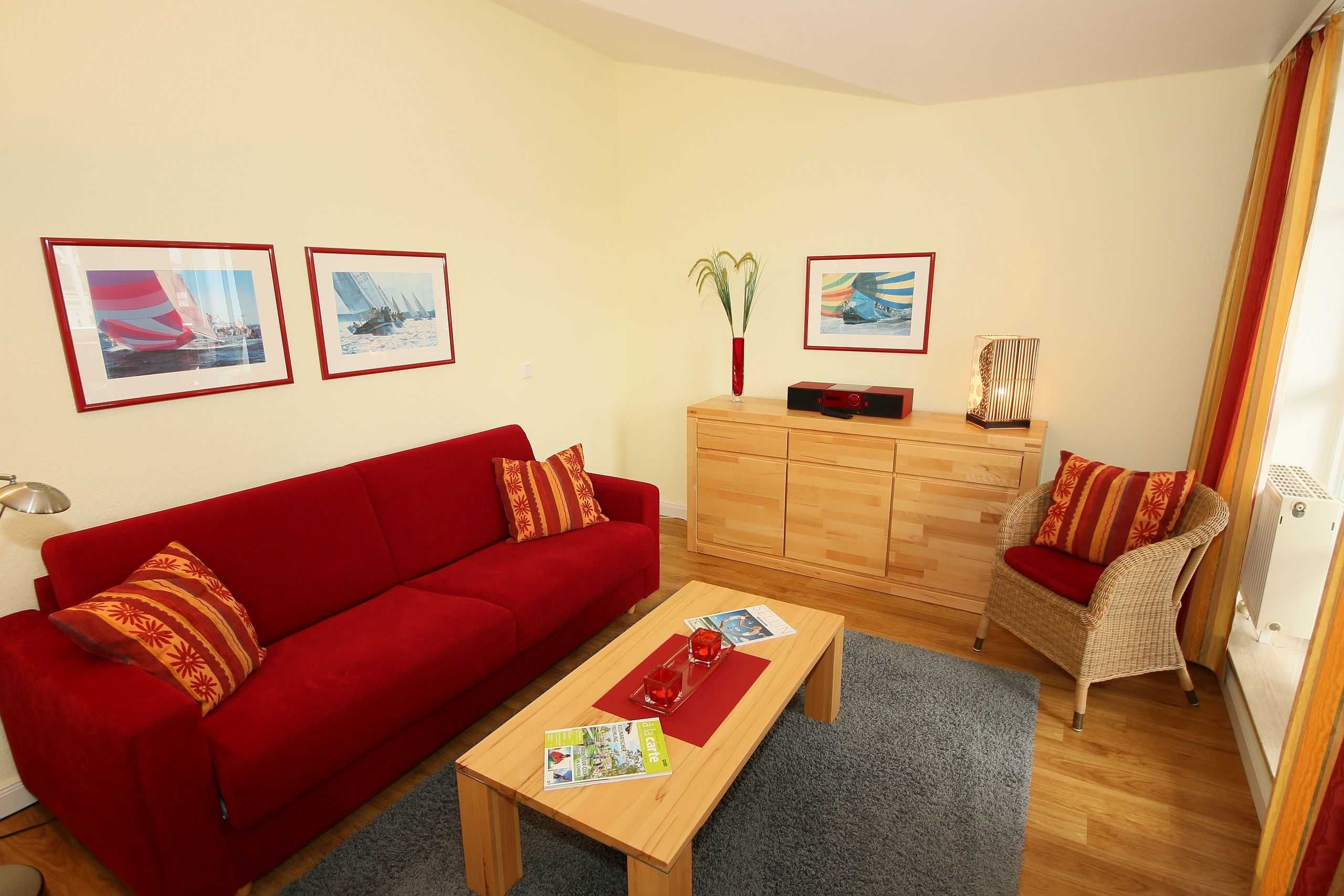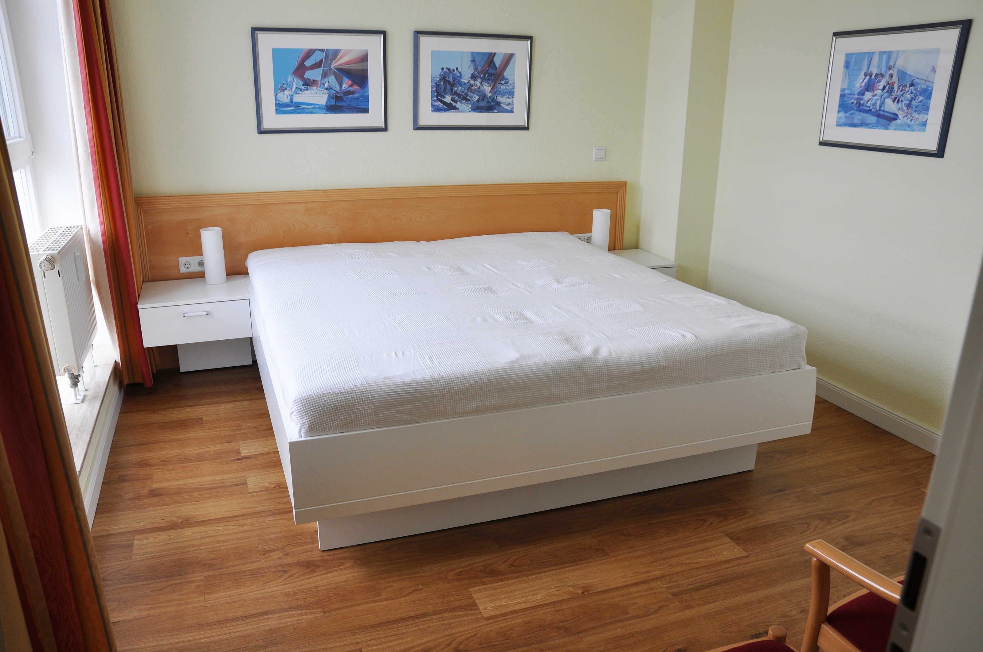 Die Nichtraucherferienwohnung Nr. 550 (Penthouse) befindet sich in der 3. Etage (Dachgeschoß). Sie ist mit ca. 57 qm hell und geräumig und bietet Ihnen Platz für 2 bis 4 Personen und 1 Kleinkind bis 3 Jahre im Kinderreisebett. In der Wohnung finden Sie einen kombinierten Wohn-/Koch- und Essbereich. Die integrierte, moderne Küchenzeile lässt mit einer eingebauten Mikrowelle mit Grillfunktion, Cerankochfeld, Geschirrspüler, Kühlschrank mit Eisfach, Kaffeemaschine, Toaster, Wasserkocher und anderen praktischen Helfern, die keine kulinarischen Wünsche offen lassen. Der Essplatz rundet diesen Bereich ab. Der angrenzende Wohnbereich ist geschmackvoll mit Massivholzmöbeln, einer Stehlampe, Couchtisch und einer gemütlichen Schlafcouch eingerichtet. Diese lässt sich in wenigen Handgriffen zur Schlafstätte (1,60 m x 2,00 m) für 2 weitere Personen umfunktionieren. Abgerundet wird der Wohnbereich mit einem Blu-Ray-Player, einer kleinen Hifi-Compactanlage (mit USB-Anschluss) sowie einem Flachbild-TV mit Sky (Auswahl von Sport, Film, Dokumentation). Erfreuen Sie sich an einer kleinen Buchauswahl und einigen Gesellschaftsspielen. Auch auf einen Internetanschluss (W-LAN) müssen Sie im Urlaub nicht verzichten. Dieser ist für Sie inklusive. Der bestuhlte Balkon, Richtung Osten, verfügt zusätzlich über einen Sonnenschirm und Relaxliegen. Begehbar ist der Balkon vom Wohnbereich. Das Schlafzimmer ist mit einem Doppelbett (1,80 m x 2,00 m), Nachttischkonsolen und Kleiderschrank ausgestattet. Verdunkelungsgardinen schützen in der Wohnung vor fremden Blicken von außerhalb. Im gefliesten Badezimmer befindet sich eine Badewanne mit Duschabtrennung, Waschplatz, WC und Fön. Insektenschutzgitter befinden sich in allen Räumlichkeiten. In der Wohnung finden Sie einen Staubsauger und einen Wäschetrockner für den Balkon. Ein eigener PKW-Stellplatz (Nr. 116) befindet sich in der Tiefgarage (Einfahrtshöhe 1,80 m) des Hauses. Hier befindet sich auch ein allgemeiner Fahrradraum, wo Sie ihre mitgebrachten Fahrräder unterstellen können. Haustiere sind nicht erlaubt. Die Erstausstattung eines Wäschepaketes (komplette Bettwäsche, 1 Duschhandtuch, 2 kleine Handtücher) können Sie bis 14 Tage vor Anreise gegen einen Aufpreis dazu buchen oder durch eigene ergänzen. Ab 2 gebuchten Paketen erhalten Sie einmalig 1 Geschirrhandtuch und 1 Duschvorleger dazu.