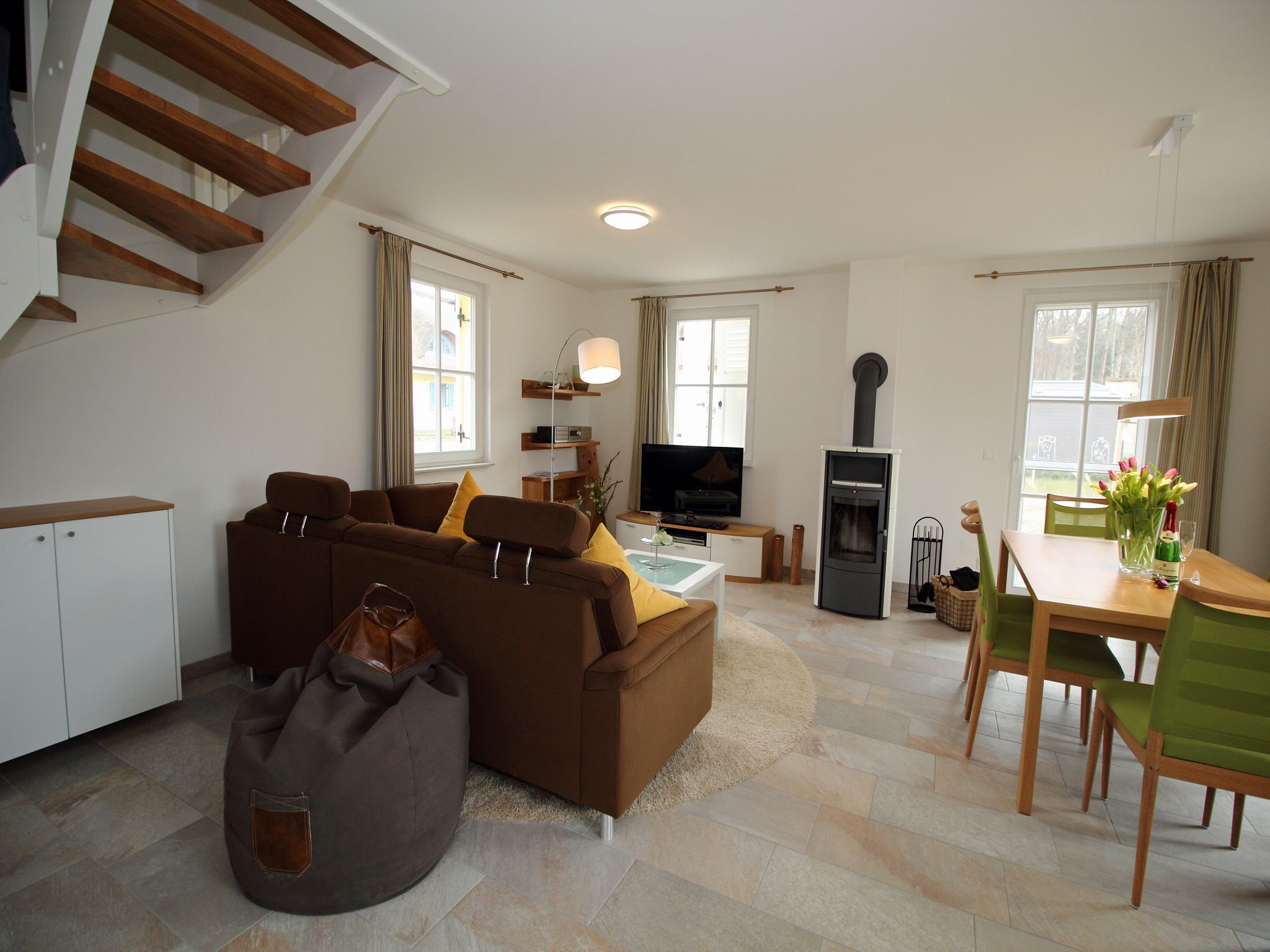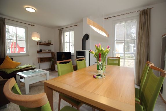 • exklusive Ausstattung im Wohn- und Essbereich. Dazu gehören ein Kaminofen, ein Flachbild-Fernseher, ein Blu-Ray-Player, eine Musikanlage mit Radio und Gesellschaftsspiele