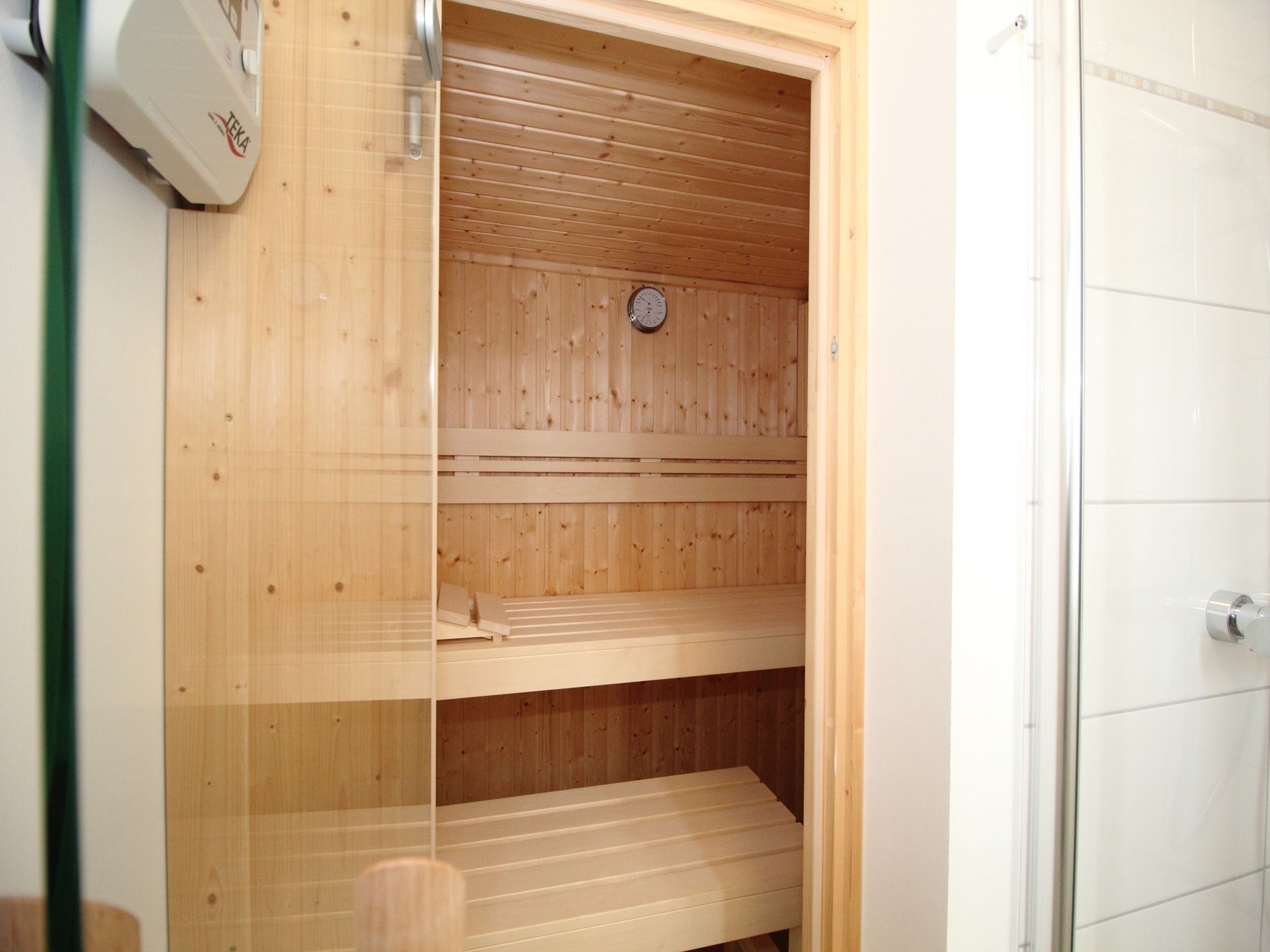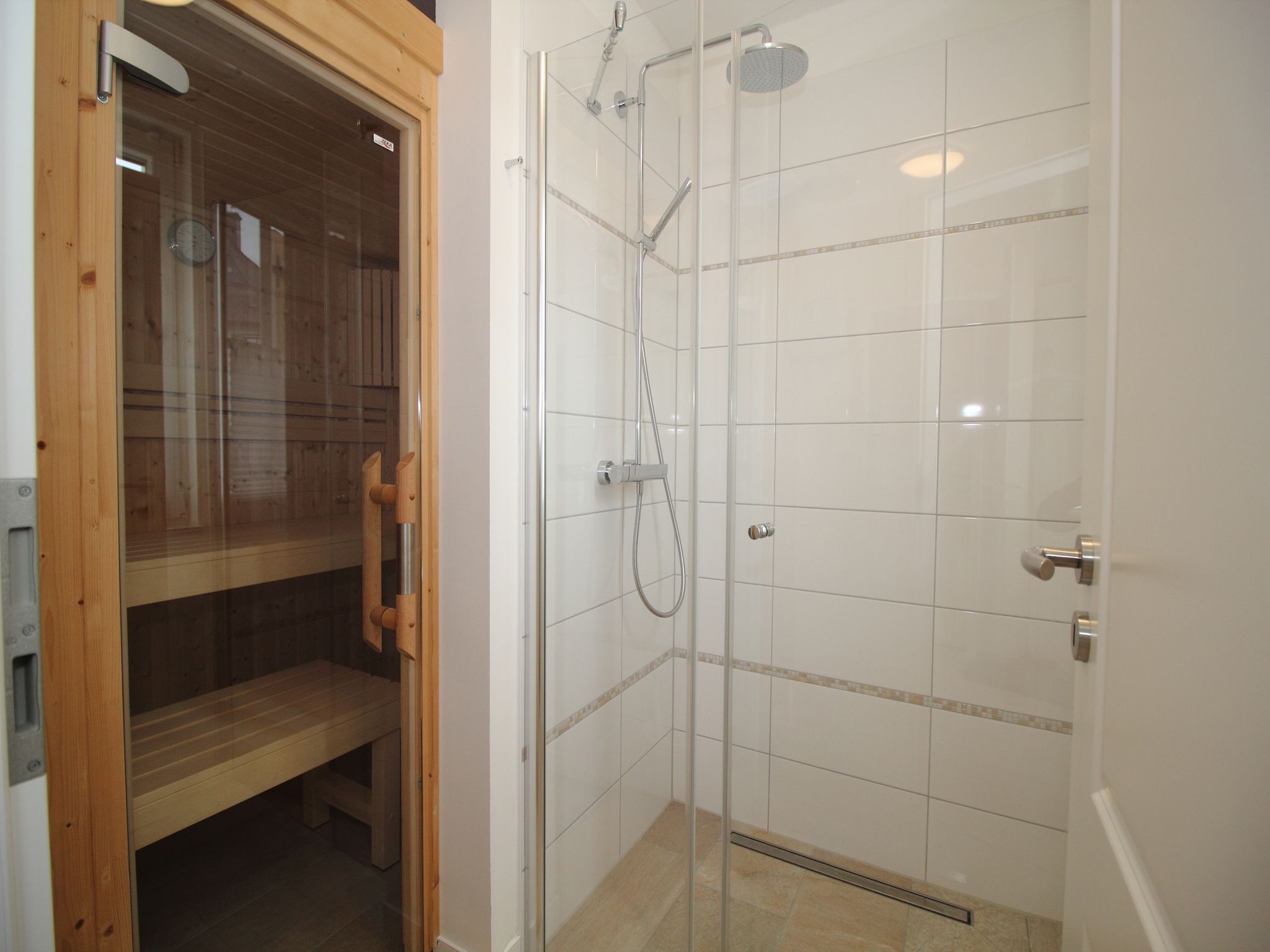 • Badezimmer mit ebenerdiger Dusche und Sauna, die Toilette ist separiert.