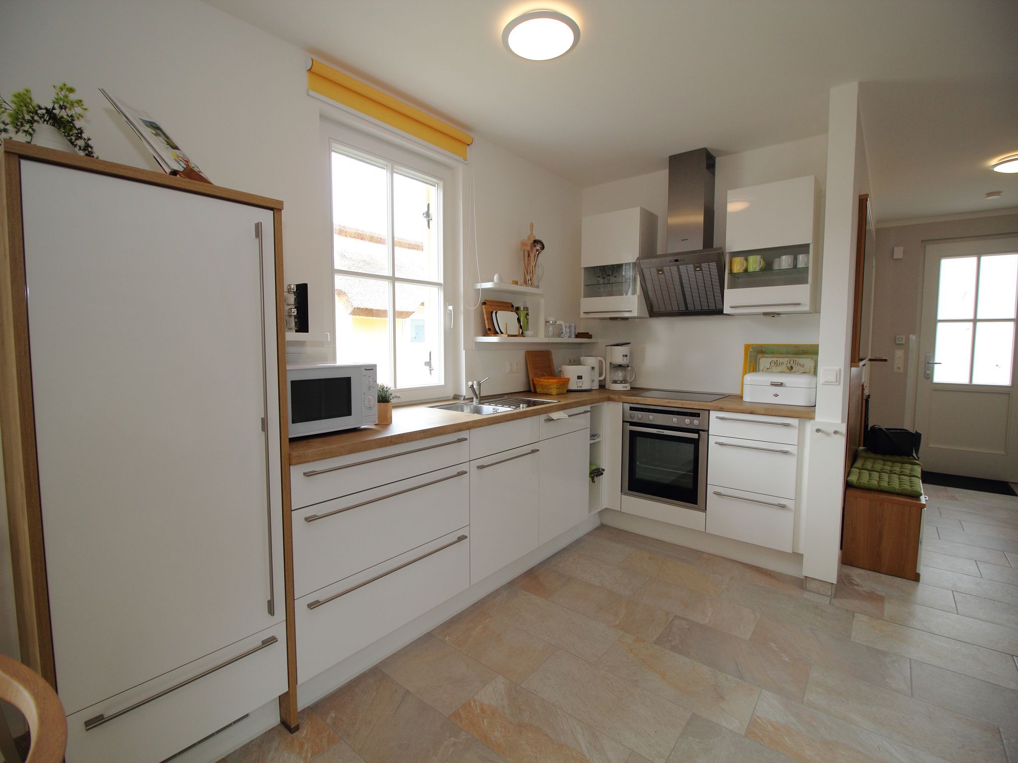 • eine hochwertig ausgestattete große Küche, Ceranherd mit Backofen, Geschirr­spüler, Mikrowelle, großer Kühlschrank mit Ge­frier­fach, Kaf­fee­ma­schi­ne, Mixer, Toaster und Wasserkocher, sowie alle notwendigen Utensilien und viele Extras (z. B. Kindergeschirr, Kinderbesteck).
