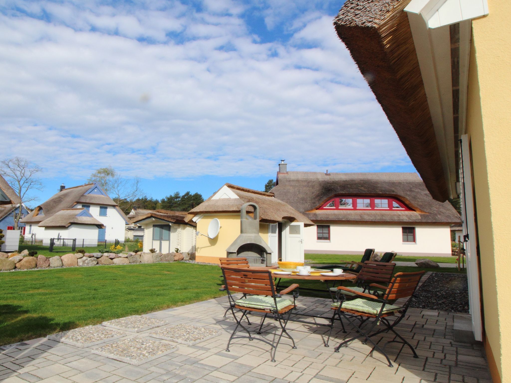 • 1 Strandkorb, Gar­ten­liegen, Gartentisch, 5 Gar­ten­stühle, 1 hochwertiger Holzkohlen-Grill, 1 großer Son­nen­schirm, für Kinder 1 Bol­ler­wagen, Federballspiel.