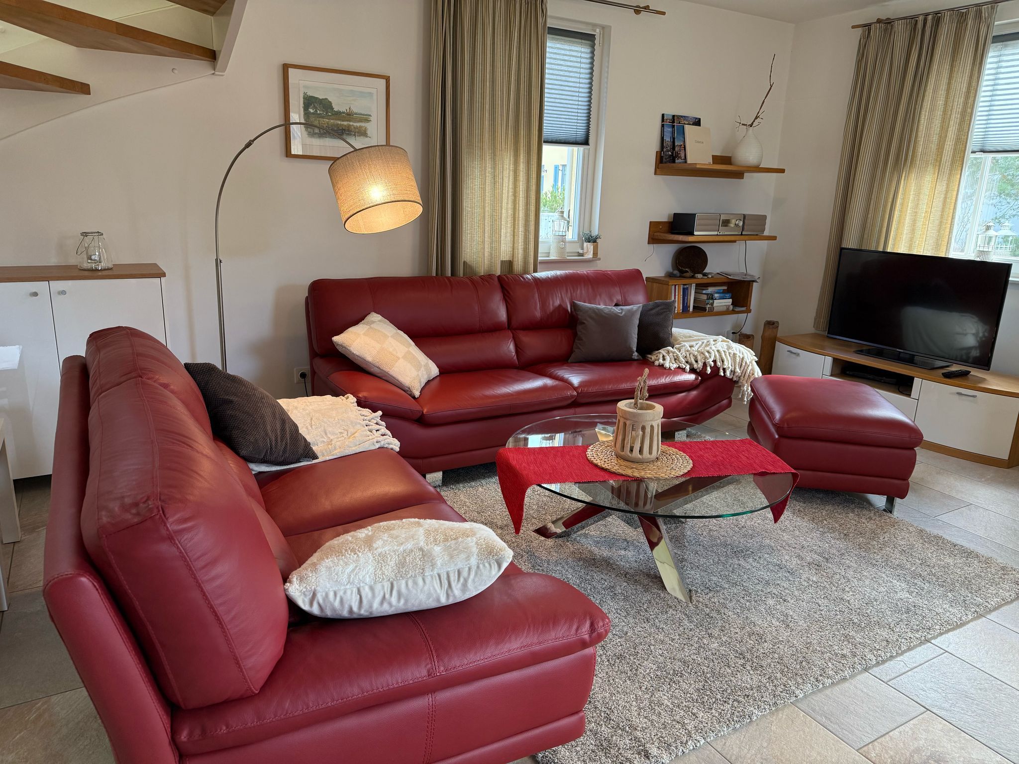 exklusive Ausstattung im Wohn- und Essbereich. Dazu gehören ein Kaminofen, ein Flachbild-Fernseher, ein Blu-Ray-Player, eine Musikanlage mit Radio und Gesellschaftsspiele