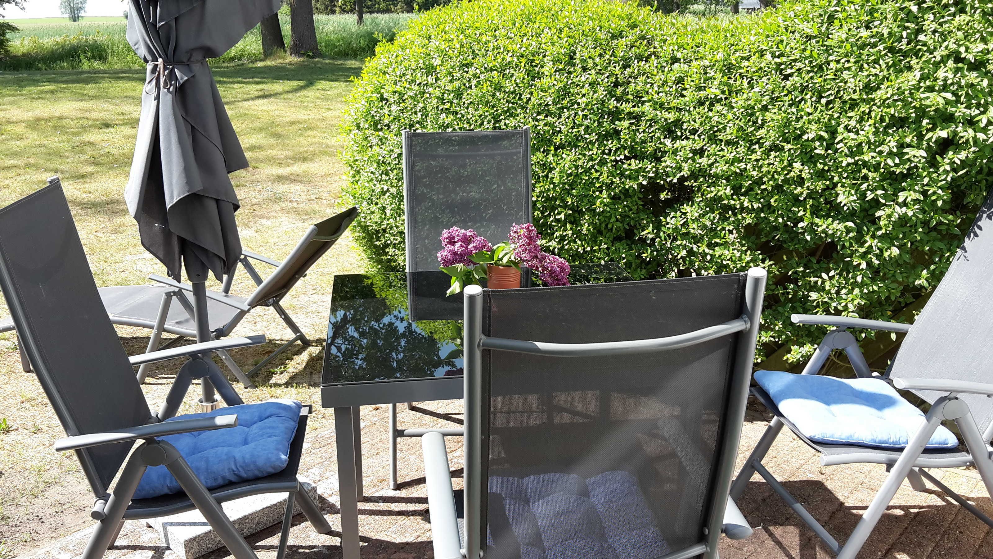 Zur Wohnung gehört eine Terrasse mit Sitzgruppe. Fahrräder können im Ort entliehen werden.