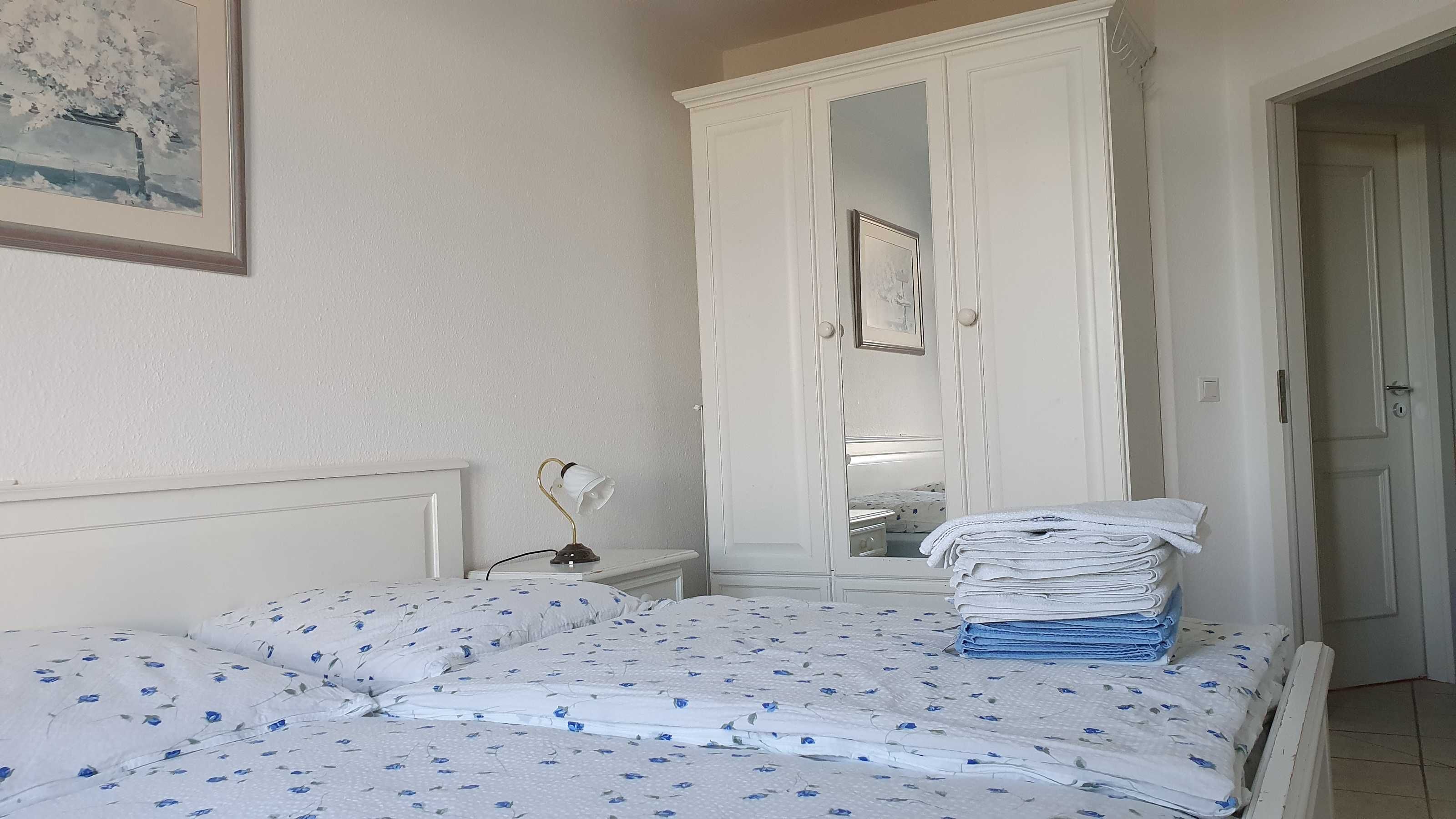 Das Schlafzimmer besitzt als Möblierung ein Doppelbett mit Nachttischen und Wäscheschrank.