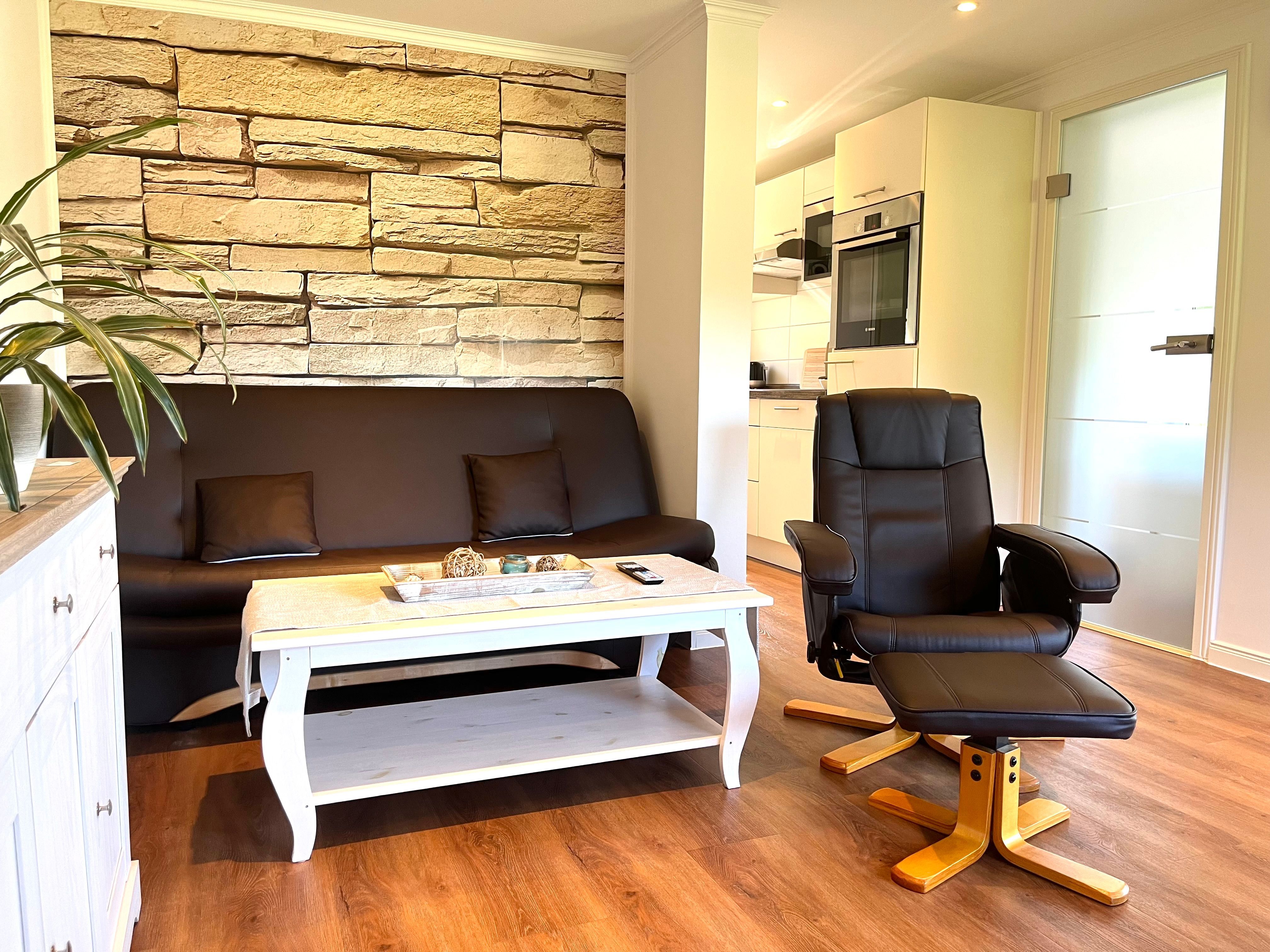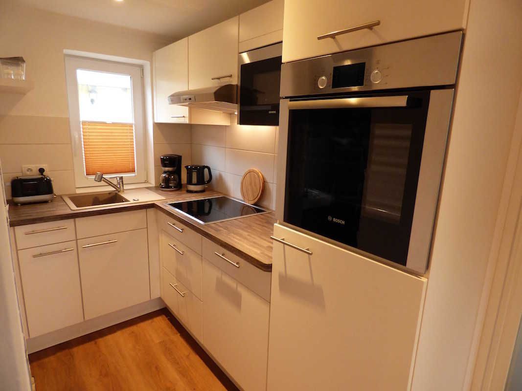 Die hochwertige offene Küche hält für Sie Umluftbackofen, Mikrowelle, Cerankochfeld, Spülmachine, Kühlschrank mit Gefriermöglichkeit, Wasserkocher, Toaster, Kaffeemaschine und viele Kleinutensilien bereit.