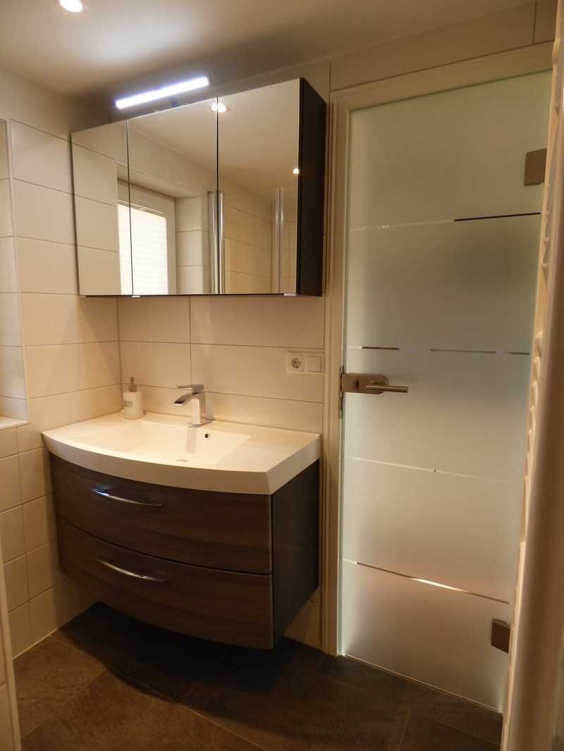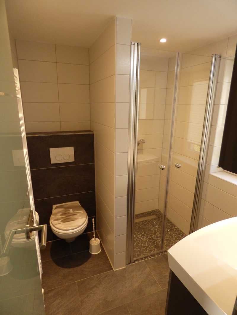 Unser modernes Bad verfügt über Tageslicht, ebenerdiger Dusche, Waschtisch und WC.