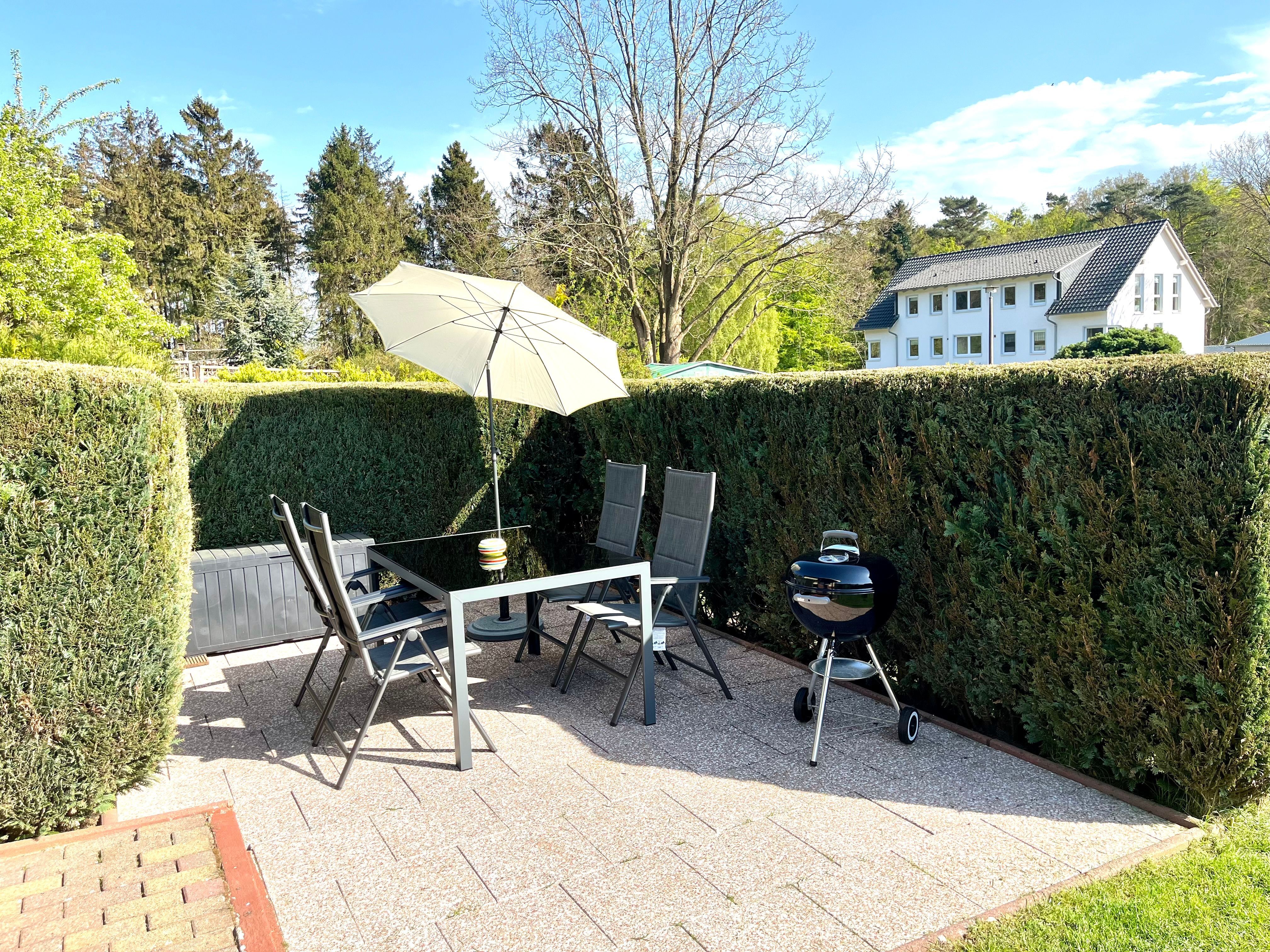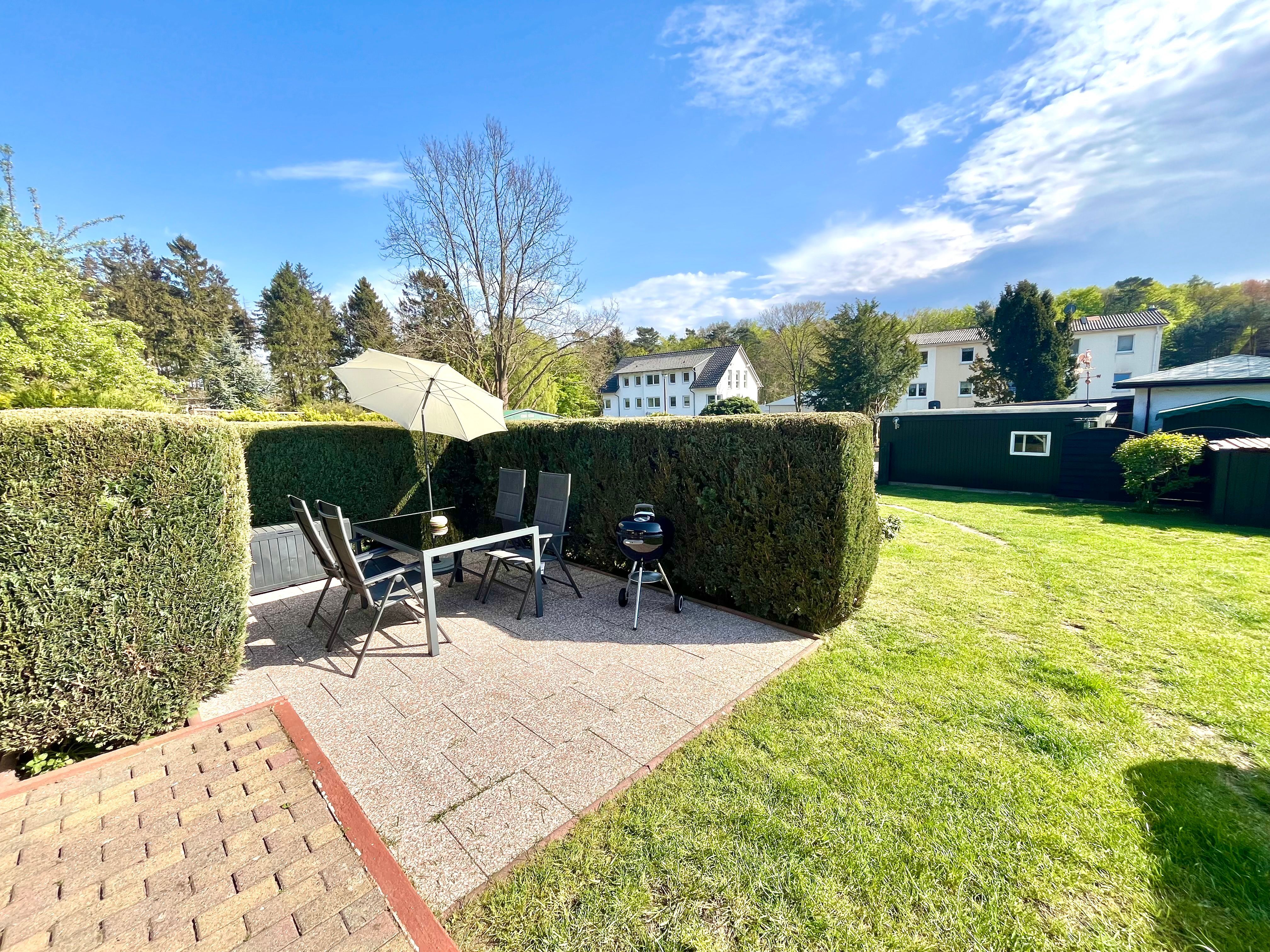 Das Grundstück (ca. 330 qm), auf welchem sich ein Strandkorb befindet, ist komplett umzäumt und eine gemütlichen Sitzecke mit Grillmöglichkeit lädt zum Verweilen ein.