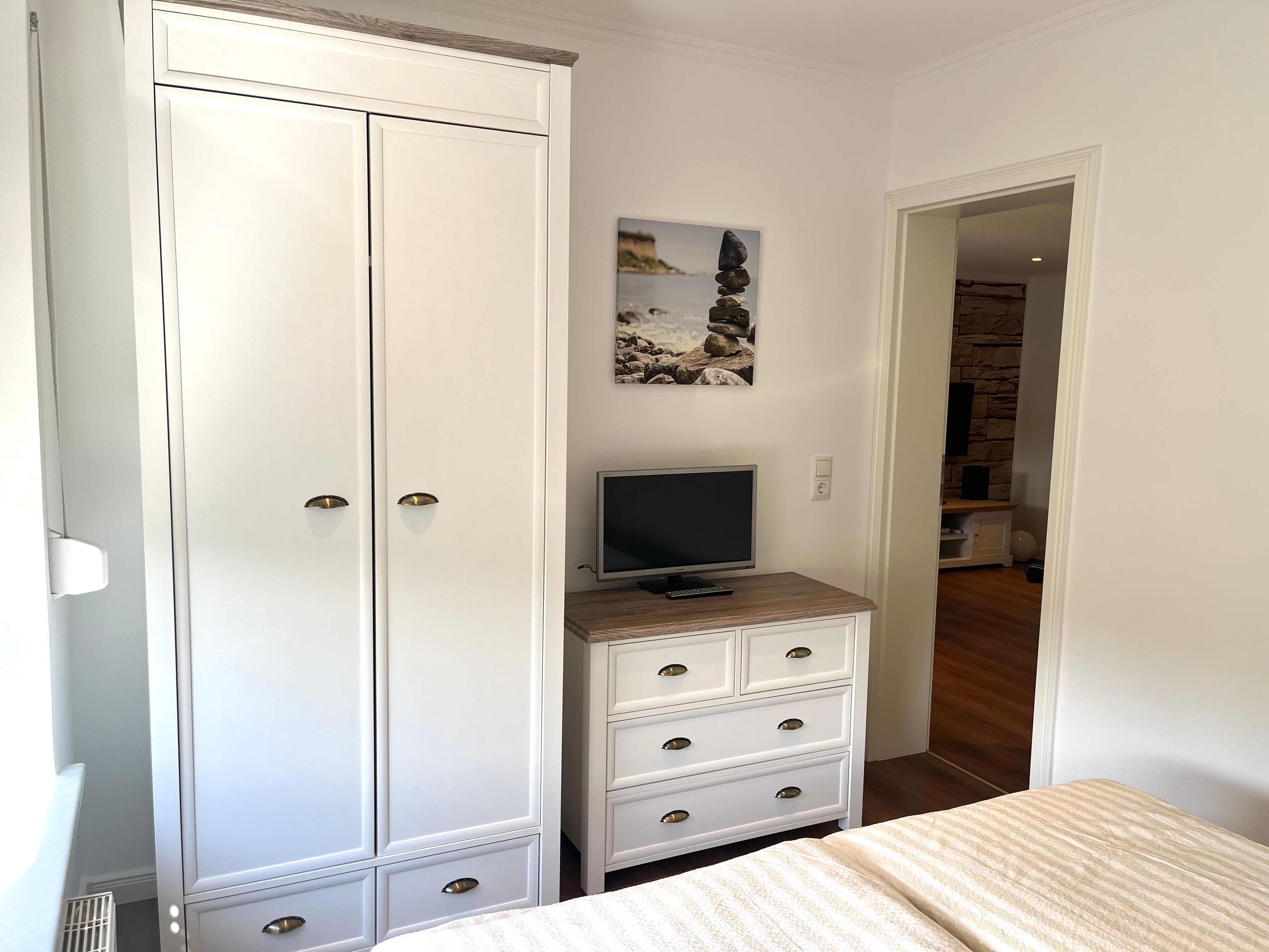 Das Schlafzimmer hat ein Doppelbett mit getrennten Matratzen (1,60 m x 2,00 m) und zusätzlich ist es mit einem LED-TV ausgestattet.
