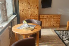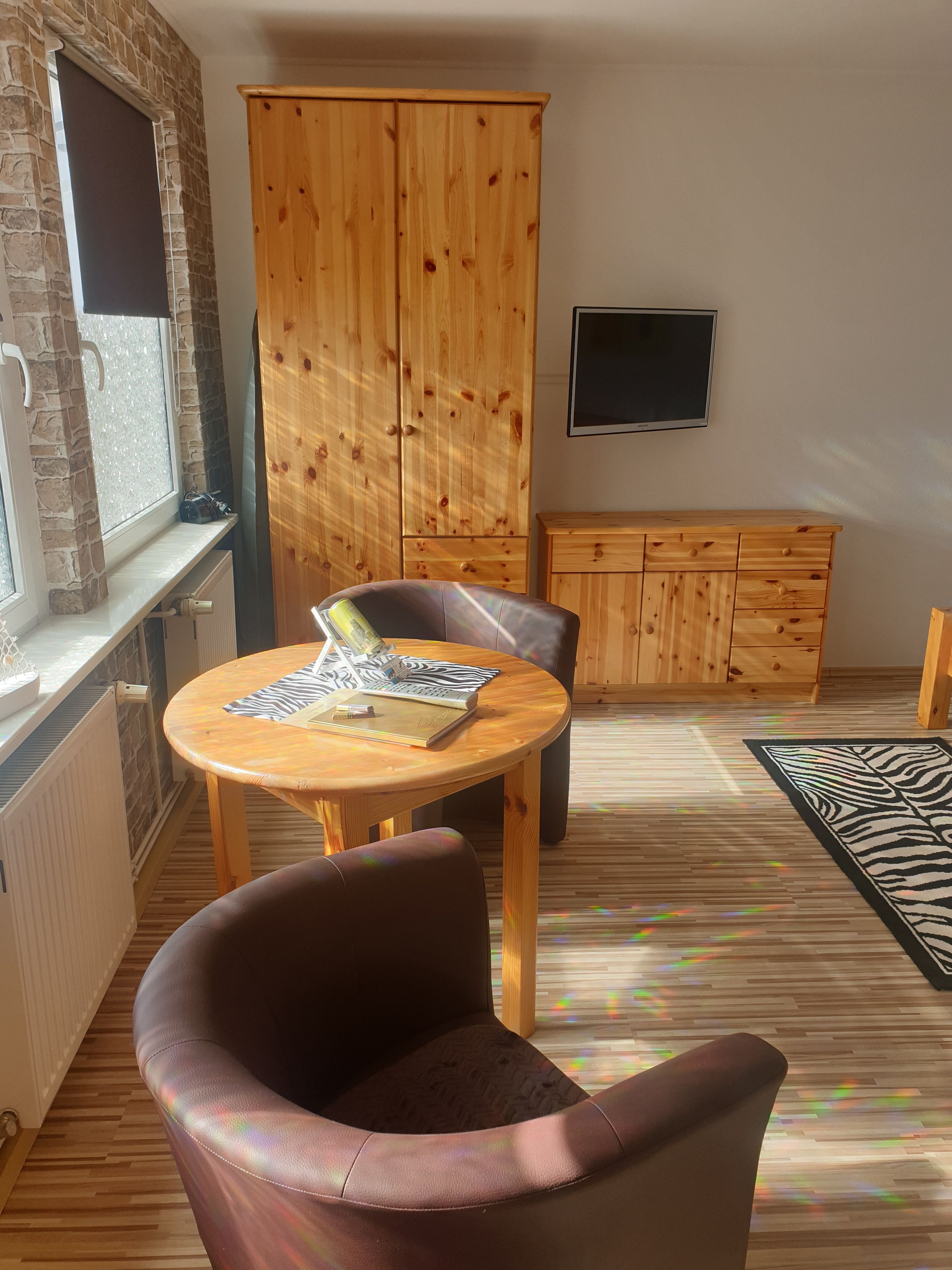 Weiterhin bietet die Fewo eine Sitzgruppe, einen Flachbild-Fernseher und genügend Stauraum.