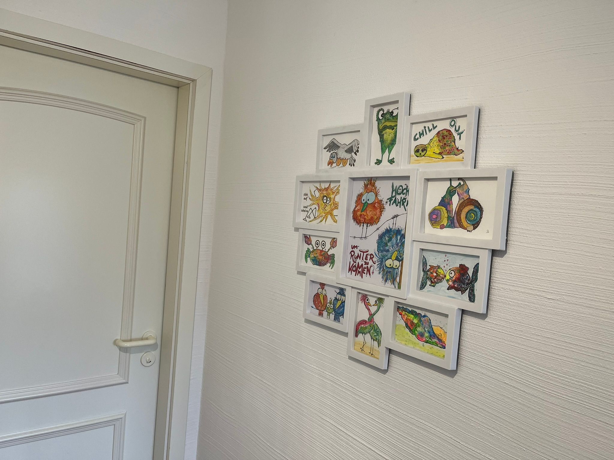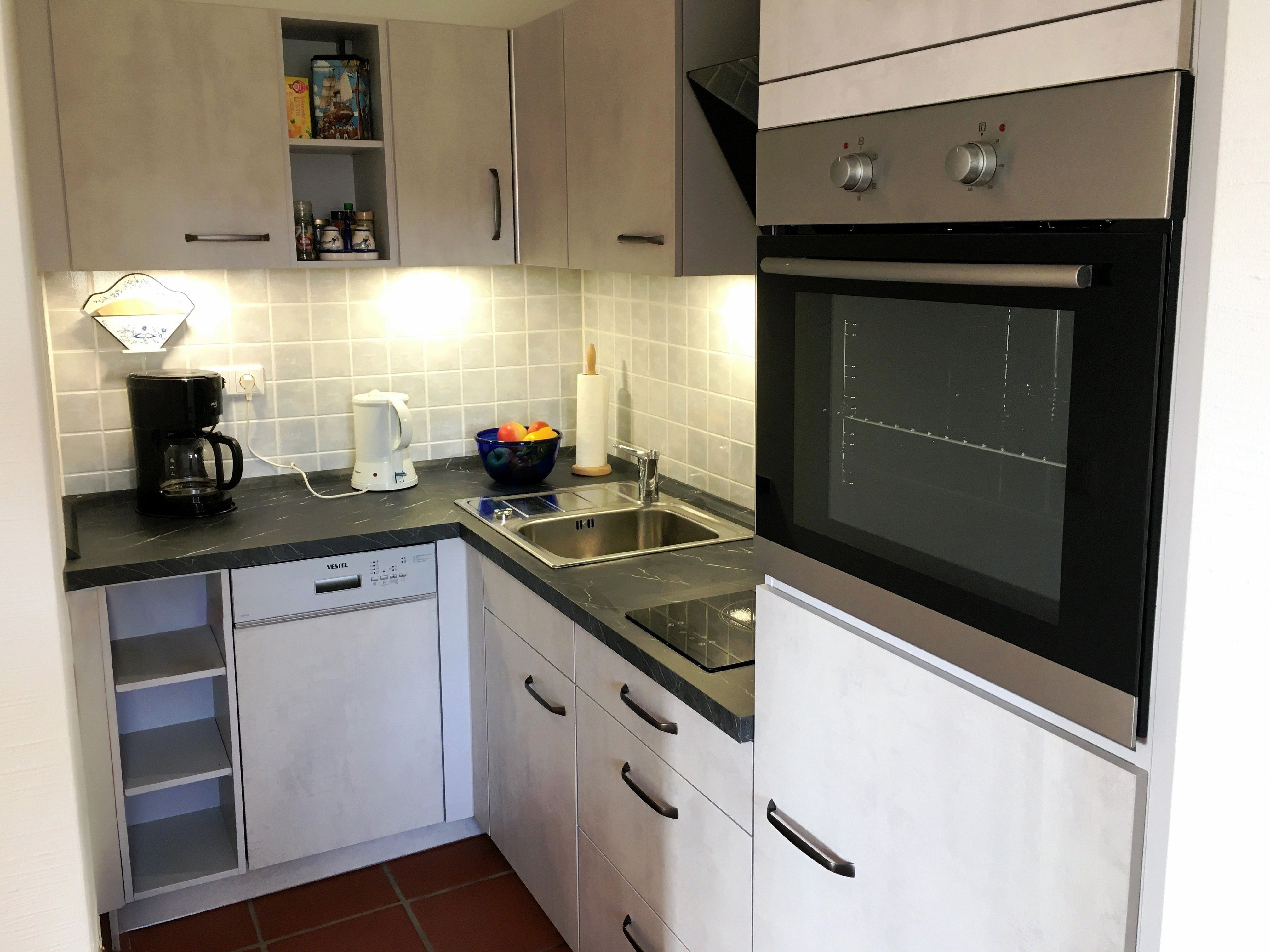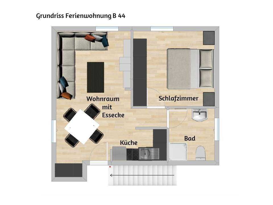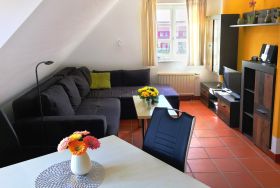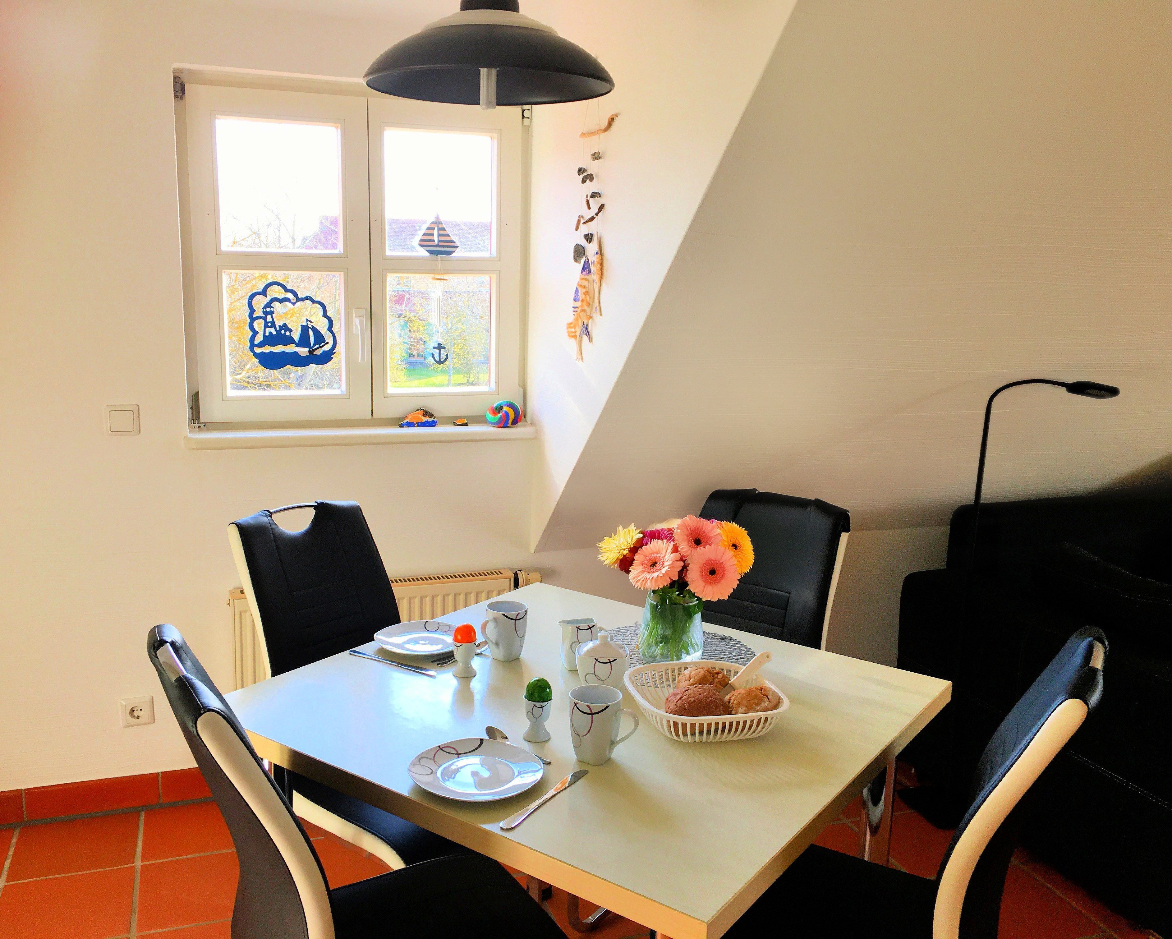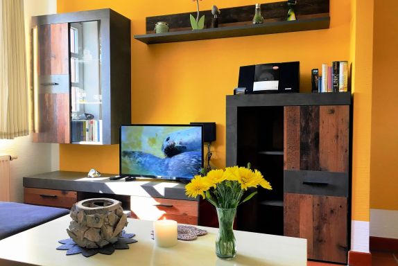 • Die Zweiraumwohnung besteht aus einem großen Wohnraum und einem Schlafzimmer. Der Wohnraum ist mit einer großen, gemütlichen Eckcouch, die ausgezogen ein geräumiger Schlafplatz für 2 Personen ist, einer Essecke sowie angrenzender Küchenzeile ausgestattet. Fernseher, CD-Player und    WLAN sind vorhanden. In der Miniküche stehen Kühlschrank mit Gefrierfach, Herd, Geschirrspüler, Backofen, Kaffeemaschine, Wasserkocher, Toaster und Eierkocher zur Verfügung.