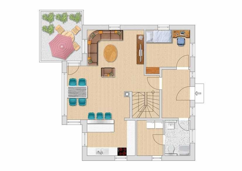 Allgemein:Einfamilienhaus, 124 qm Wohnfläche, 5 Zimmer, 4 Schlafzimmer, 2 Bäder, 405 qm Grundstück eingezäunt, Gasbrennwerttherme, Solare Warmwasserbereitung, Fußbodenheizung in allen Räumen, Kaminofen, Sauna, Waschmaschine, Trockner, 2 PKW Stellplätze, Gartenhaus, 37 qm Terrasse (Südausrichtung), Internet, Sat-TV, Darßtypische Architektur mit Fledermausgaube, Darßveranda, Süd-Balkon.