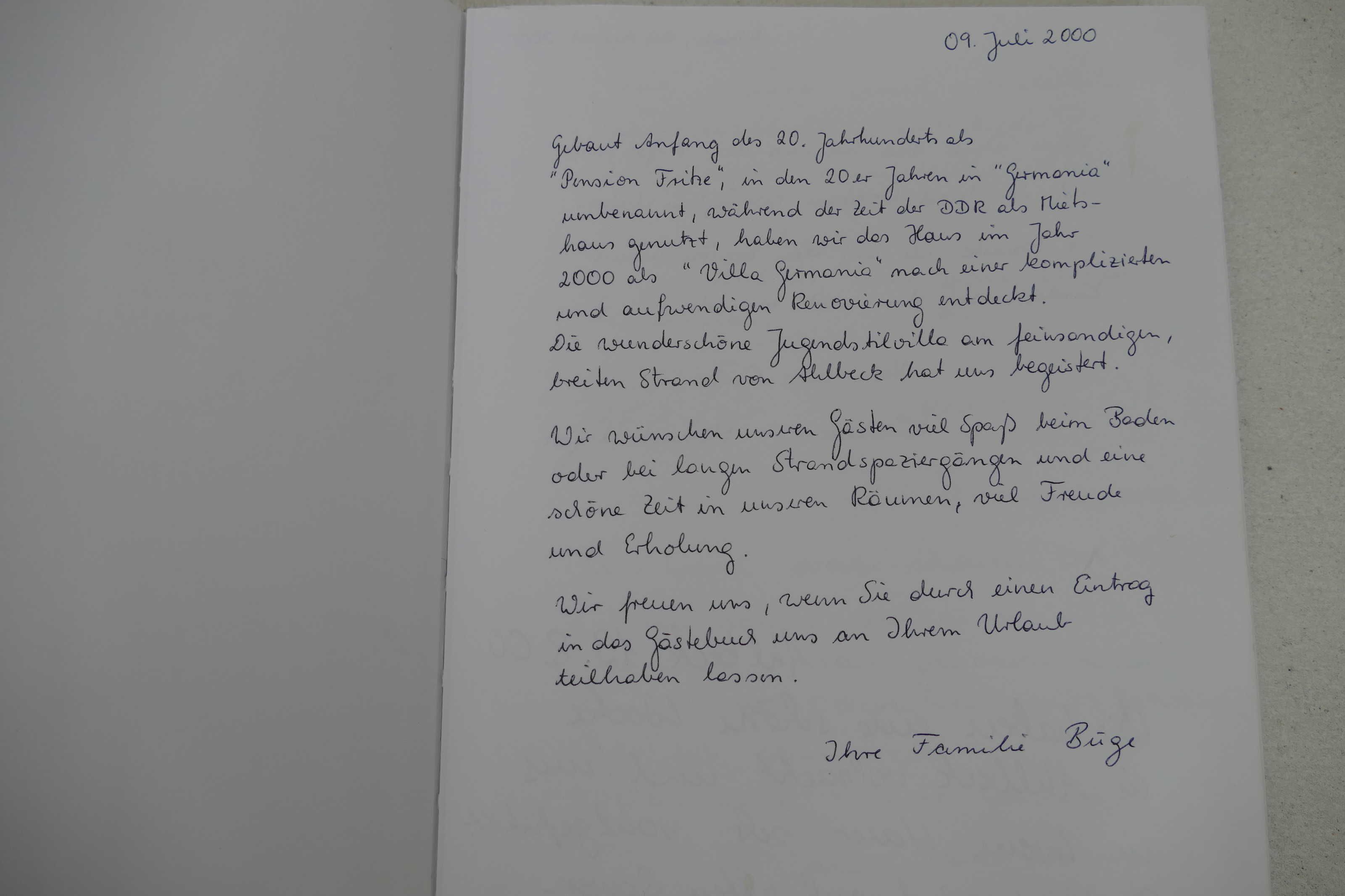 Die Jugendstilvilla Germania mit 3 Türmchen, befindet sich direkt am Strand und ist eines der schönsten denkmalgeschützten Häuser der Bäderarchitektur auf Usedom. Das Haus liegt ruhig an der Strandpromenade des Seebades Heringsdort im Ortsteil Ahlbeck beim Ostender Tor. Die Promenade mit Radweg verbindet die Kaiserbäder mit dem 5 km entfernten Zentrum von Swinemünde.