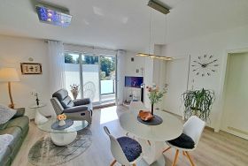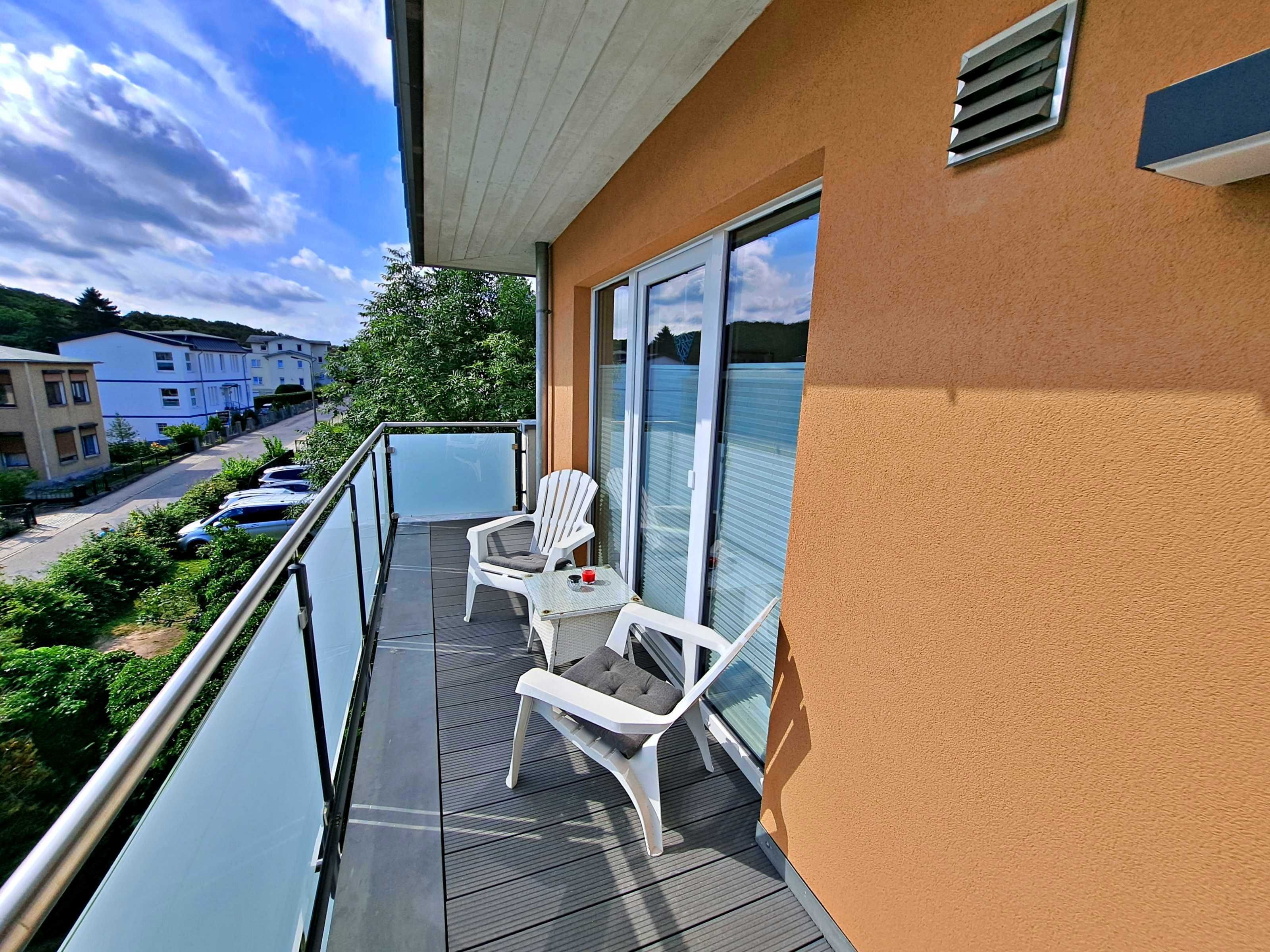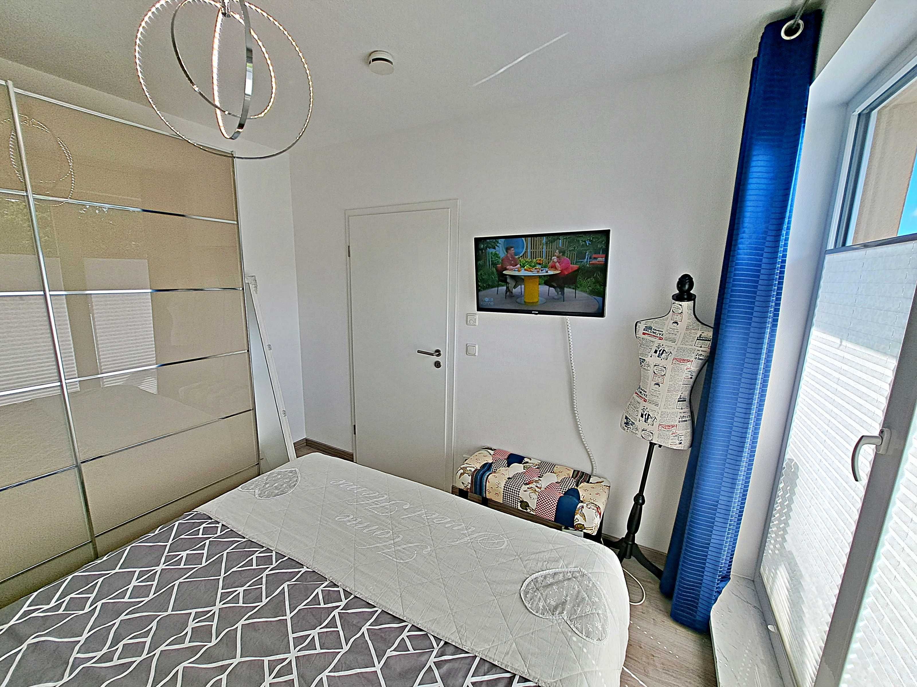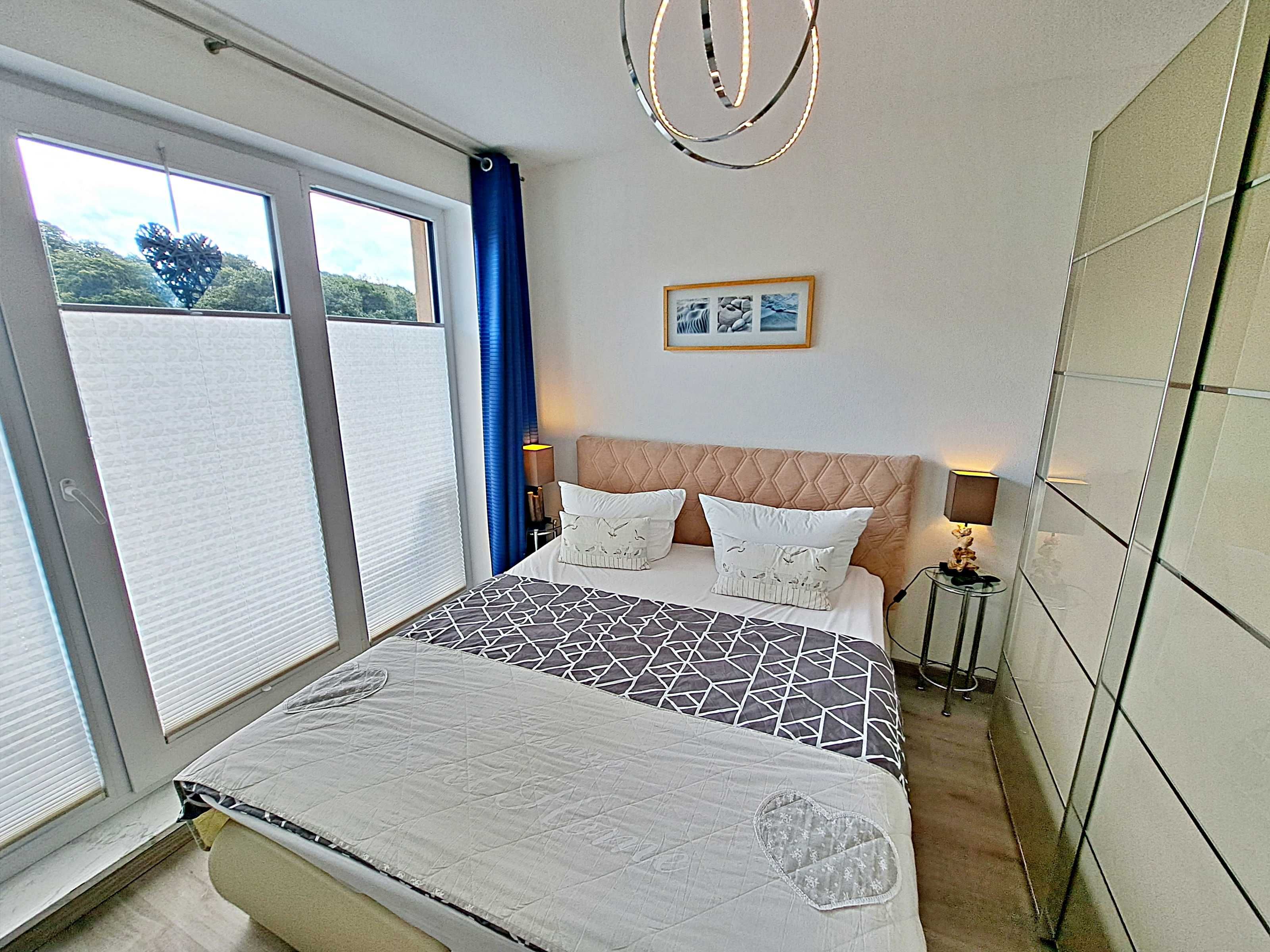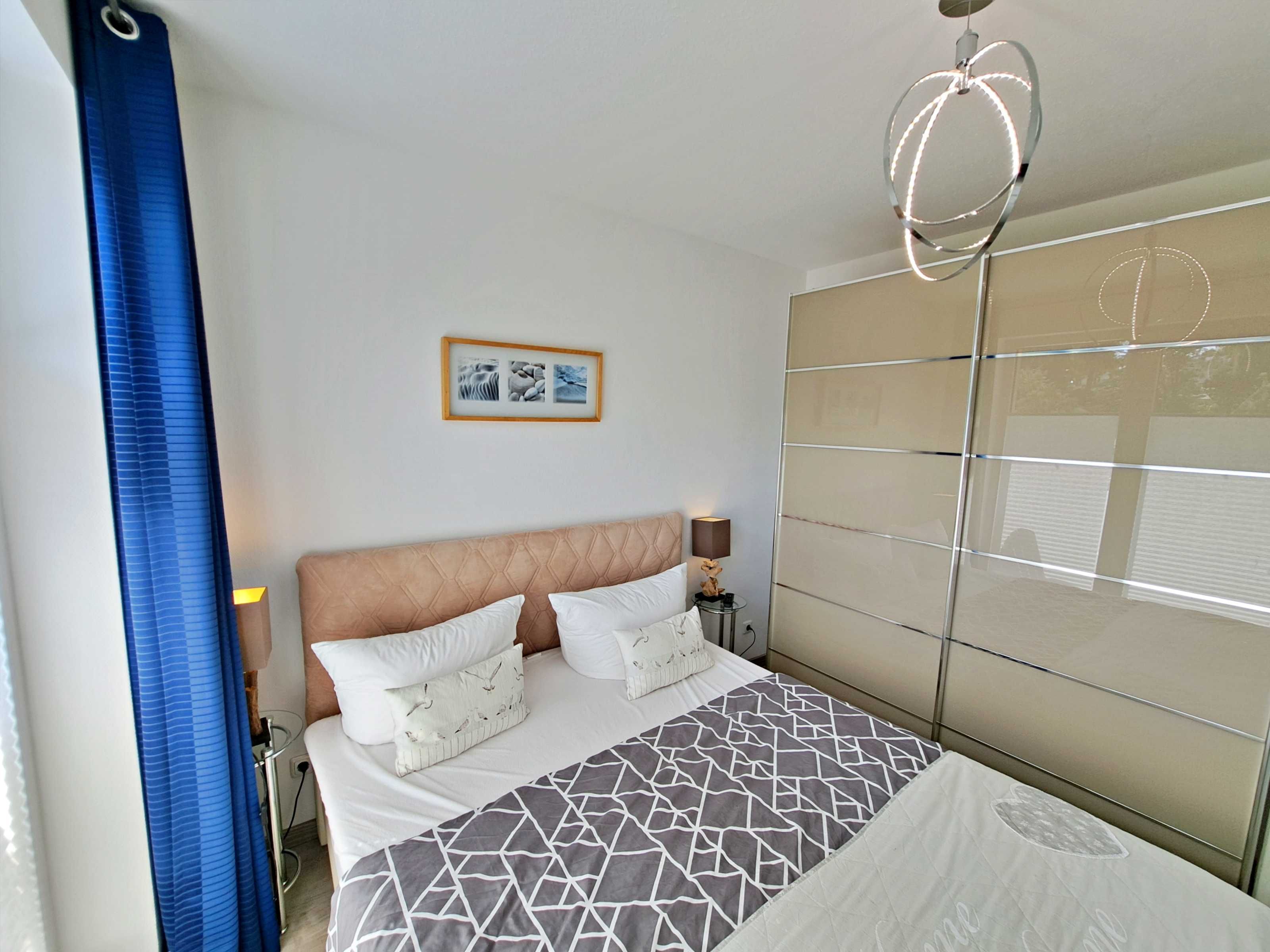 Im Schlafzimmer erwartet Sie ein komfortables Boxspringbett (1,60 m x 2,00 m), ein Kleiderschrank, der Ihnen genügend Platz für Ihre persönlichen Sachen bietet und ebenfalls ein Flachbild-TV. Von sowohl dem Wohn- als auch dem Schlafzimmer aus gelangen Sie auf den möblierten Süd-Ost-Balkon, wo Sie die Sonne genießen können. Das moderne Duschbad mit ebenerdiger Glasdusche, Waschtisch, WC und elektrisch betriebenem Handtuchtrockner rundet das Angebot ab. Alle Räume sind mit Fußbodenheizung ausgestattet, damit Sie sich rundum wohlfühlen.