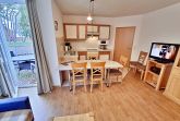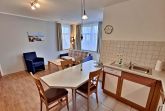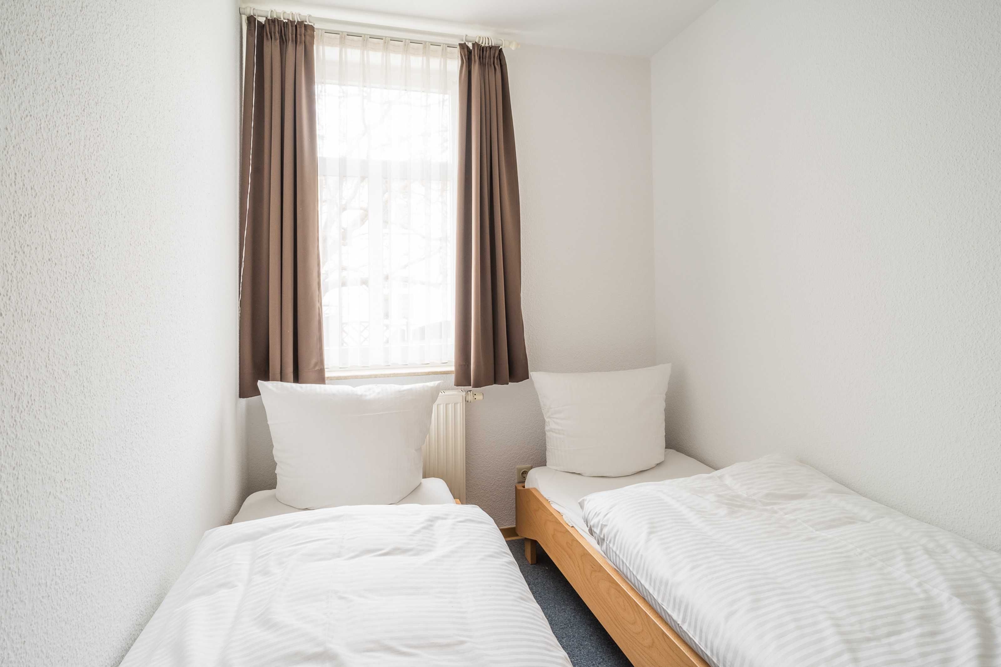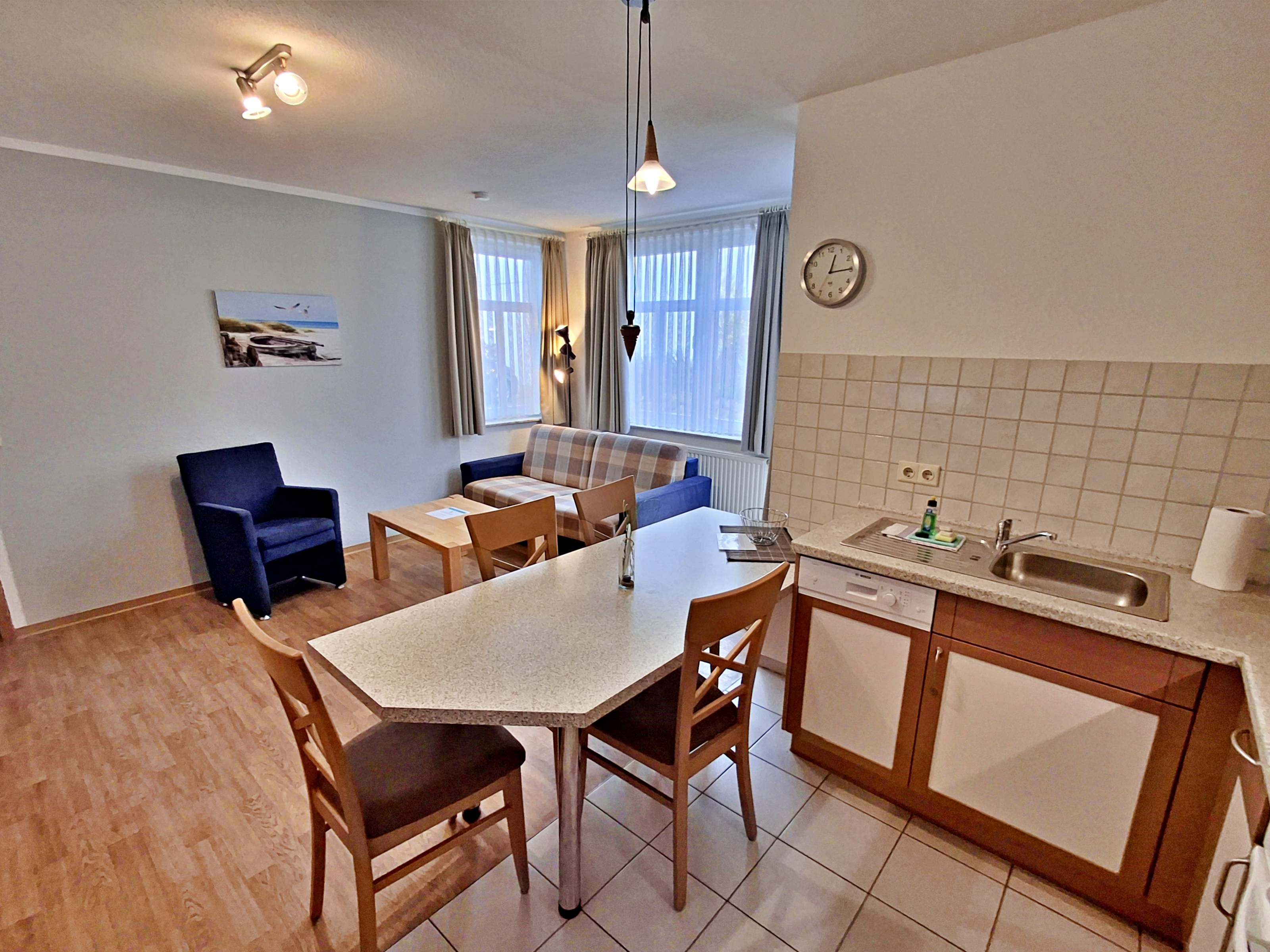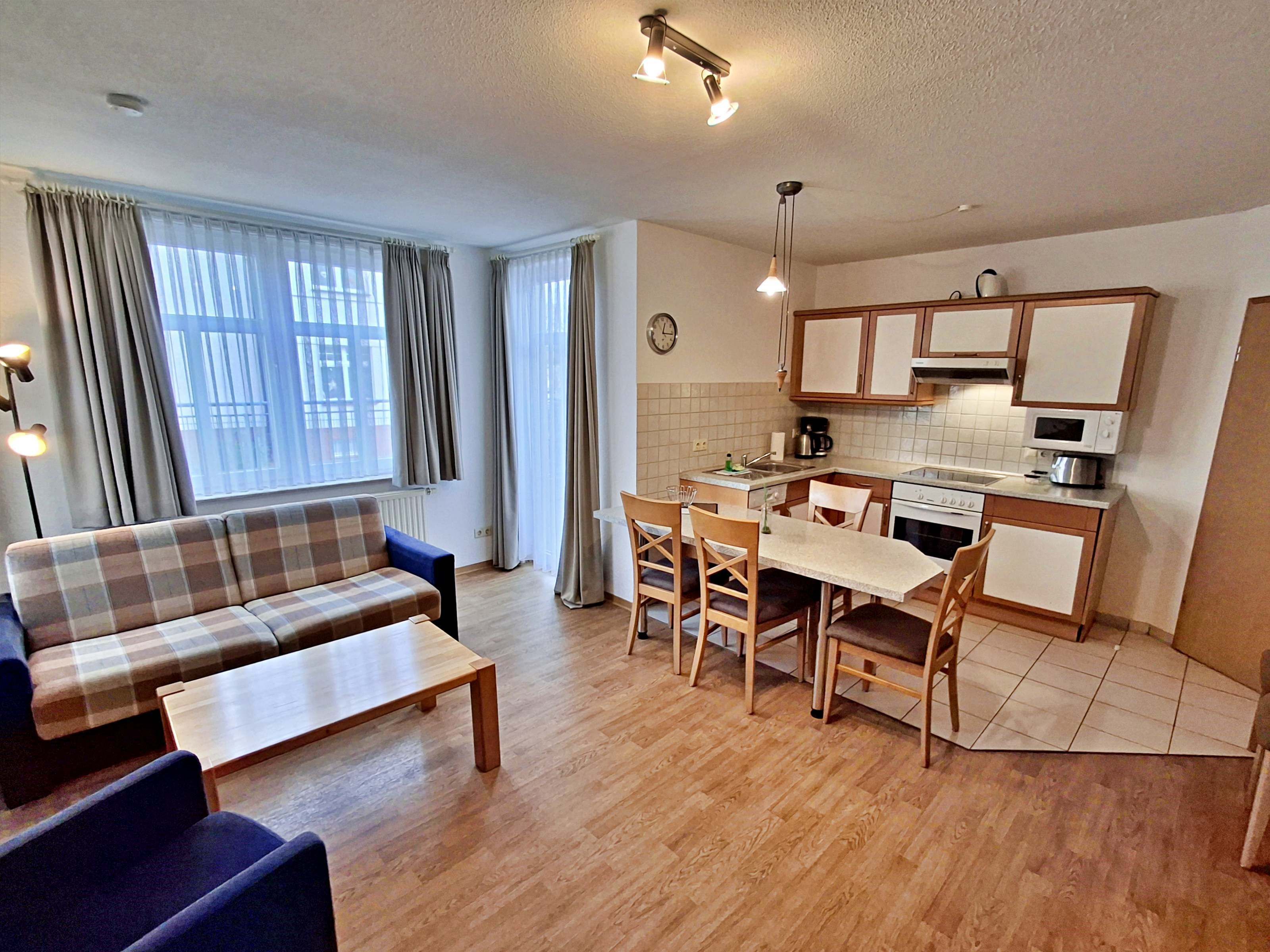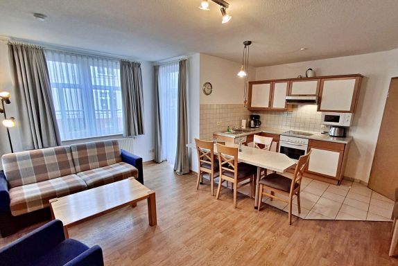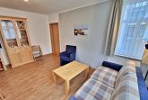 Die charmante 3-Zimmer-Wohnung Heringsdorf mit Terrasse für max. 4 Erwachsene und 1 Kleinkind bis 3 Jahre befindet im Haus am Kurpark - nur wenige Schritte von der Promenade und dem Strand entfernt. Im Wohnbereich befinden sich neben der gemütlichen Couch auch ein Sessel sowie ein Esstisch mit 4 Stühlen, der genügend Platz für 4 Personen bietet. Vom Wohnbereich aus gelangen Sie auf die Terrasse, welche sich zur Hofseite gelegen befindet. Hier können Sie bei schönem Wetter bereits morgens Ihren Kaffee genießen oder den Abend bei einem Glas Wein ausklingen lassen können. Die moderne Küchenzeile mit Ceranherd, Backofen, Geschirrspüler, Mikrowelle, Kaffeemaschine, Wasserkocher und Toaster lässt keine Wünsche offen. Für die Unterhaltung sorgen ein Flachbild-TV, Radio-CD-Player und kostenfreies W-LAN. Das 1. Schlafzimmer verfügt über ein Doppelbett und das zweite Schlafzimmer über 2 Einzelbetten. Das Badezimmer hat DU/WC.
