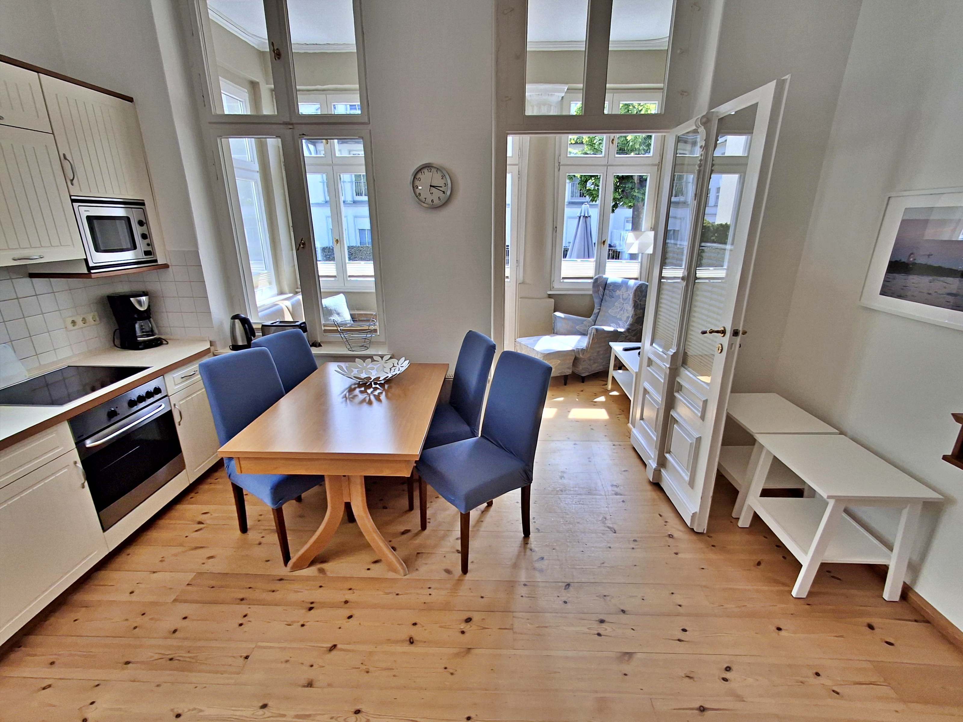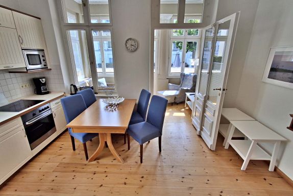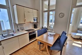 Die gemütliche 2,5 Zimmer-Wohnung Boltenhagen mit Terrasse für max. 3 Erwachsene und 1 Kleinkind bis 3 Jahre befindet sich in der stilvoll restaurierten Villa Ahlbeck - nur wenige Schritte von der Promenade und dem Strand entfernt. Die moderne Küchenzeile mit Ceranherd, Backofen, Geschirrspüler, Mikrowelle, Kaffeemaschine, Wasserkocher und Toaster lässt keine Wünsche offen. Bei schlechtem Wetter bietet der Esstisch mit 4 Stühlen genügend Platz für das Frühstück. Die absoluten Highlights der Wohnung sind die Veranda mit Couch (Aufbettungsmöglichkeit für 2 Personen) sowie die angrenzende Terrasse mit Süd-Ost-Ausrichtung. Auf der Terrasse können Sie bei herrlichstem Wetter schon morgens Ihren Kaffee genießen oder den Abend bei einem Glas Wein ausklingen lassen. Für die Unterhaltung sorgen ein Flachbild-TV, Radio-CD-Player und kostenfreies W-LAN. Das Schlafzimmer verfügt über ein Doppelbett und das Badezimmer hat DU/WC.