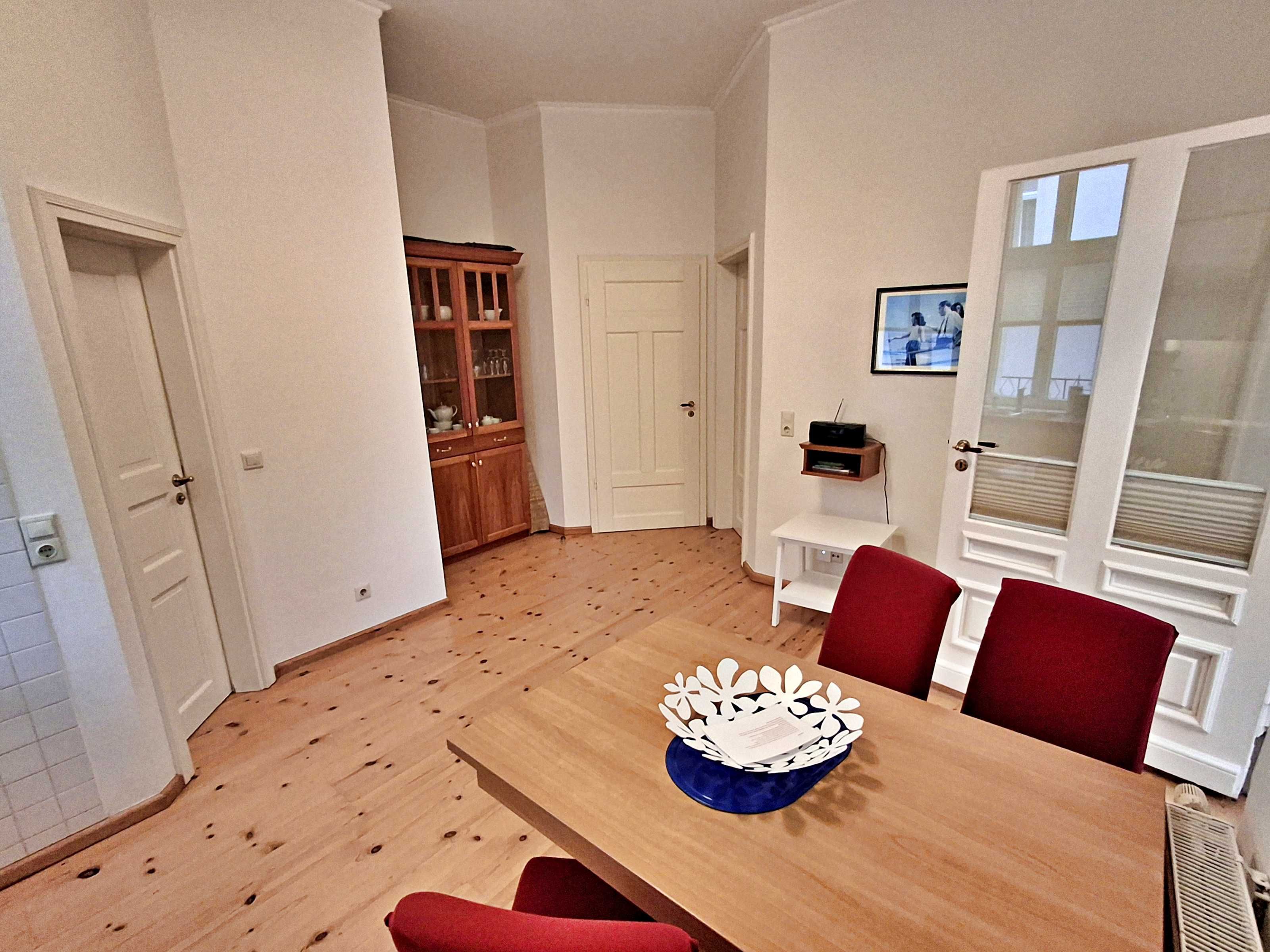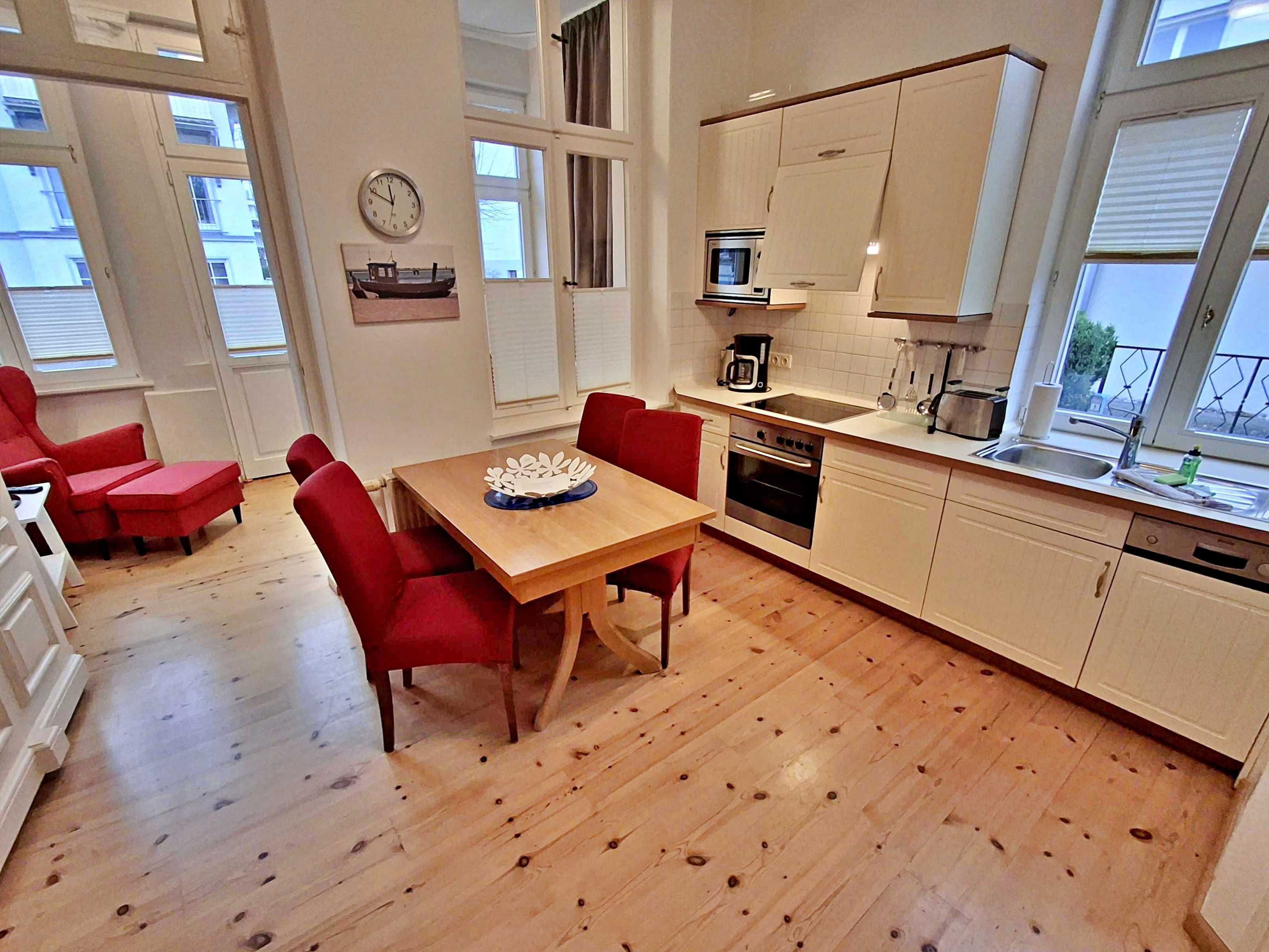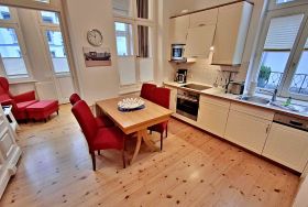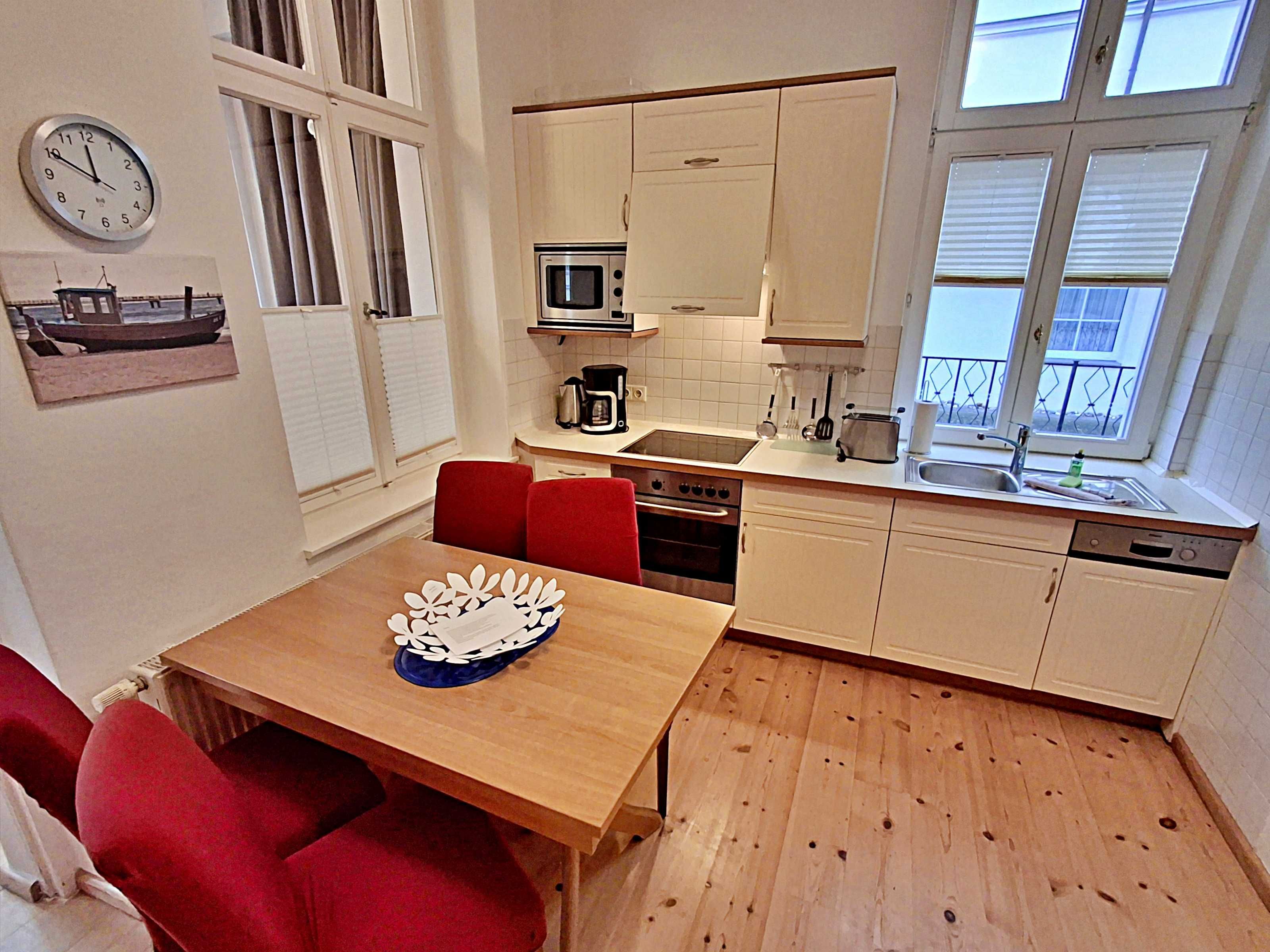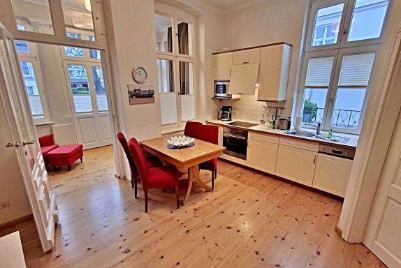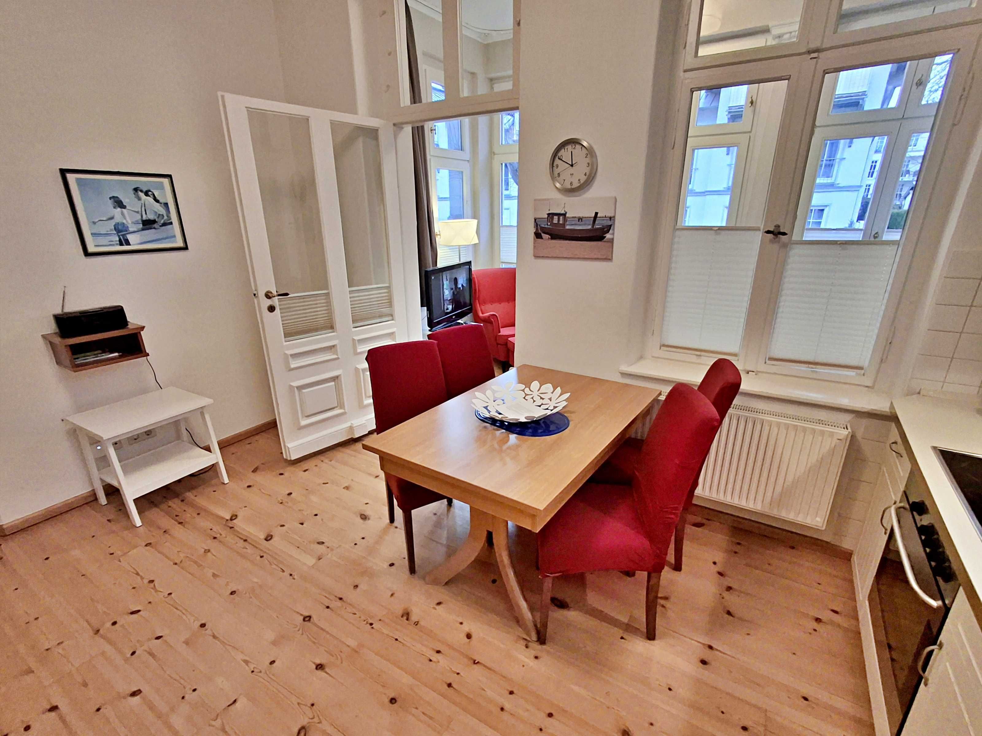 Die helle und freundliche 2,5 Zimmer-Wohnung Rerik mit Terrasse für max. 3 Erwachsene und 1 Kleinkind bis 3 Jahre befindet sich in der stilvoll restaurierten Villa Ahlbeck - nur wenige Schritte von der Promenade und dem Strand entfernt. Die moderne Küchenzeile mit Ceranherd, Backofen, Geschirrspüler, Mikrowelle, Kaffeemaschine, Wasserkocher und Toaster lässt keine Wünsche offen. Bei schlechtem Wetter bietet der Esstisch mit 4 Stühlen genügend Platz für das Frühstück. Die absoluten Highlights der Wohnung sind die Veranda mit Couch (Aufbettungsmöglichkeit für 2 Personen) sowie die angrenzende Terrasse mit Süd-Ost-Ausrichtung. Auf der Terrasse können Sie bei herrlichstem Wetter schon morgens Ihren Kaffee genießen oder den Abend bei einem Glas Wein ausklingen lassen. Für die Unterhaltung sorgen ein Flachbild-TV, Radio-CD-Player und kostenfreies W-LAN. Das Schlafzimmer verfügt über ein Doppelbett und das Badezimmer hat DU/WC.