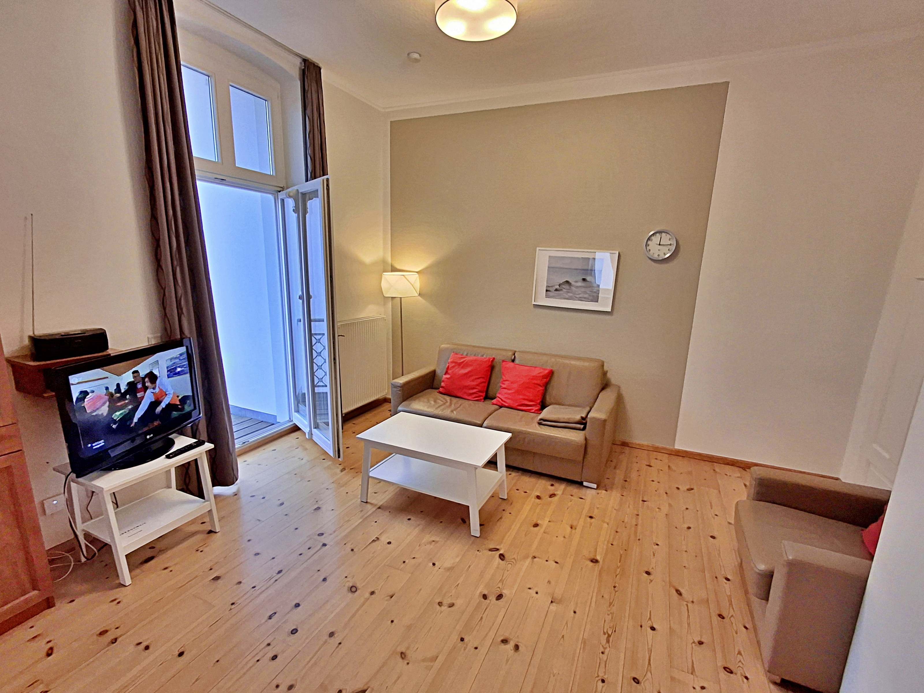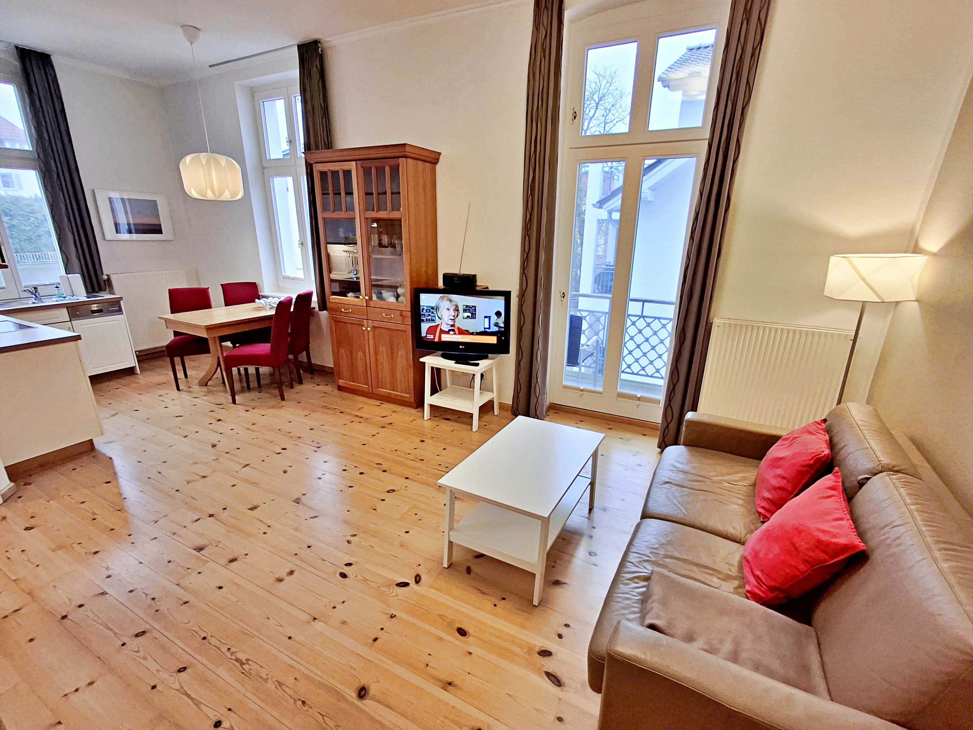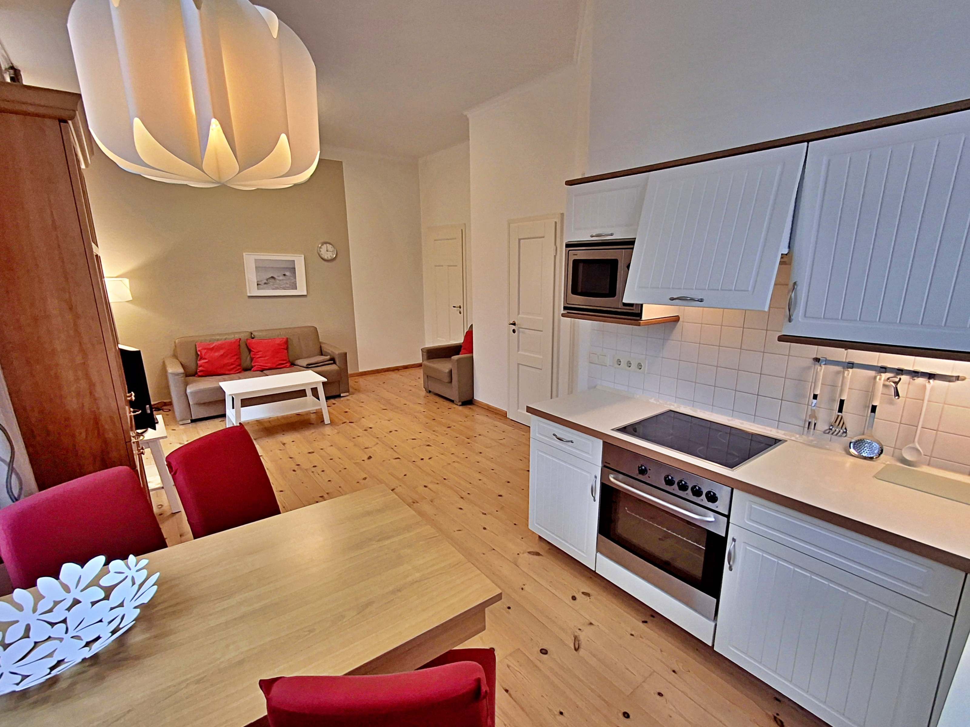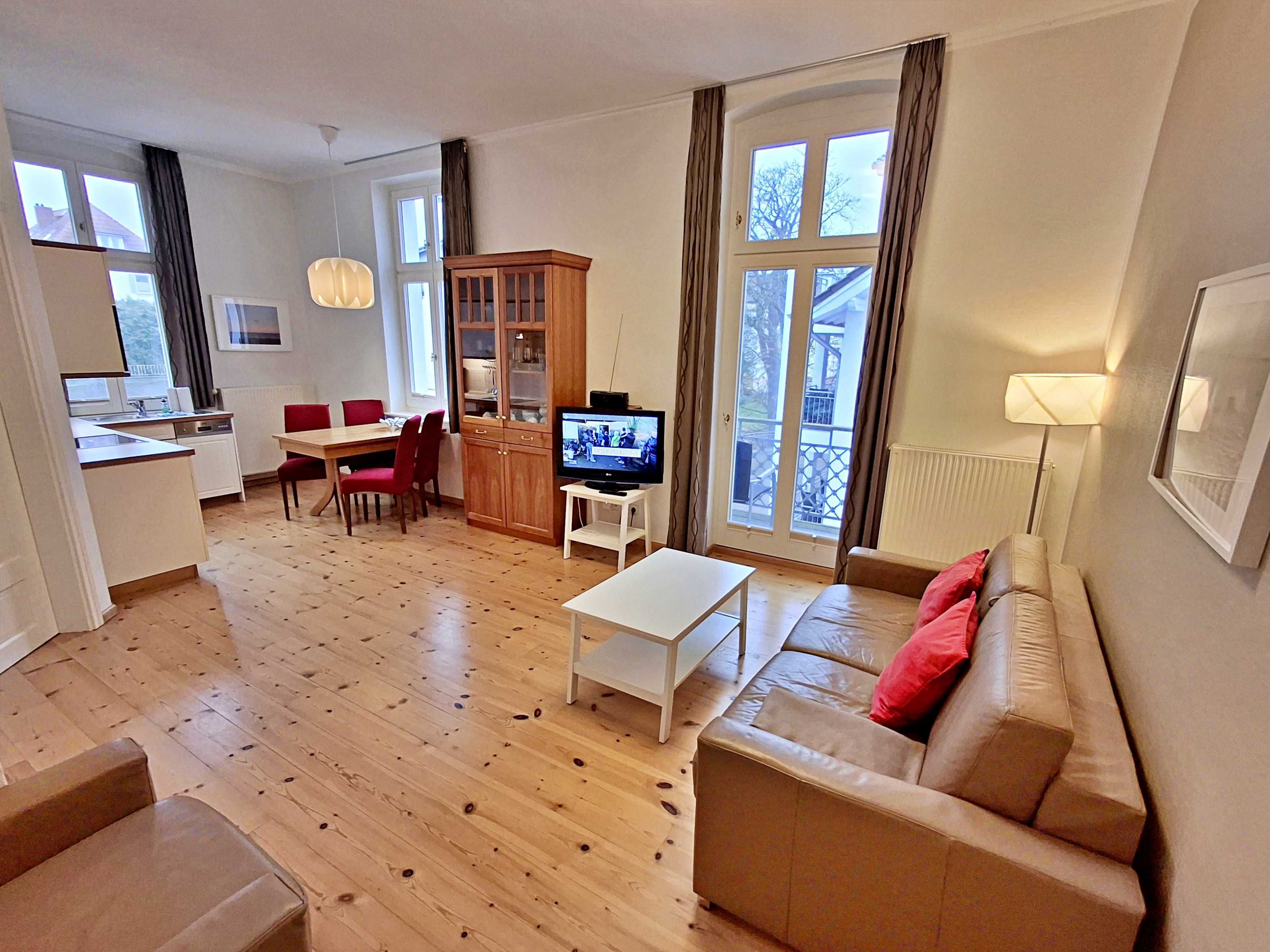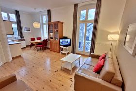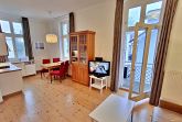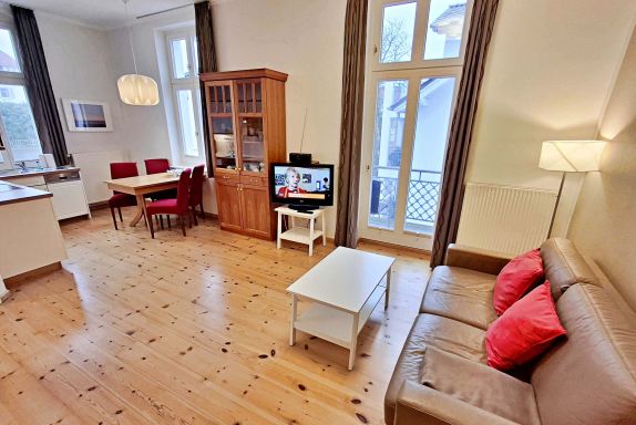 Die schöne 2-Zimmer-Wohnung Dierhagen mit Balkon im 1. Obergeschoss für max. 3 Erwachsene und 1 Kind bis 8 Jahre befindet sich in der stilvoll restaurierten Villa Ahlbeck - nur wenige Schritte von der Promenade und dem Strand entfernt. Im hellen Wohnbereich befinden sich neben einer gemütlichen Couch (Aufbettungsmöglichkeit für 2 Personen) auch ein Esstisch mit 4 Stühlen, der genügend Platz für 4 Personen bietet. Das Highlight der Wohnung ist der Balkon in West-Ausrichtung. Hier können Sie bereits morgens Ihren Kaffee genießen oder den Abend bei einem Glas Wein ausklingen lassen. Die moderne Küchenzeile mit Ceranherd, Backofen, Geschirrspüler, Mikrowelle, Kaffeemaschine, Wasserkocher und Toaster lässt keine Wünsche offen. Für die Unterhaltung sorgen ein Flachbild-TV, Radio-CD-Player und kostenfreies W-LAN. Das Schlafzimmer verfügt über ein Doppelbett und das Badezimmer hat Badewanne/WC.