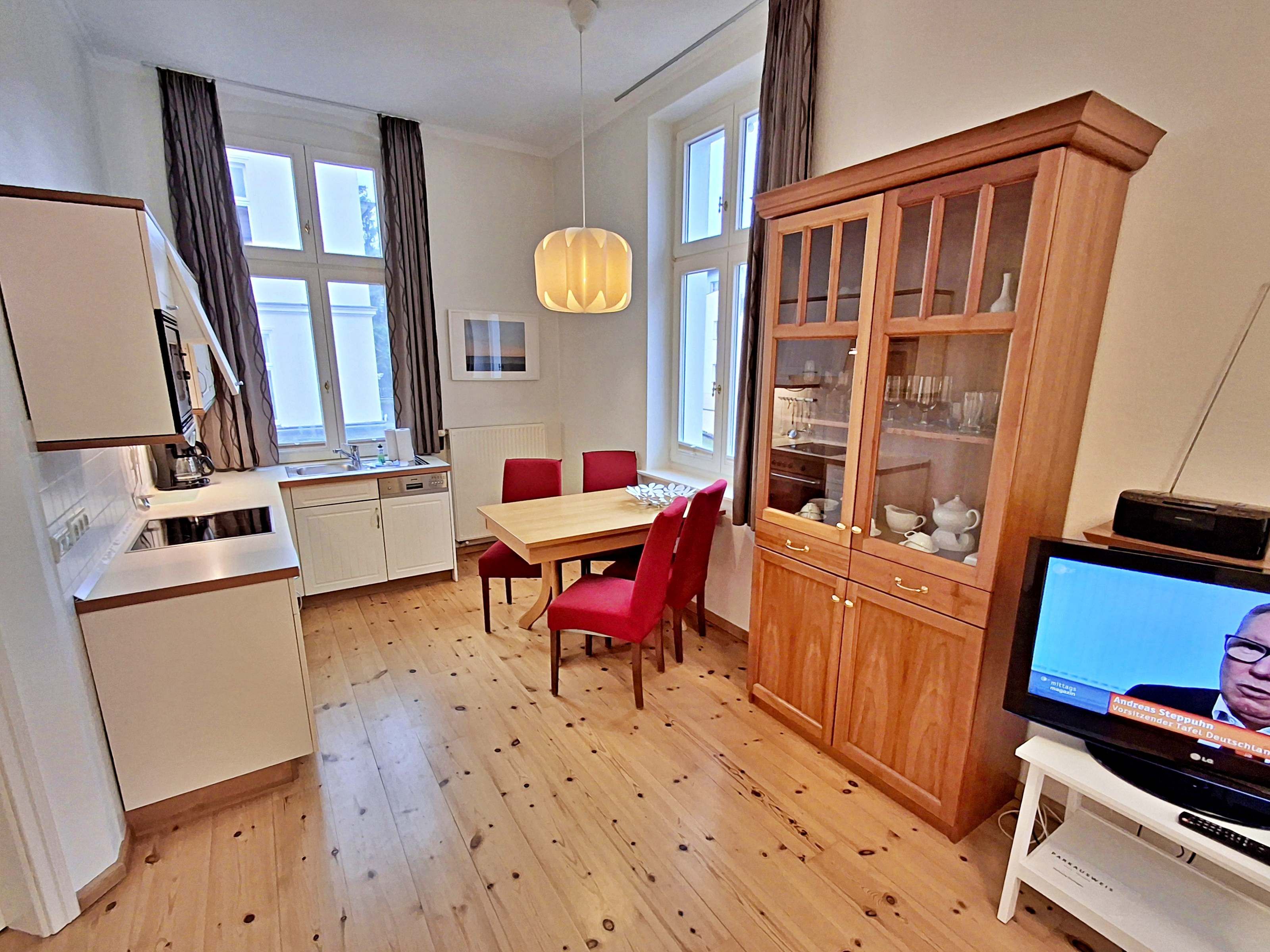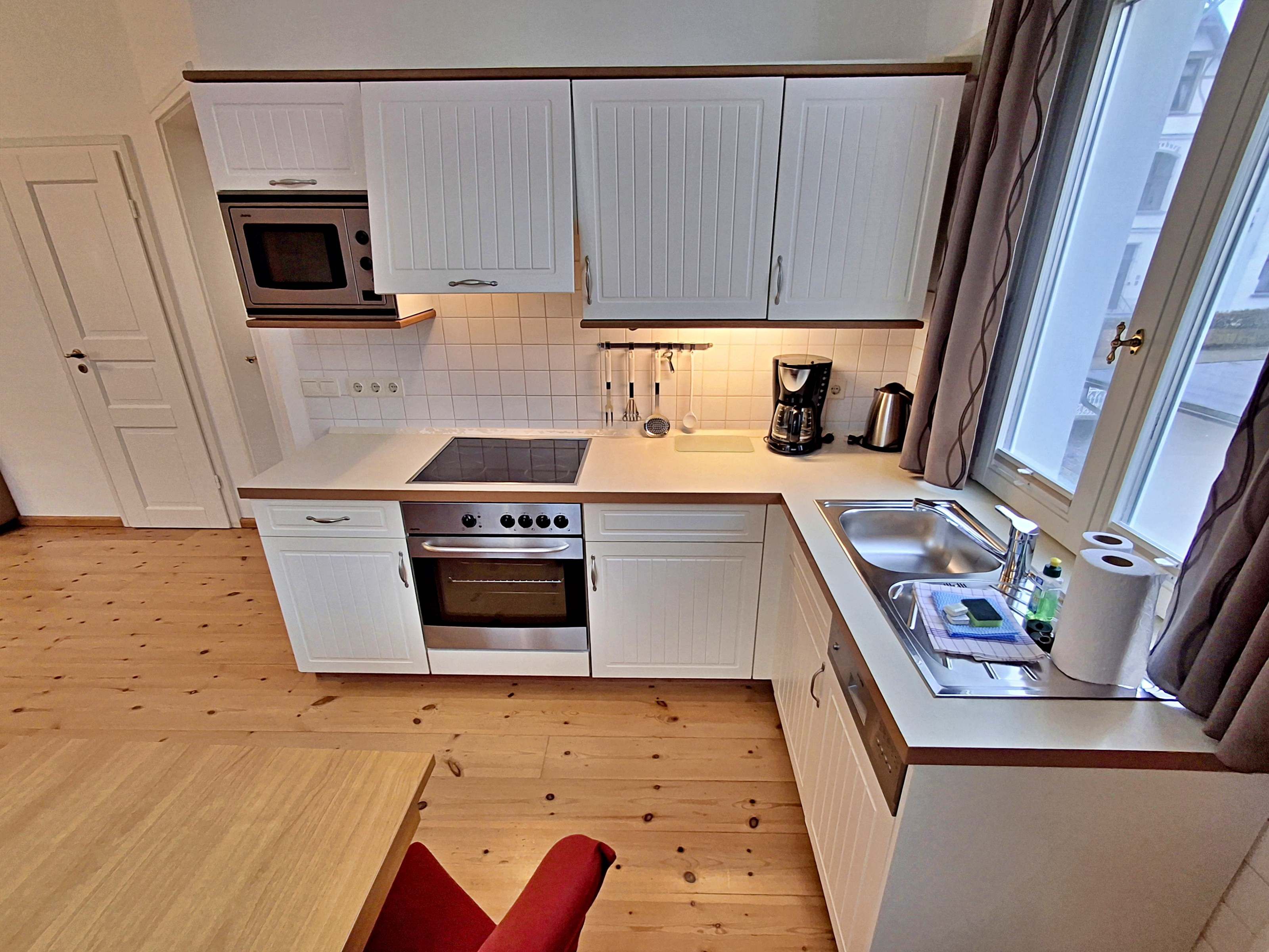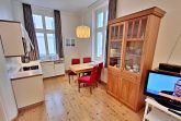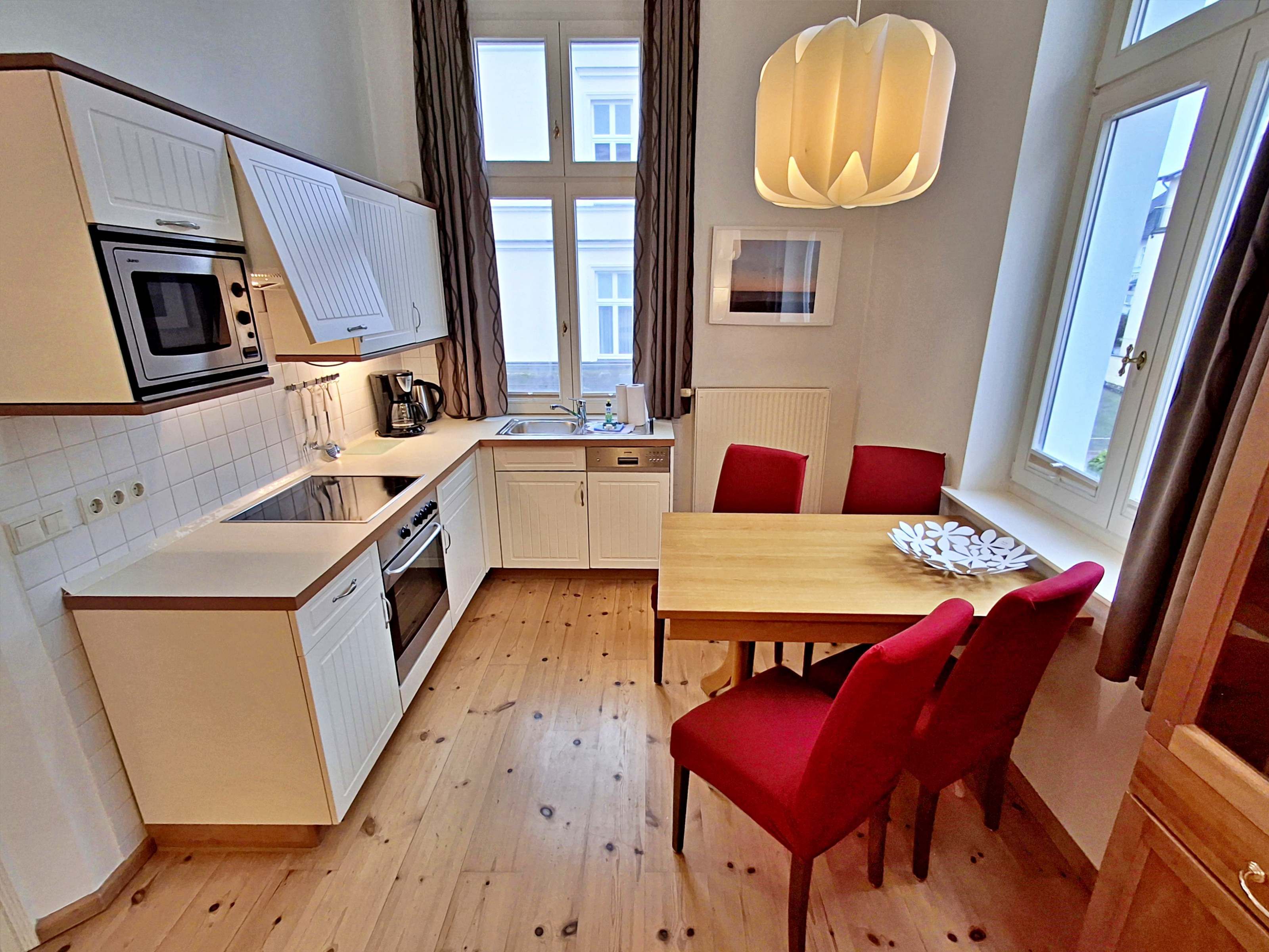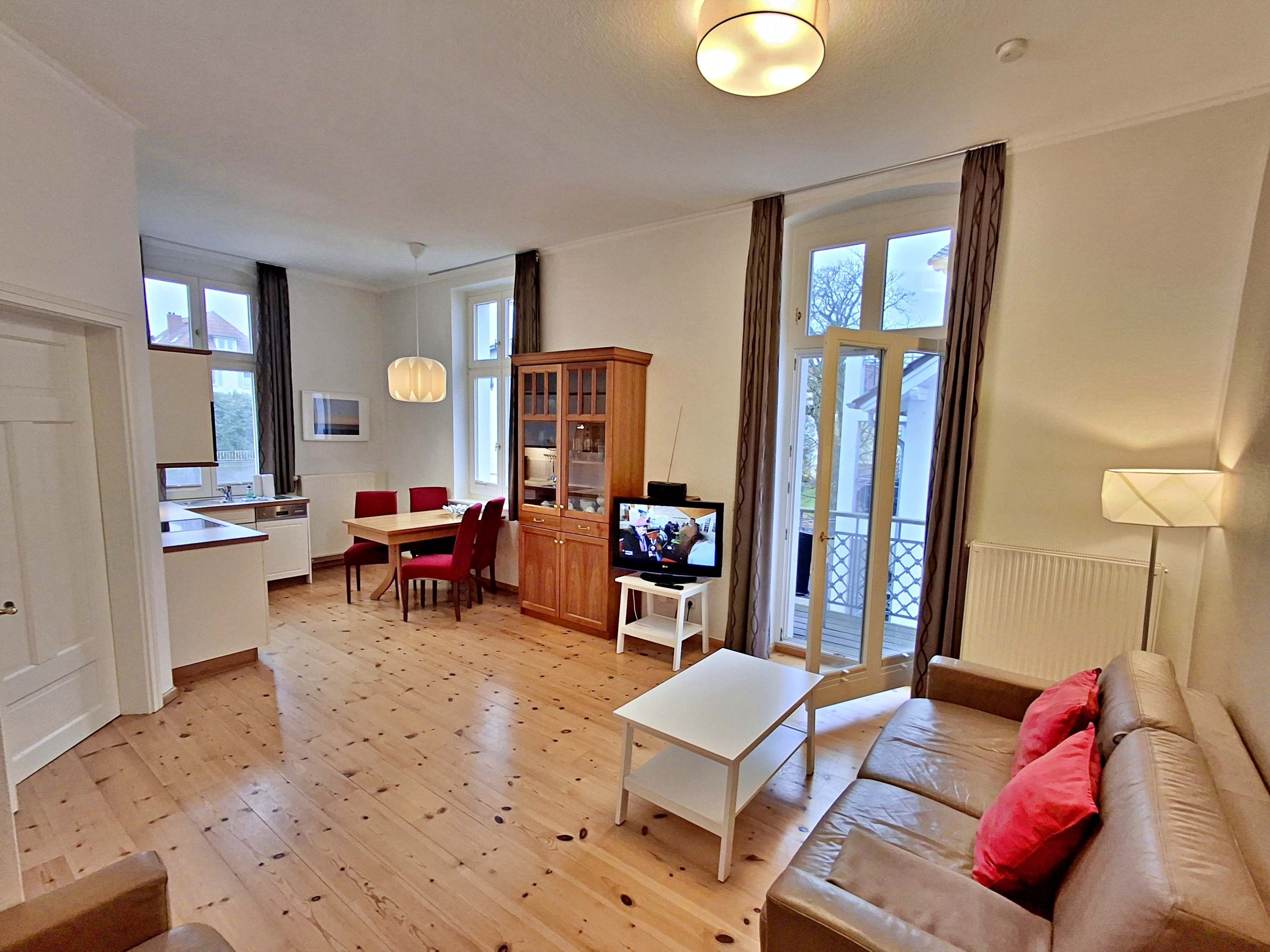 Die schöne 2-Zimmer-Wohnung Dierhagen mit Balkon im 1. Obergeschoss für max. 3 Erwachsene und 1 Kind bis 8 Jahre befindet sich in der stilvoll restaurierten Villa Ahlbeck - nur wenige Schritte von der Promenade und dem Strand entfernt. Im hellen Wohnbereich befinden sich neben einer gemütlichen Couch (Aufbettungsmöglichkeit für 2 Personen) auch ein Esstisch mit 4 Stühlen, der genügend Platz für 4 Personen bietet. Das Highlight der Wohnung ist der Balkon in West-Ausrichtung. Hier können Sie bereits morgens Ihren Kaffee genießen oder den Abend bei einem Glas Wein ausklingen lassen. Die moderne Küchenzeile mit Ceranherd, Backofen, Geschirrspüler, Mikrowelle, Kaffeemaschine, Wasserkocher und Toaster lässt keine Wünsche offen. Für die Unterhaltung sorgen ein Flachbild-TV, Radio-CD-Player und kostenfreies W-LAN. Das Schlafzimmer verfügt über ein Doppelbett und das Badezimmer hat Badewanne/WC.