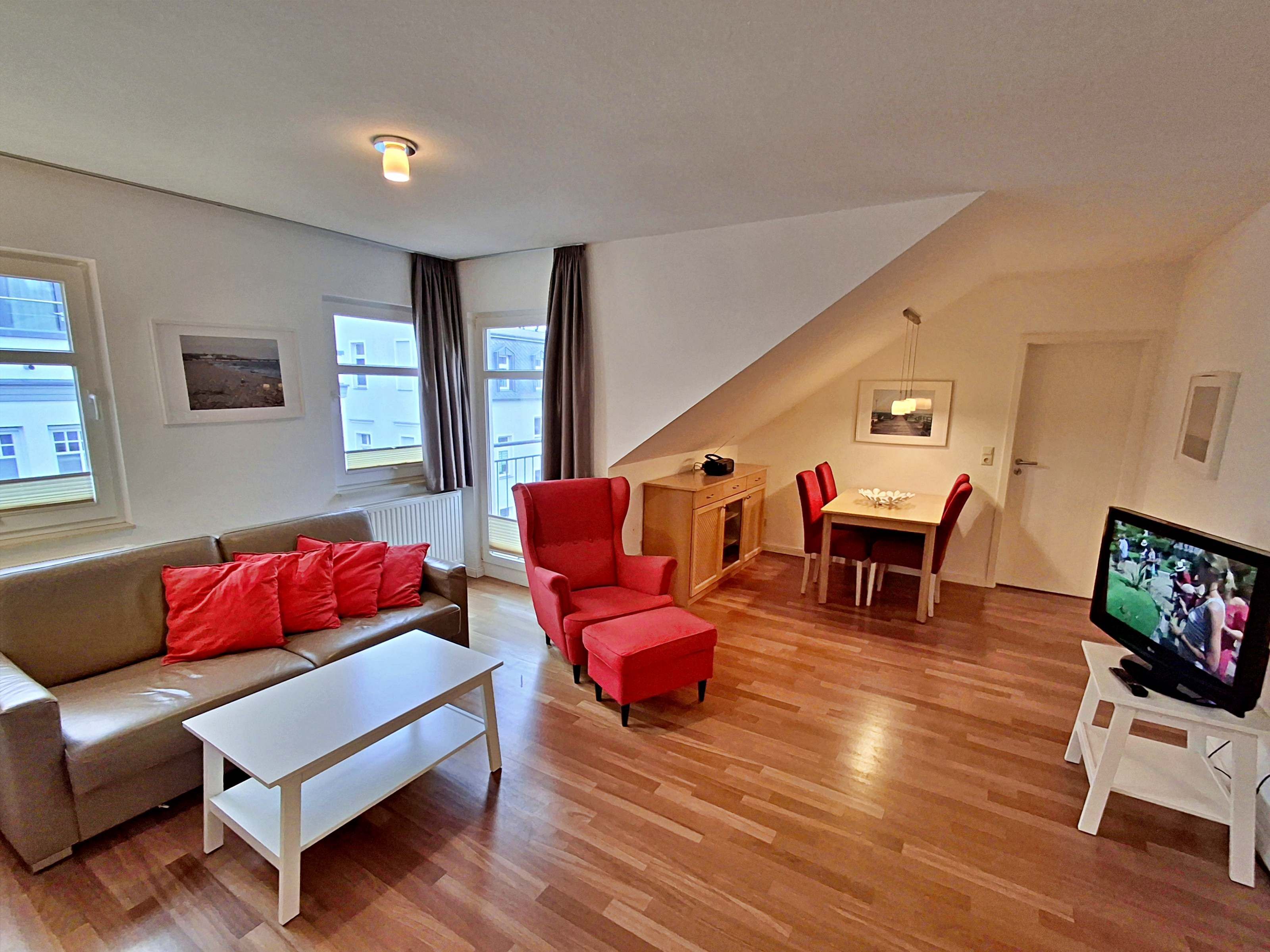 Die helle 2-Zimmer-Wohnung Rotschenkel im 3. Obergeschoss mit Balkon für max. 3 Erwachsene und 1 Kind bis 14 Jahre befindet im Nebengebäude der stilvoll restaurierten Villa Ahlbeck - nur wenige Schritte von der Promenade und dem Strand entfernt. Im Wohnbereich befinden sich neben der Couch auch ein Sessel mit passendem Fußhocker sowie ein Esstisch mit 4 Stühlen, der genügend Platz für 4 Personen bietet. Das Highlight der Wohnung ist der Balkon in Nord-Ost-Ausrichtung, wo Sie bei schönem Wetter bereits morgens Ihren Kaffee genießen oder den Abend bei einem Glas Wein ausklingen lassen können. Die moderne Küchenzeile mit Ceranherd, Backofen, Geschirrspüler, Mikrowelle, Kaffeemaschine, Wasserkocher und Toaster lässt keine Wünsche offen. Für die Unterhaltung sorgen ein Flachbild-TV, Radio-CD-Player und kostenfreies W-LAN. Das Schlafzimmer verfügt über ein Doppelbett und das Badezimmer hat DU/WC. Vom Schlafzimmer aus können Sie auch einen Blick auf die Ostsee erhaschen.
