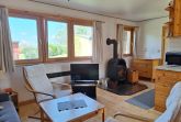 Der offene Wohnbereich mit Kamin umfasst das gemütliche Sofa, einen Esstisch und die Einbauküchenzeile mit Geschirrspüler und Waschmaschine mit Trockner. Diese verfügt über alle Utensilien des täglichen Bedarfs sowie einer Mikrowelle und Dunstabzughaube.