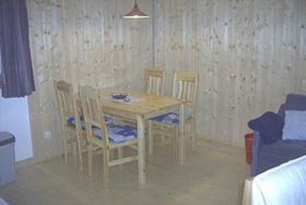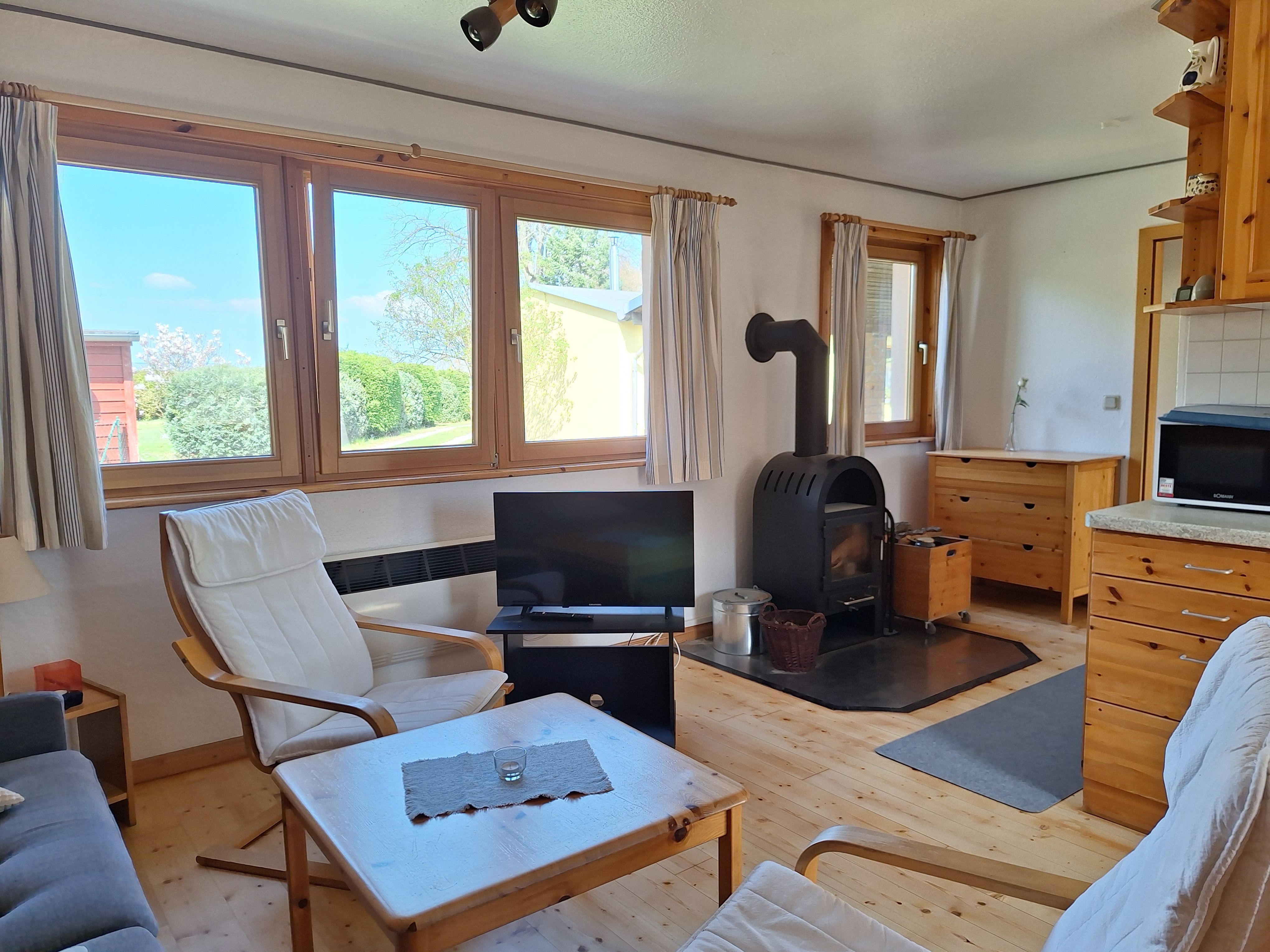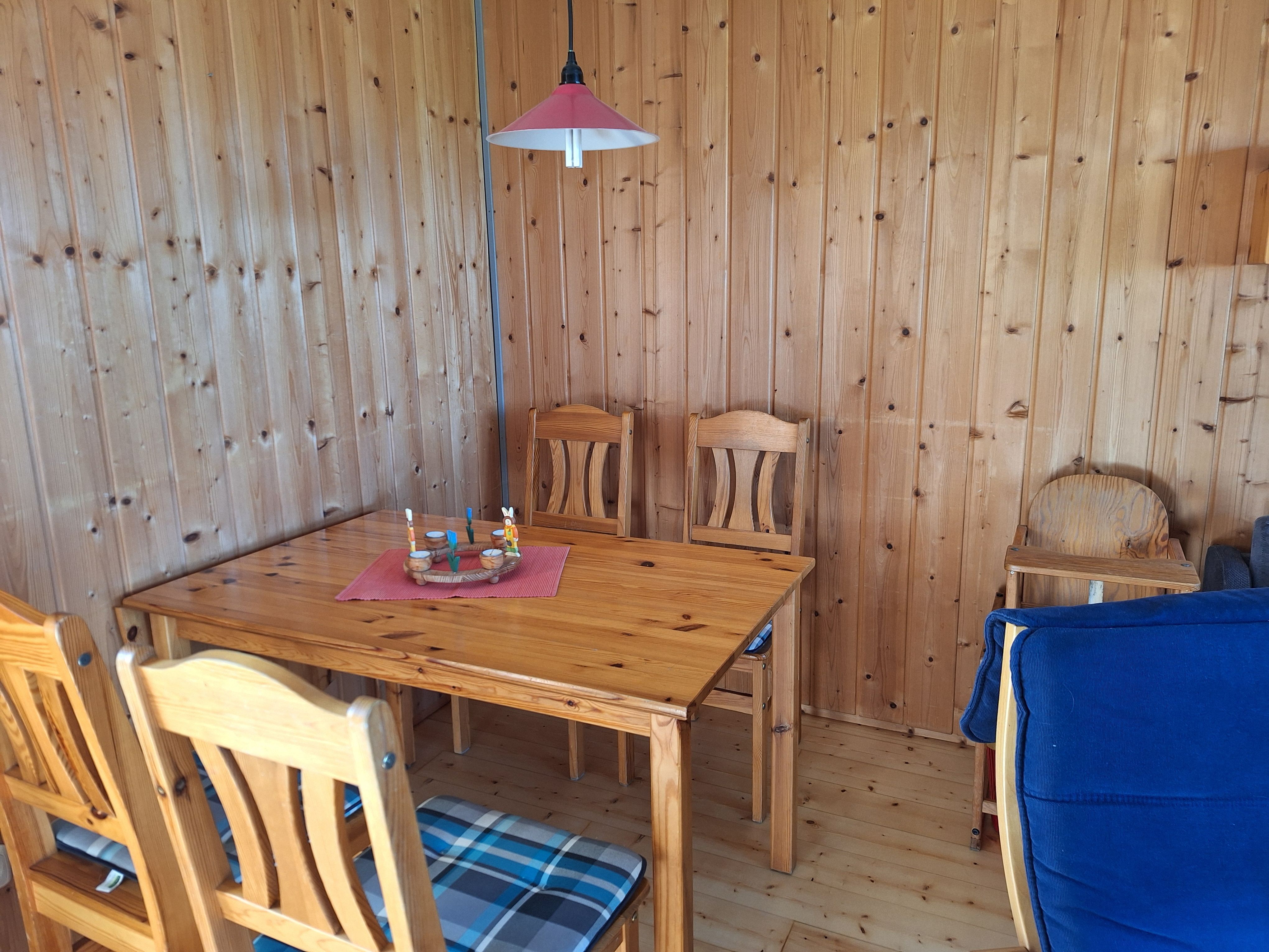 Der offene Wohnbereich umfasst das gemütliche Sofa, einen Esstisch und die Einbauküche. Diese verfügt über alle Utensilien des täglichen Bedarfs.