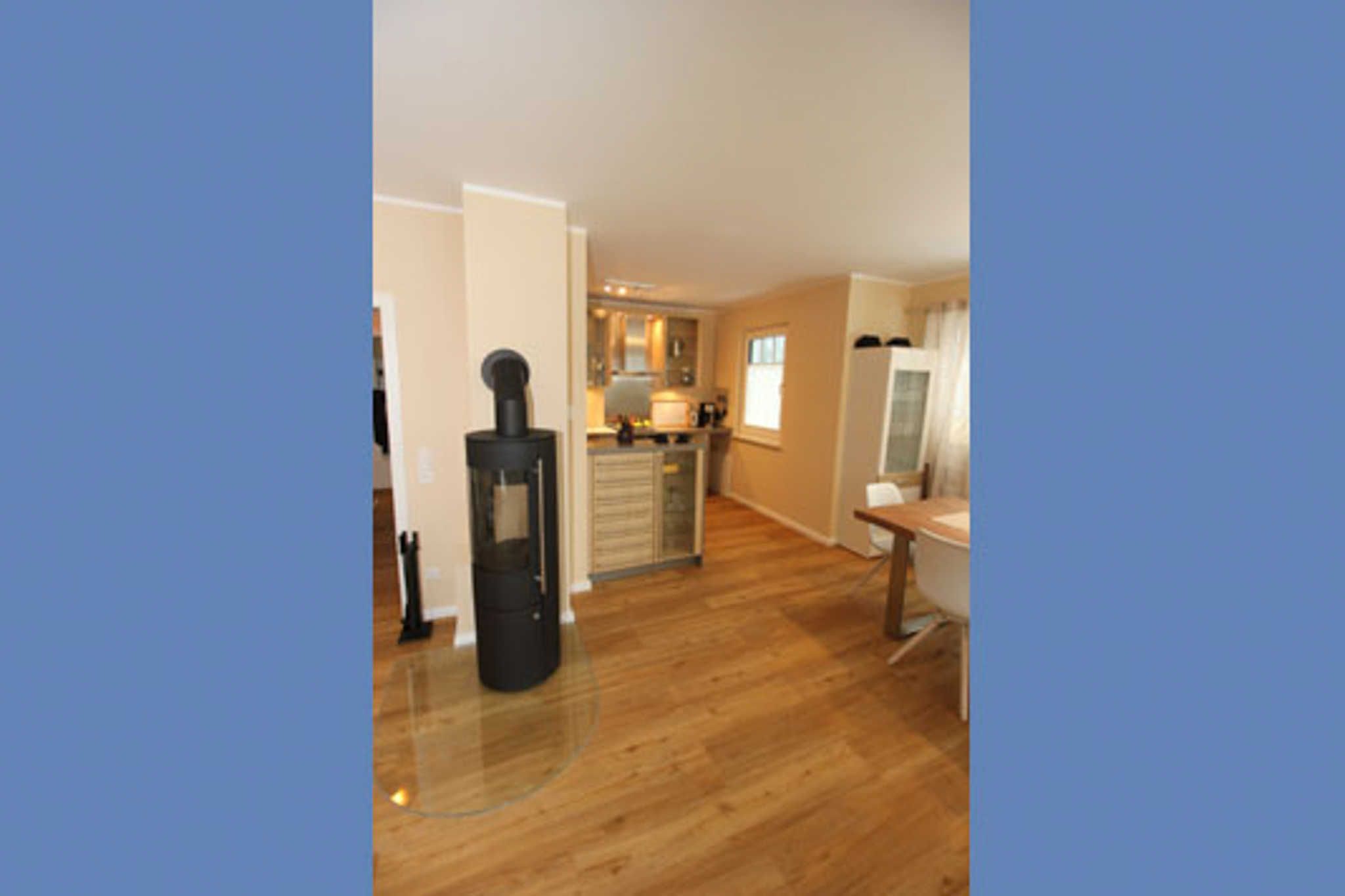 Das großzügige Wohnzimmer mit einem Kaminofen, einer hochwertigen Stereo Anlage und einem Smart-LED TV mit Internetzugang sorgen für die notwendige Unterhaltung. Eine gemütliche Leder-Couch mit Recamiere und 2 Sessel laden zum entspannten Verweilen ein. Ebenso erwartet sie neben der offenen Küche der großzügige Essbereich für 6 Personen mit einem Unikat Baumscheibentischan dem es sich vorzüglich tafeln lässt. Die offen gehaltene Küche mit Tresenschrank und Barhockern lädt zum gemeinsamen Vorbereiten von Gerichten ein. Das Cerankochfeld und derKombi-Backofen mit Mikrowellenfunktion, sowie der Geschirrspüler und ein großer Kühlschrank mit Gefrierfach und Null-Grad Zone machen das Kochen zum Vergnügen.