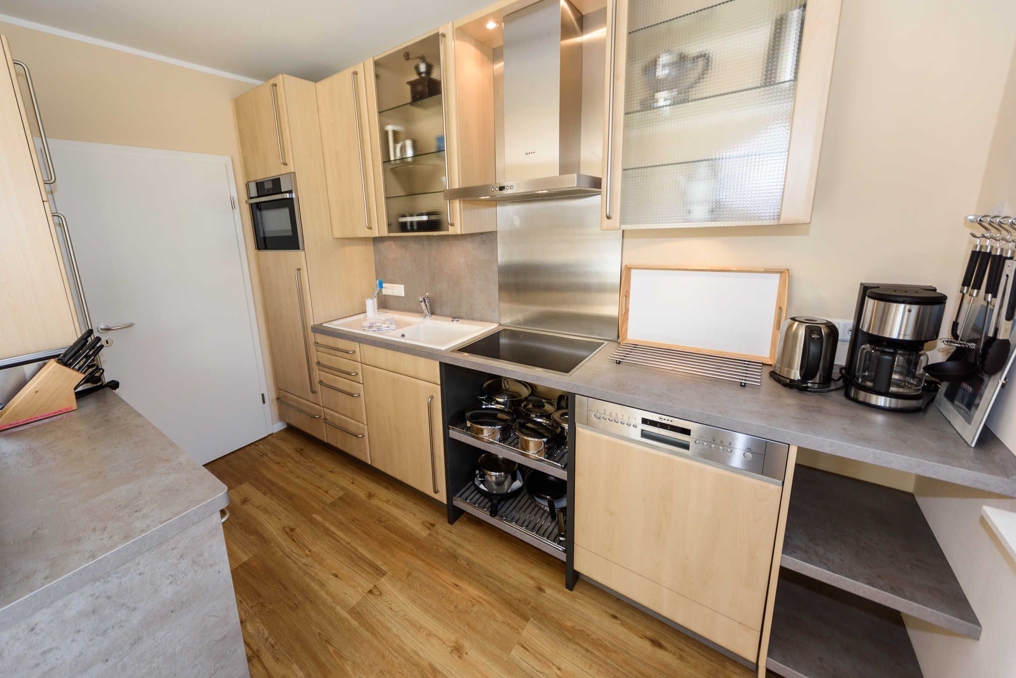 Die offene Küche lädt zum gemütlichen Beisammensein ein. Das Cerankochfeld und der Kombi-Backofen mit Mikrowellenfunktion, die leistungsfähige Ablufthaube, sowie der Geschirrspüler und ein großer Kühlschrank mit Gefrierfach und Null-Grad Zone machen das Kochen zum Vergnügen.