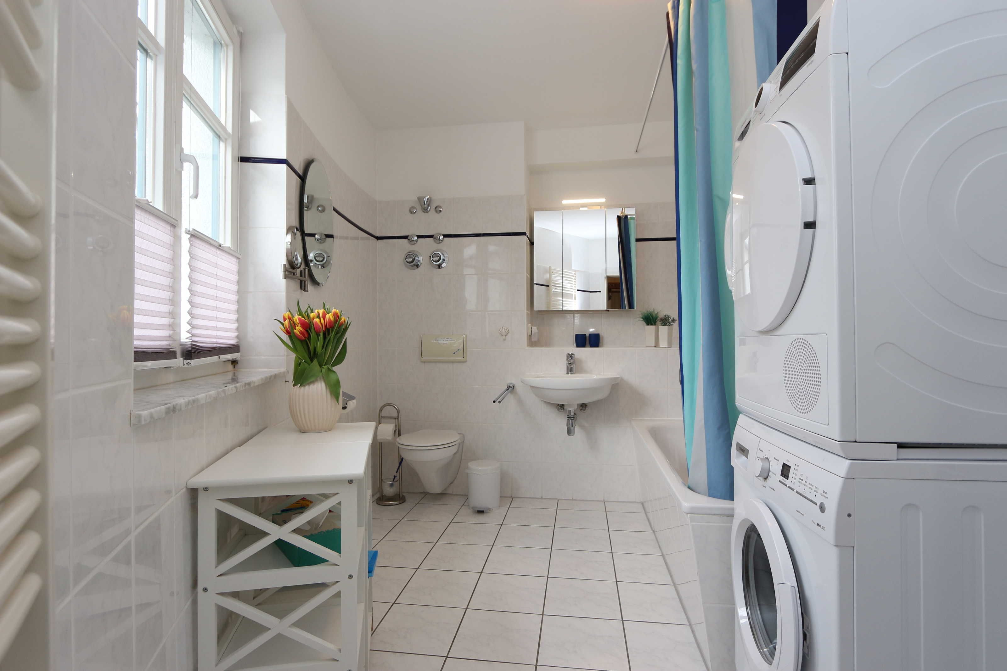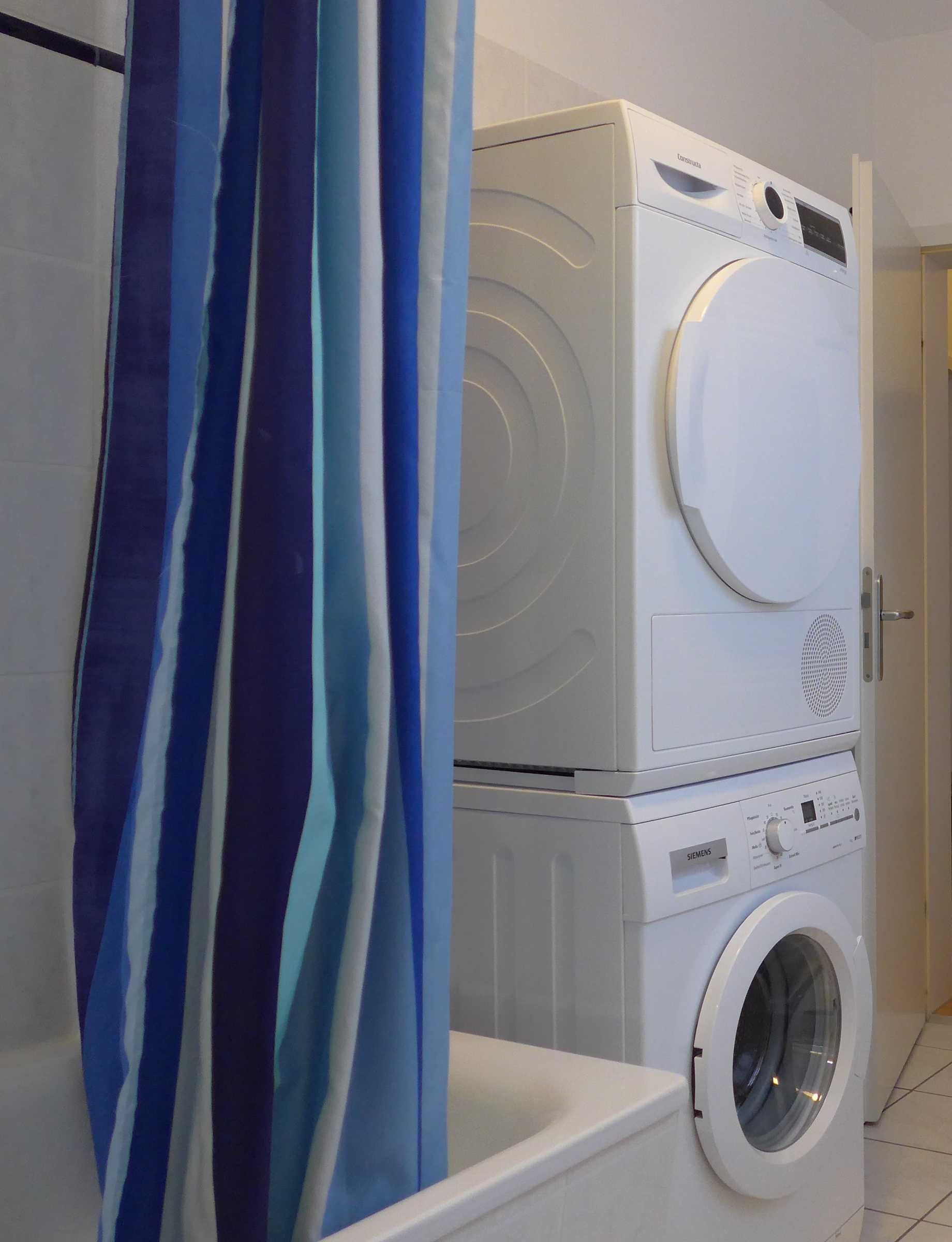 • Bad mit Badewanne, Waschmaschine, Wärmepumpen-Wäschetrockner und Handtuchtrockenheizkörper.