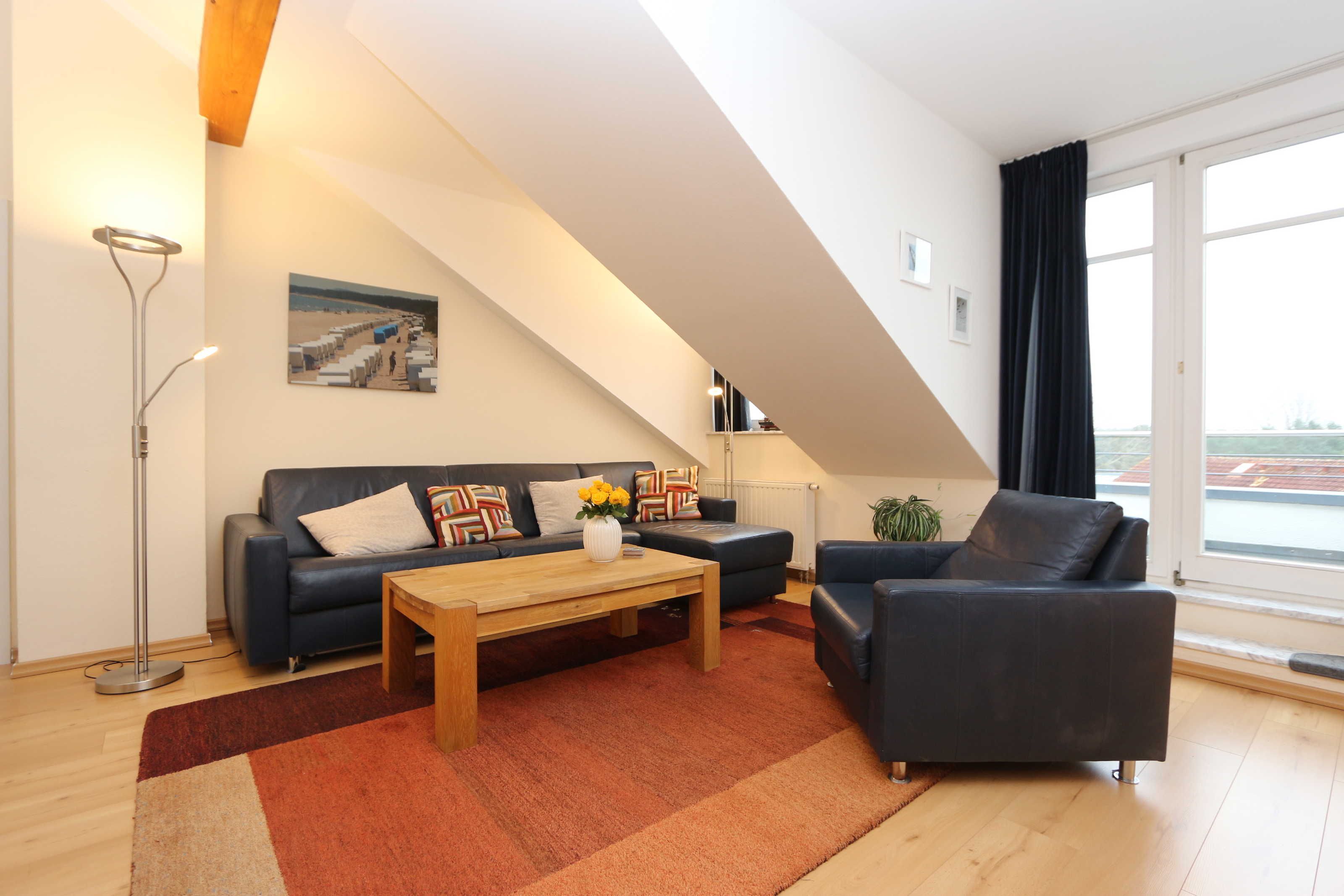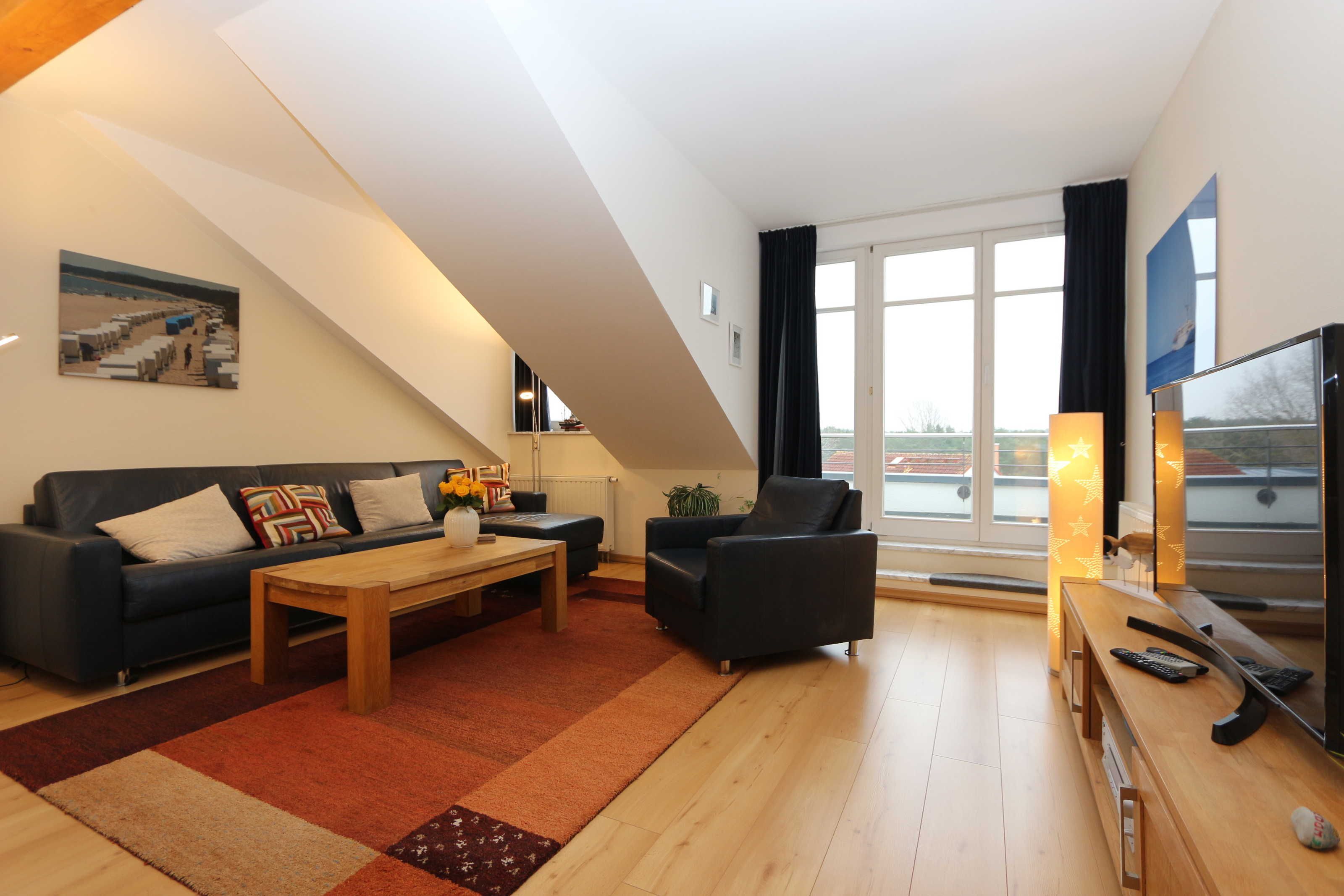 • Helles Wohnzimmer mit Zugang zu einer sonnigen Dachterrasse von welcher man einen freien Ausblick auch auf das Achterwasser hat, einem bequemen und gemütlichen und breitem Sofa mit Longchair in Echtleder und einem zugehörigem Leder- Sessel,