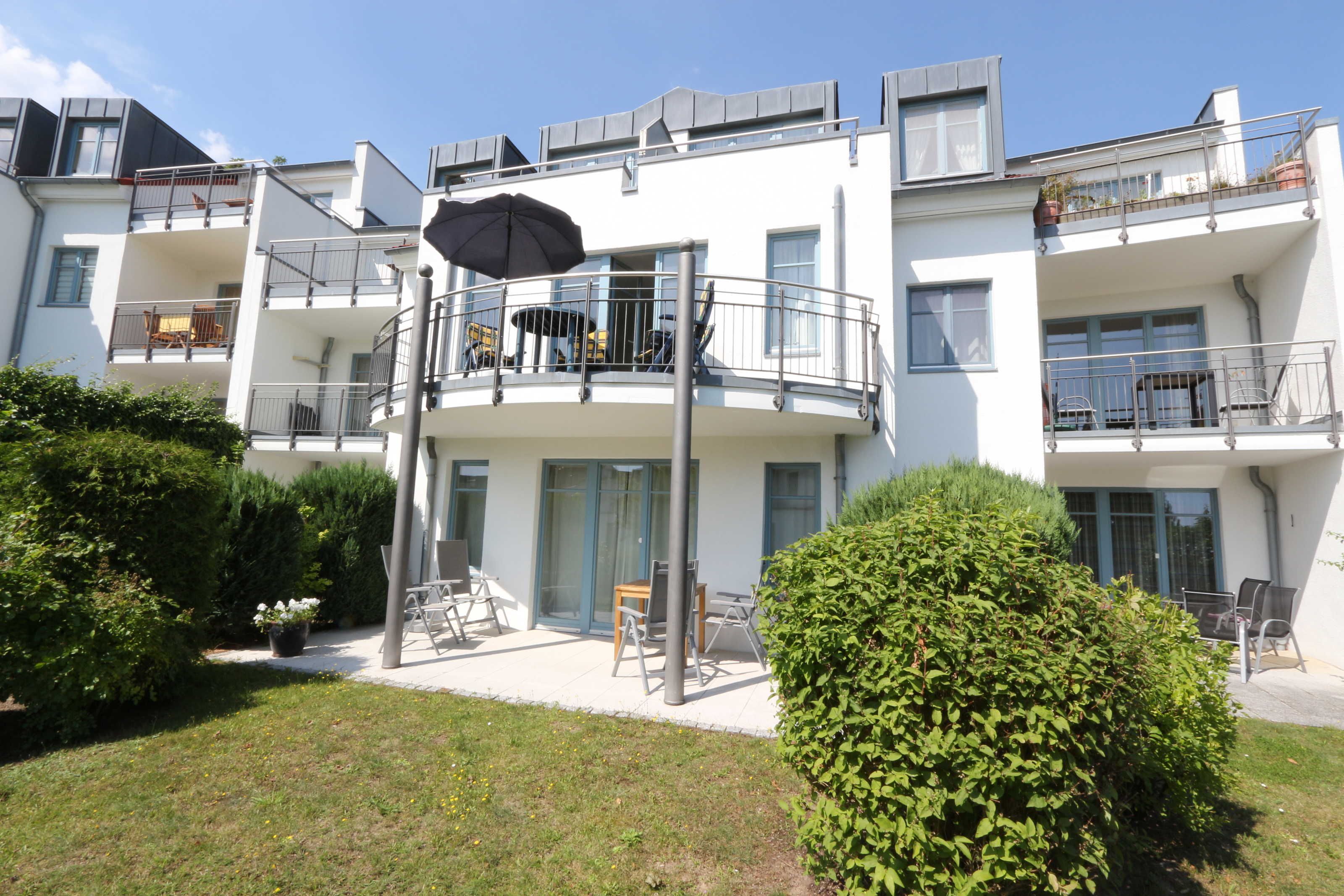 Die 2-Zimmer-Wohnung Nr. 9 (ca. 56 m²) im Erdgeschoss mit exklusiver Ausstattung und einer überdachten windgeschützten Terrasse befindet sich in der Residenz Bellevue in 17454 Zinnowitz, Heimweg 8.