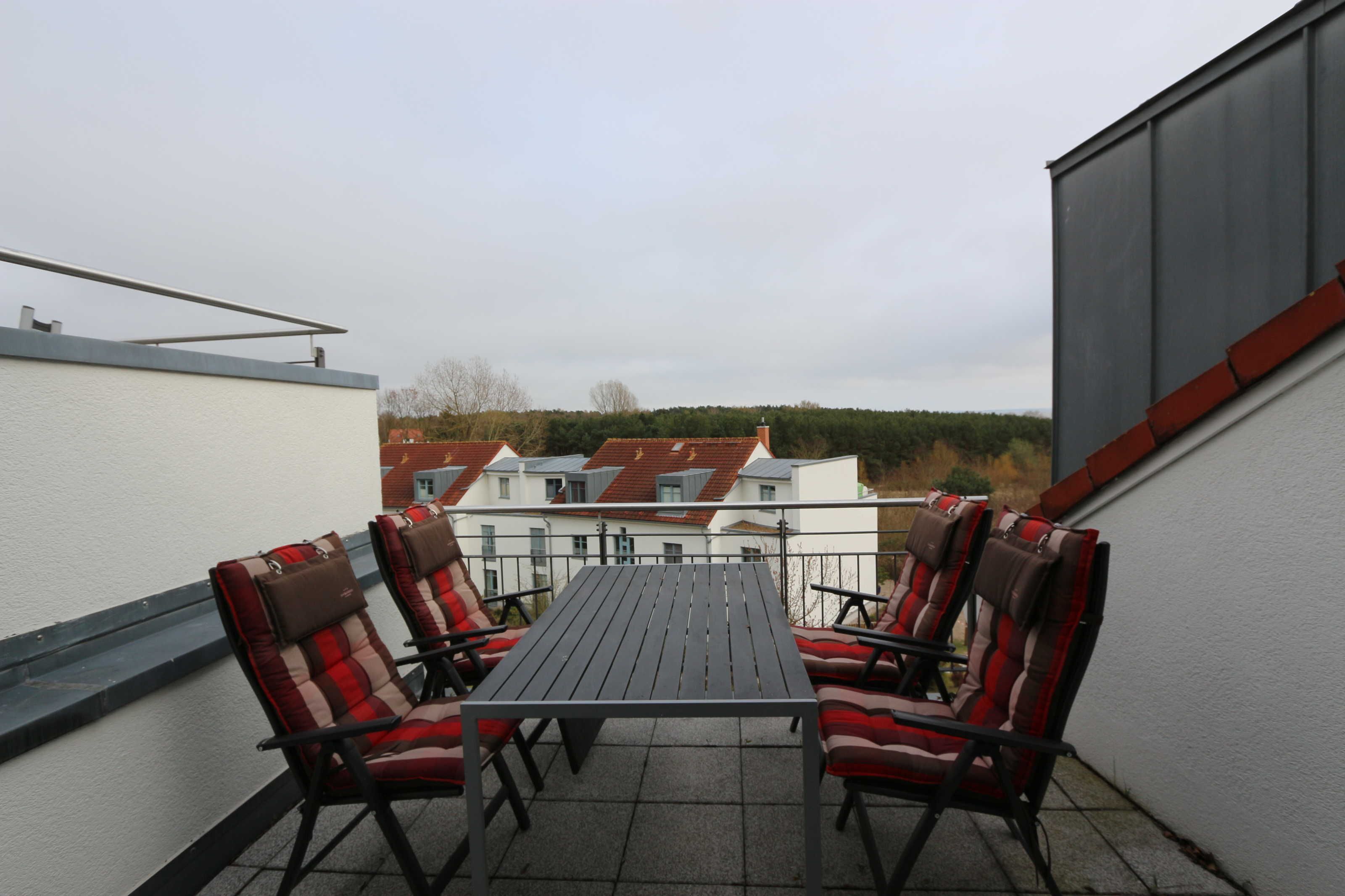 • 2 Dachterrassen nach Südwesten ausgerichtet und mit schönem Ausblick auch auf das Achterwasser mit Sonnenschirm, Tisch und 4 Stühlen incl . bequemen Auflagen