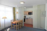 Diese 55 m² große helle und komfortabel ausgestattete 2 Raum Nichtraucherferienwohnung befindet sich im 2. OG des Appartementhauses der Ferienanlage Inselstrand. Sie ist für max. zwei Erwachsene und ein Kind im Alter von 10 Jahren buchbar. Die Wohnung verfügt im Wohnzimmer über eine großzügige Couch, welche auch zum Schlafen geeignet ist und eine Essecke mit 4 Stühlen. Für die Unterhaltung sorgt ein Flachbild-TV, DVD-Player und eine HiFi-Anlage. Die offene Küche mit 4 Plattenherd, Backofen, Kühlschrank mit Gefriermöglichkeit, Mikrowelle und Spülmaschine lässt keine Wünsche offen. Im Schlafzimmer befindet sich ein Doppelbett (1,90 m x 2,10 m) und ein zusätzlicher Flachbild-TV. Das Badezimmer ist mit Dusche/WC, Haarfön und Kosmetikspiegel ausgestattet. W-LAN steht Ihnen in der gesamten Wohnung kostenfrei zur Verfügung.