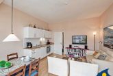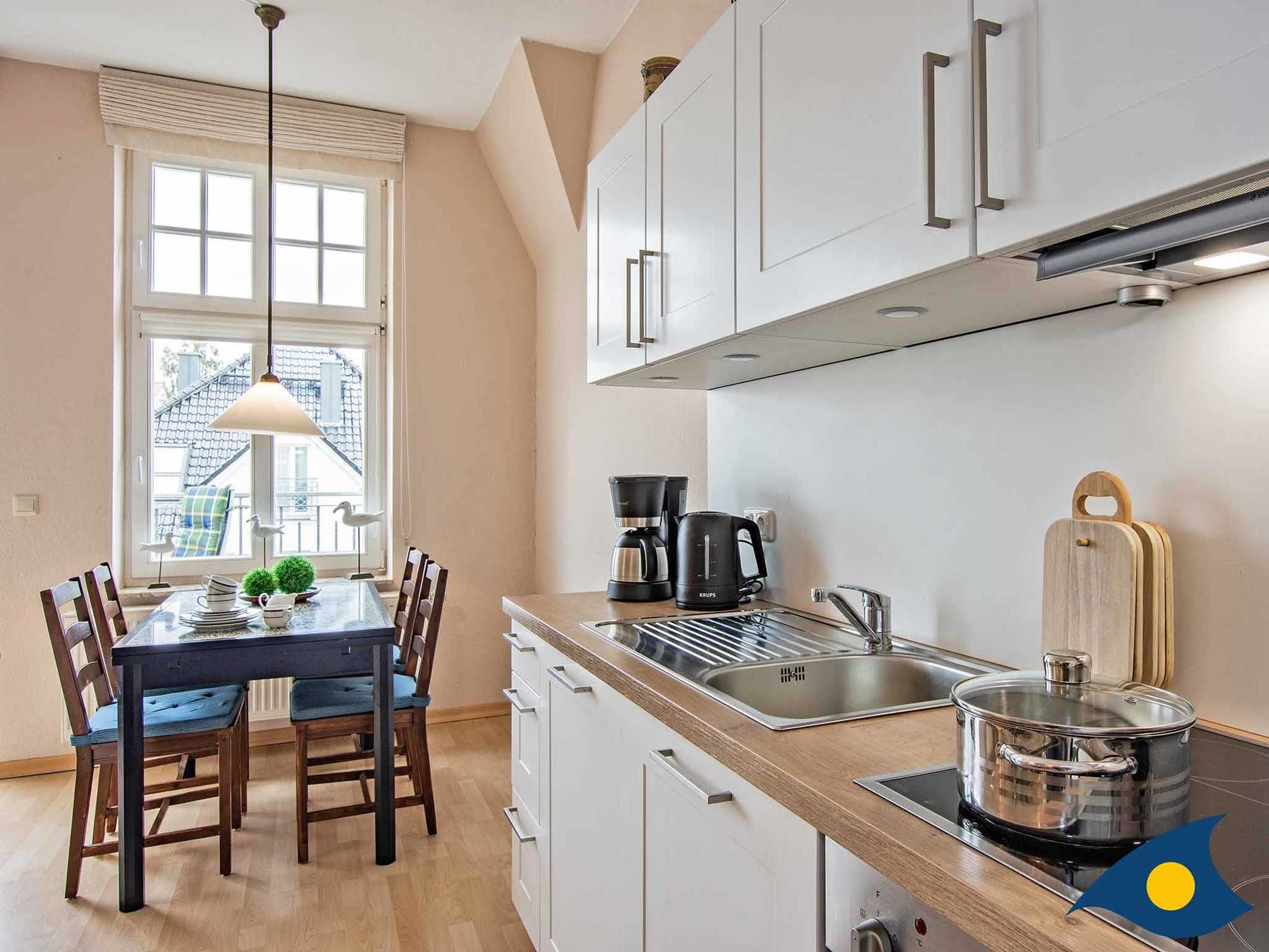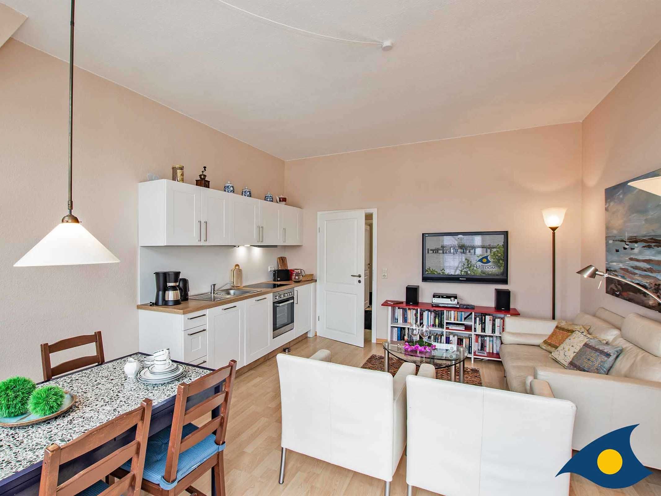 Die vollausgestattete Küchenzeile im Wohnzimmer lädt zum gemeinsamen Kochen ein. Das geräumige Badezimmer mit Badewanne verspricht einen rundherum erholsamen Urlaub.