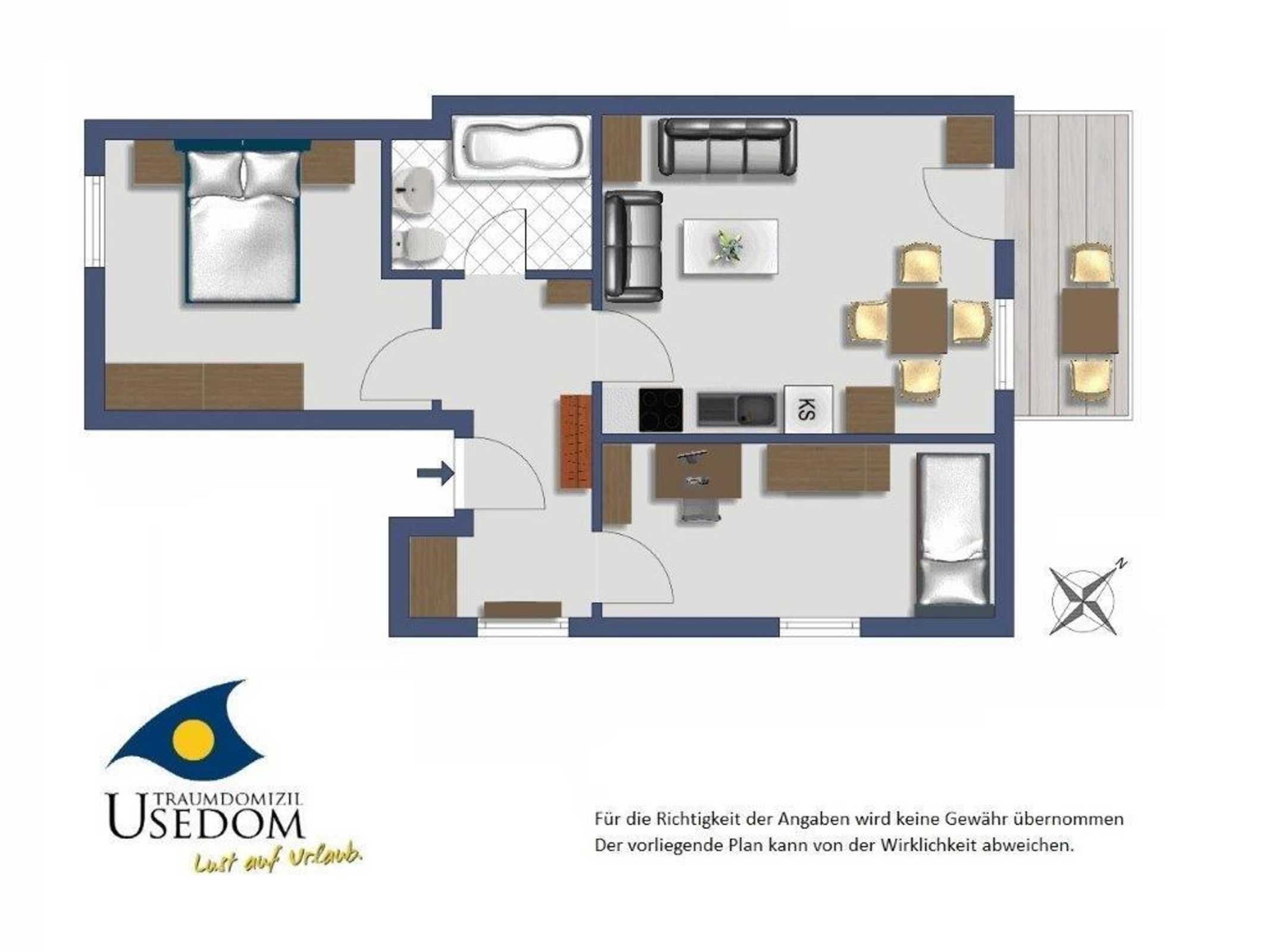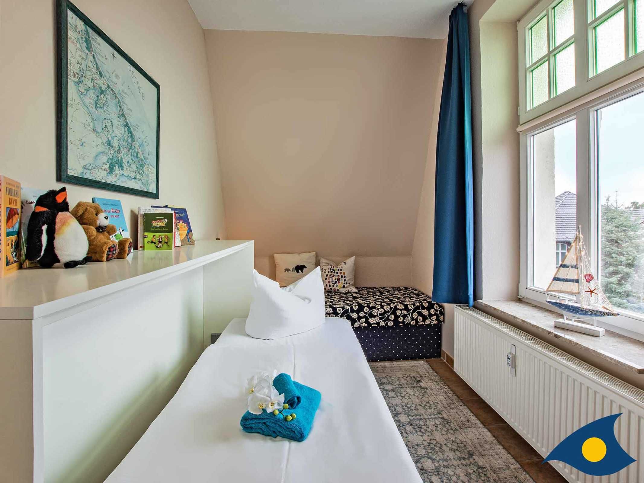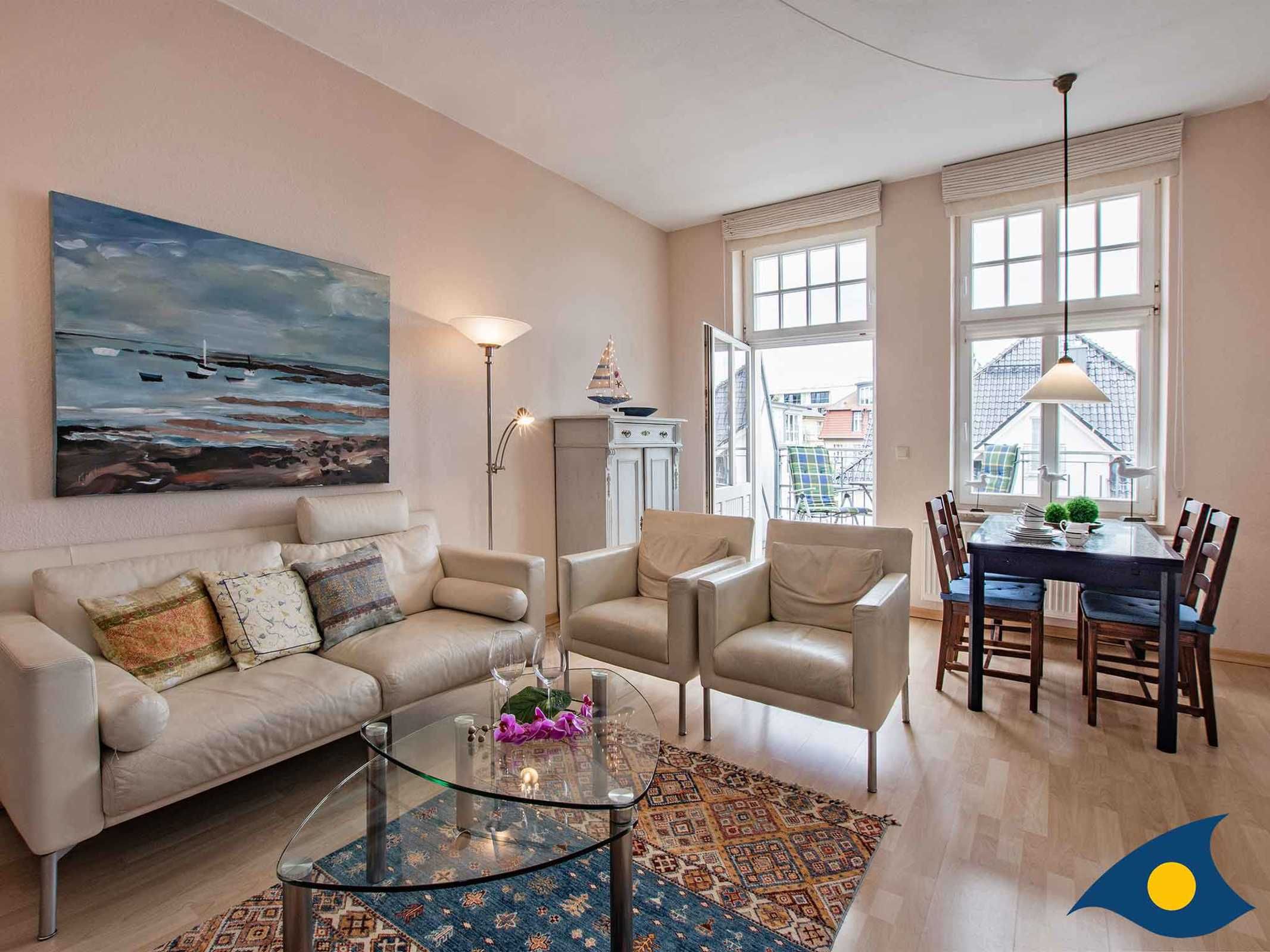 Die liebevoll eingerichtete 3-Zimmer-Ferienwohnung befindet sich im 2. Obergeschoss der Villa Malve. Auf 56 m² Wohnfläche erwartet Sie ein großzügiges Wohnzimmer mit einem hellen Essplatz am Fenster, einem komfortablen Schlafzimmer mit Doppelbett und einem separaten Schlafzimmer mit zwei Einzelbett - ideal für einen Familienurlaub.