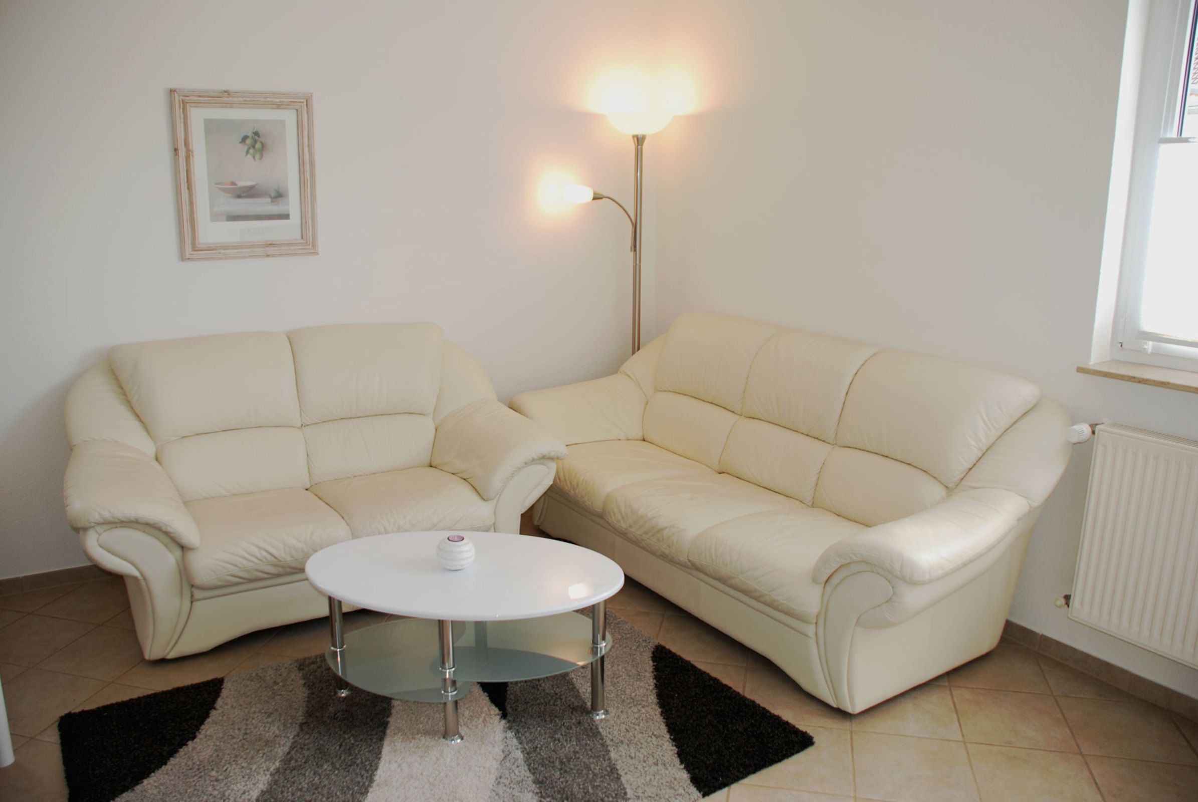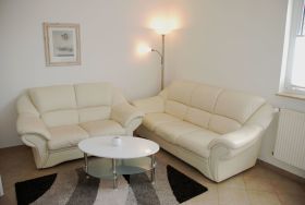 Diese modern eingerichtete Ferienwohnung liegt im Erdgeschoss, bietet auf 35 qm Platz für max. 2 Erwachsene und hat Internet WLAN. Über den separaten Eingang in Hausflur gelangen Sie in den Flur mit Garderobe und Kleiderschrank. Im gemütlichen Wohnzimmer stehen eine Polstersitzgruppe mit Tisch und Sesseln und ein Schrank mit einem modernen Flachbild-TV - Gerät. Hier steht auch ein Esstisch mit Stühlen. Die kleine Küchenzeile im Wohnbereich ist mit einem 4-Plattenkocher, Wasserkocher, Kaffeemaschine, Toaster und Kühlschrank komplett ausgestattet. Im Schlafzimmer steht ein bequemes Doppelbett (durchgehende Matratze) mit Nachttischen und Leselampen.