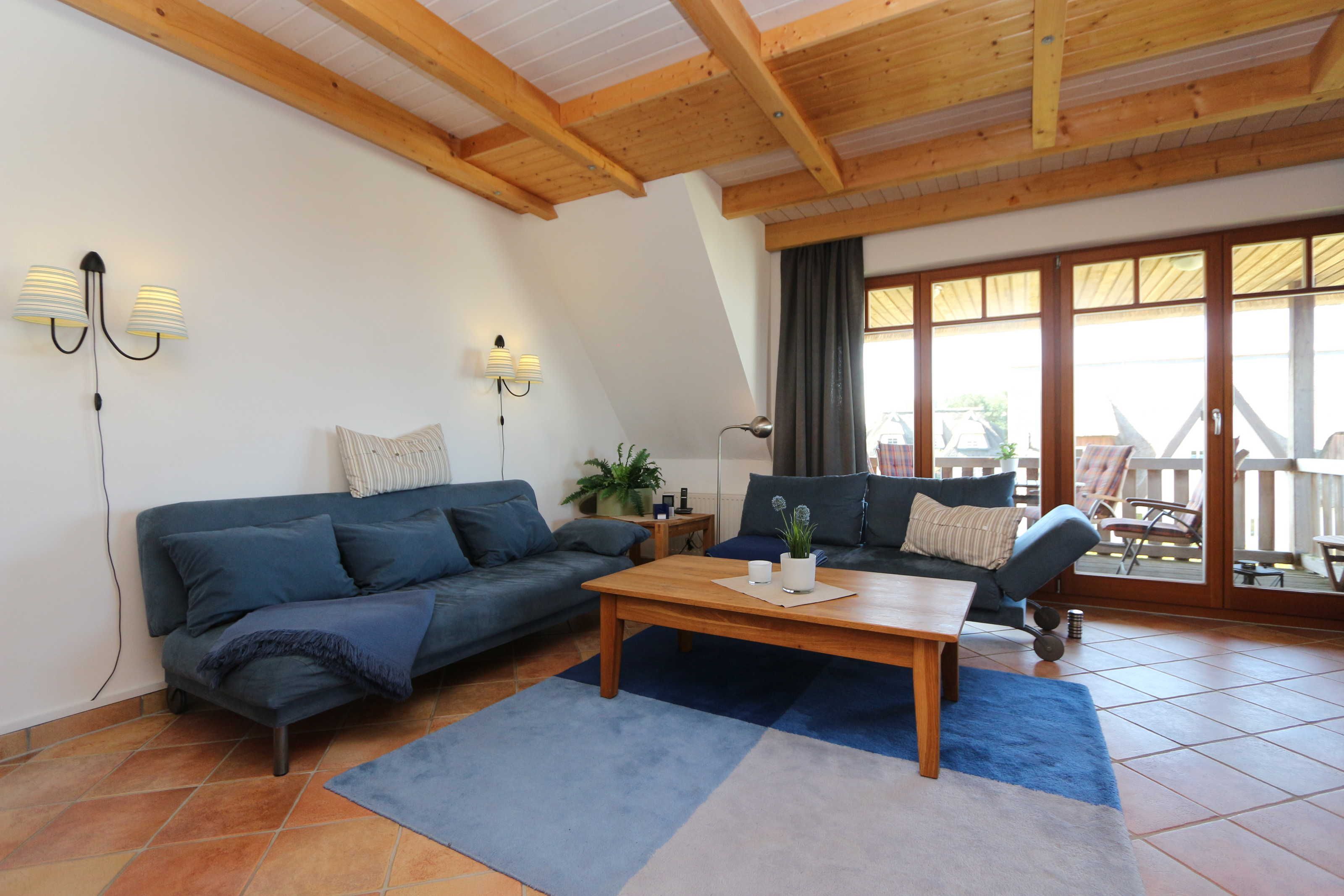 - Wohnzimmer mit zwei bequemen und gemütlichen Sofas, Couchtisch, Fernseher, Anrichte, die Sofas können auch als alternative Schlafmöglichkeiten genutzt werden;