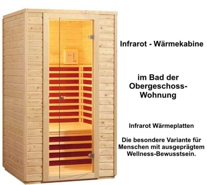• Für unsere Gäste haben wir im Bad eine hochwertige Infrarot-Wärmekabine mit IR-Wärmeplatten zur kostenfreien Benutzung eingebaut. Die Erwärmung in der Infrarot-Wärmekabine erfolgt nach dem Prinzip der Sonne (Strahlung). Die Durchblutung wird angeregt, die Entschlackung reinigt den Körper von Giftstoffen und die optimale Sauerstoffsituation steigert den Energiehaushalt.