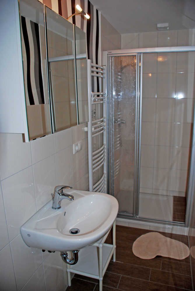 Das moderne Bad ist mit Dusche, WC und Waschtisch ausgestattet.
