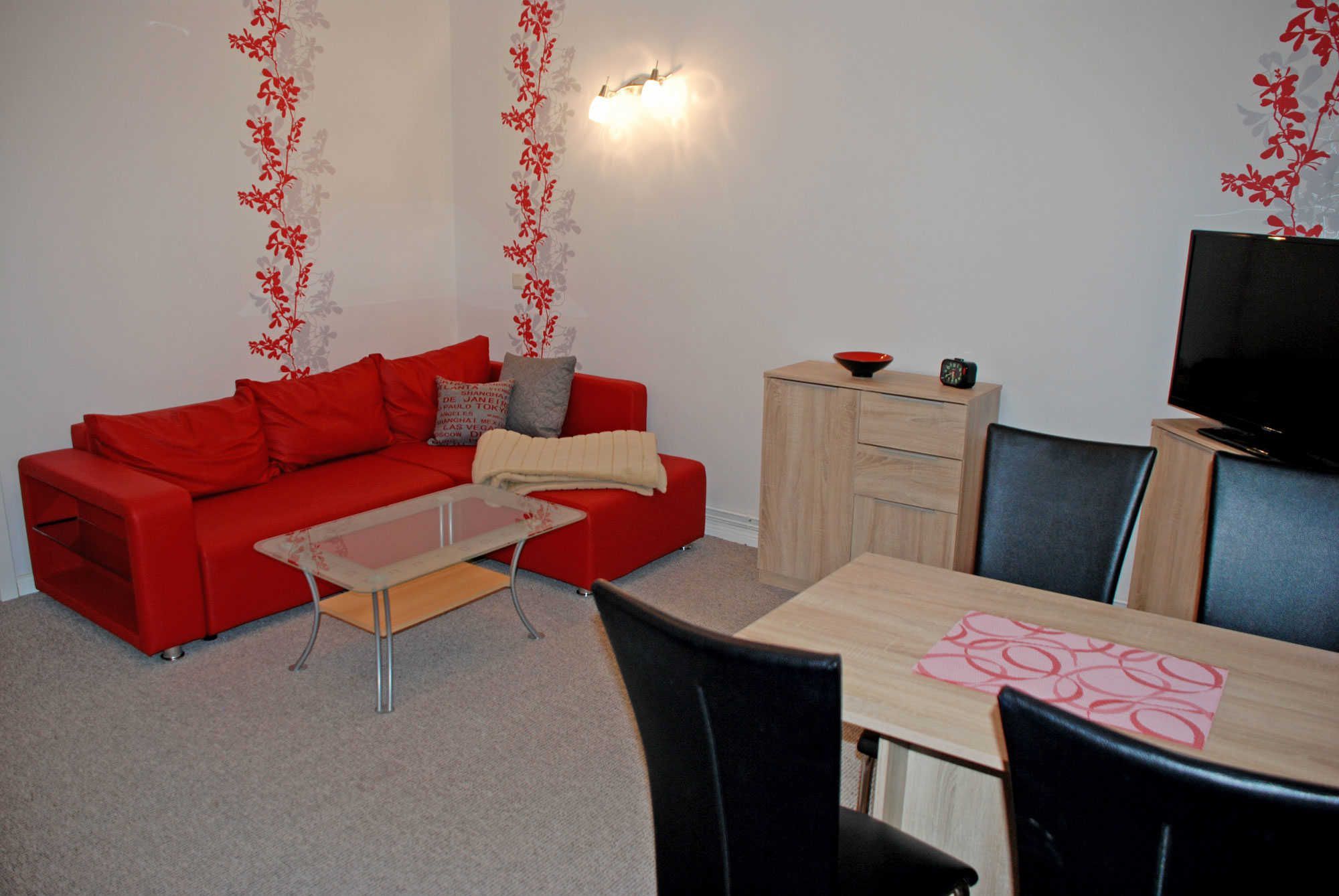 Im großen Wohnraum befindet sich eine bequeme Eckcouch, ein Couchtisch und ein Sidebord, ein Esstisch mit vier Stühlen sowie ein modernes Flachbild-TV-Gerät. Die Küchenzeile verfügt über einen Herd, Mikrowelle, Wasserkocher, Kaffeemaschine, Toaster und Kühlschrank mit Gefriermöglichkeit. WLAN steht Ihnen inklusive zur Verfügung.