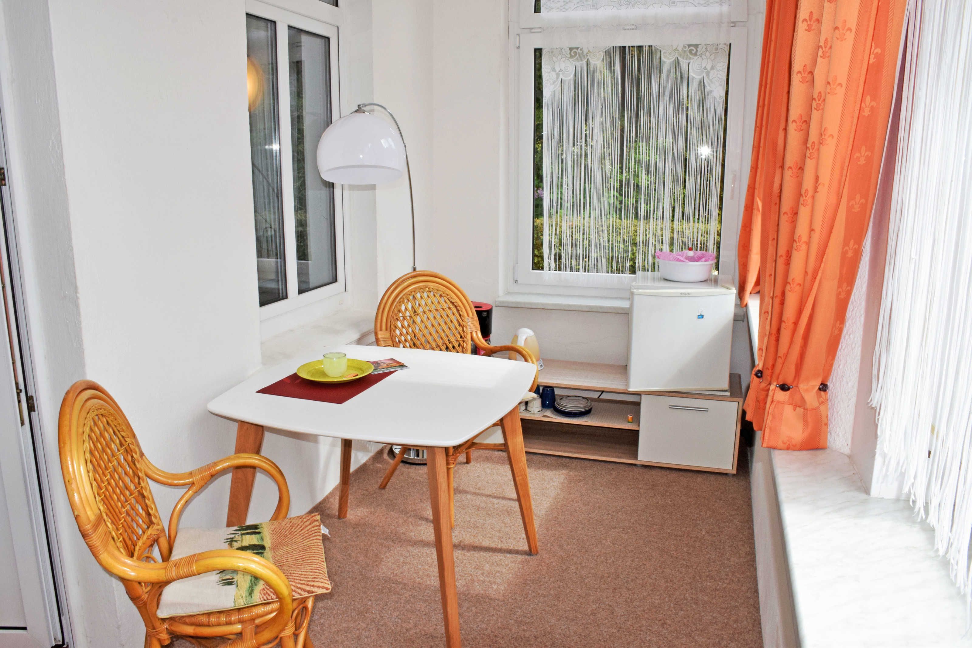 An den Wohnraum grenzt ein geschlossener Balkon mit Tisch und Stühlen. Hier stehen den Gästen ein Kühlschrank, Wasserkocher und Kaffeemaschine zur Verfügung.