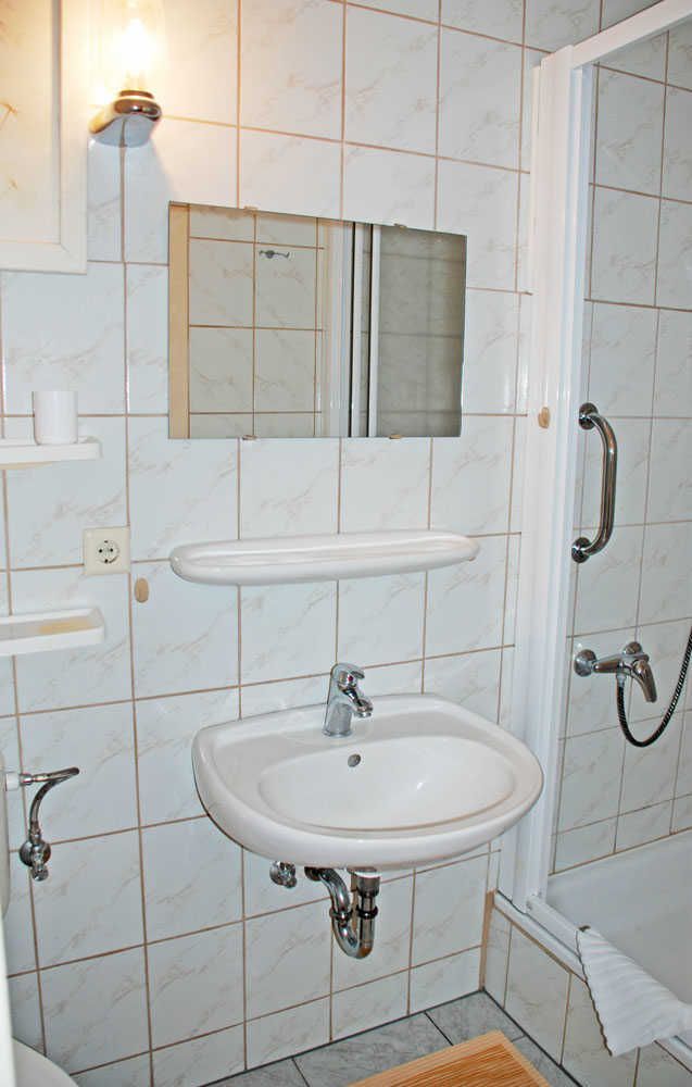 Gegen Aufpreis können Wäschepakete dazu gebucht werden. Das moderne Bad ist mit Dusche, WC und Waschtisch ausgestattet und verfügt über Tageslicht (nur Zimmer 01).
