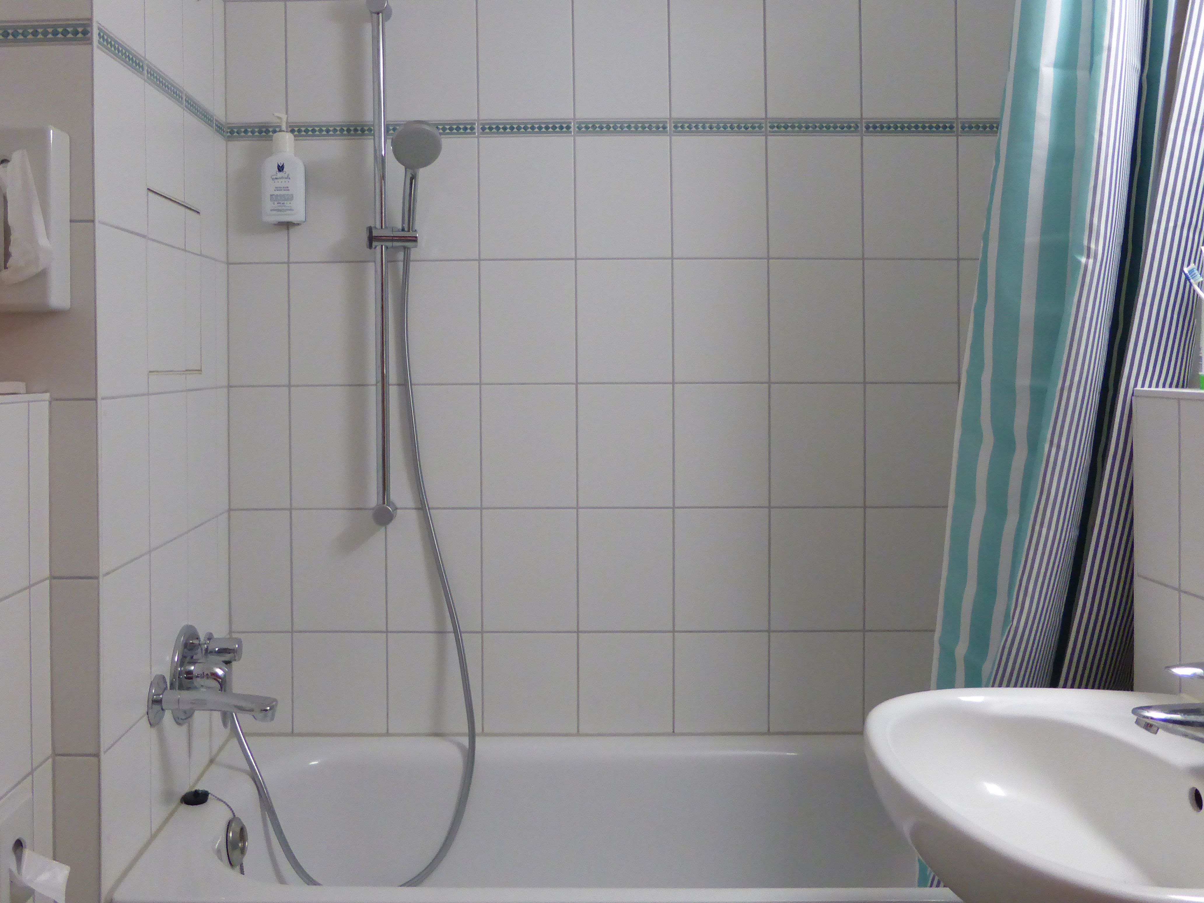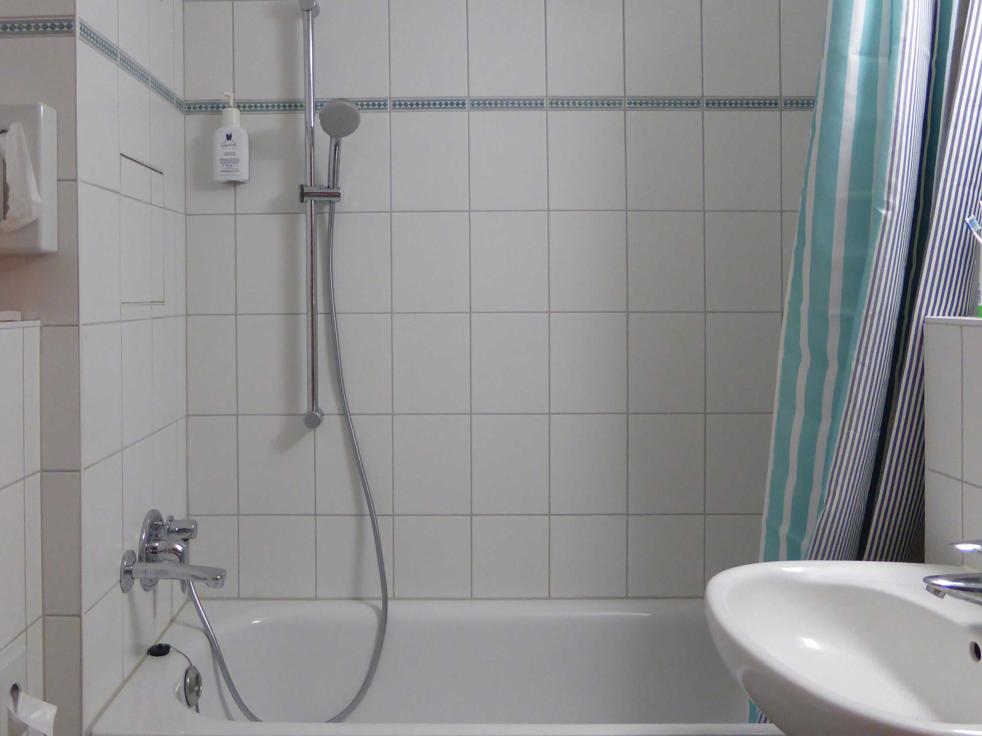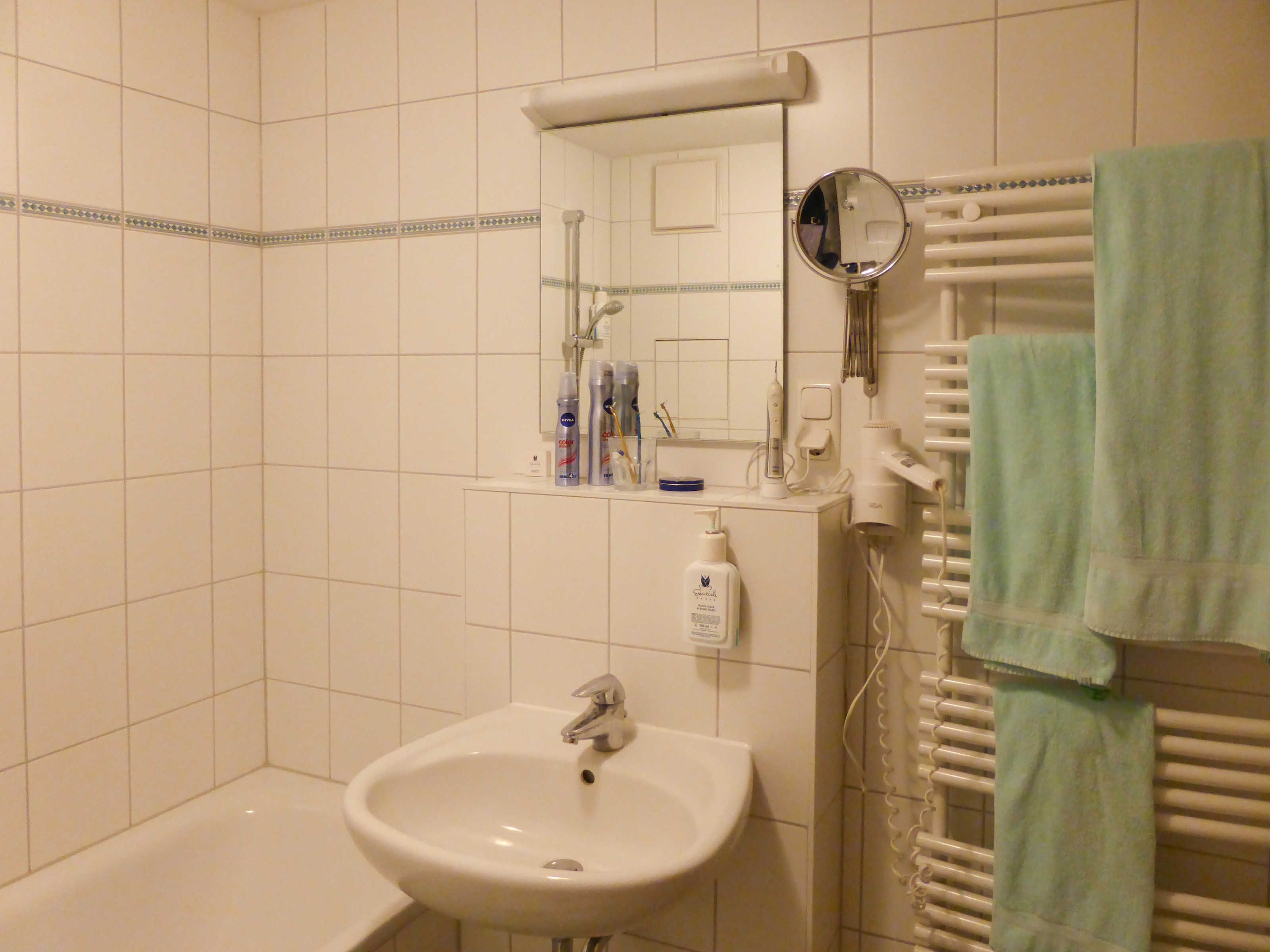 Bad mit Badewanne, Föhn und Vergrößerungsspiegel.