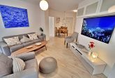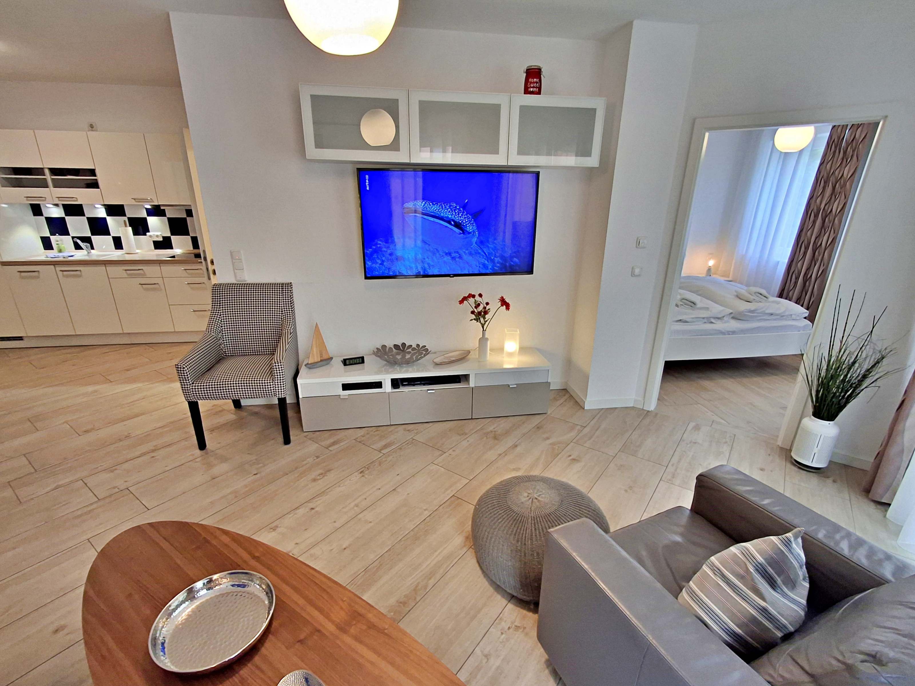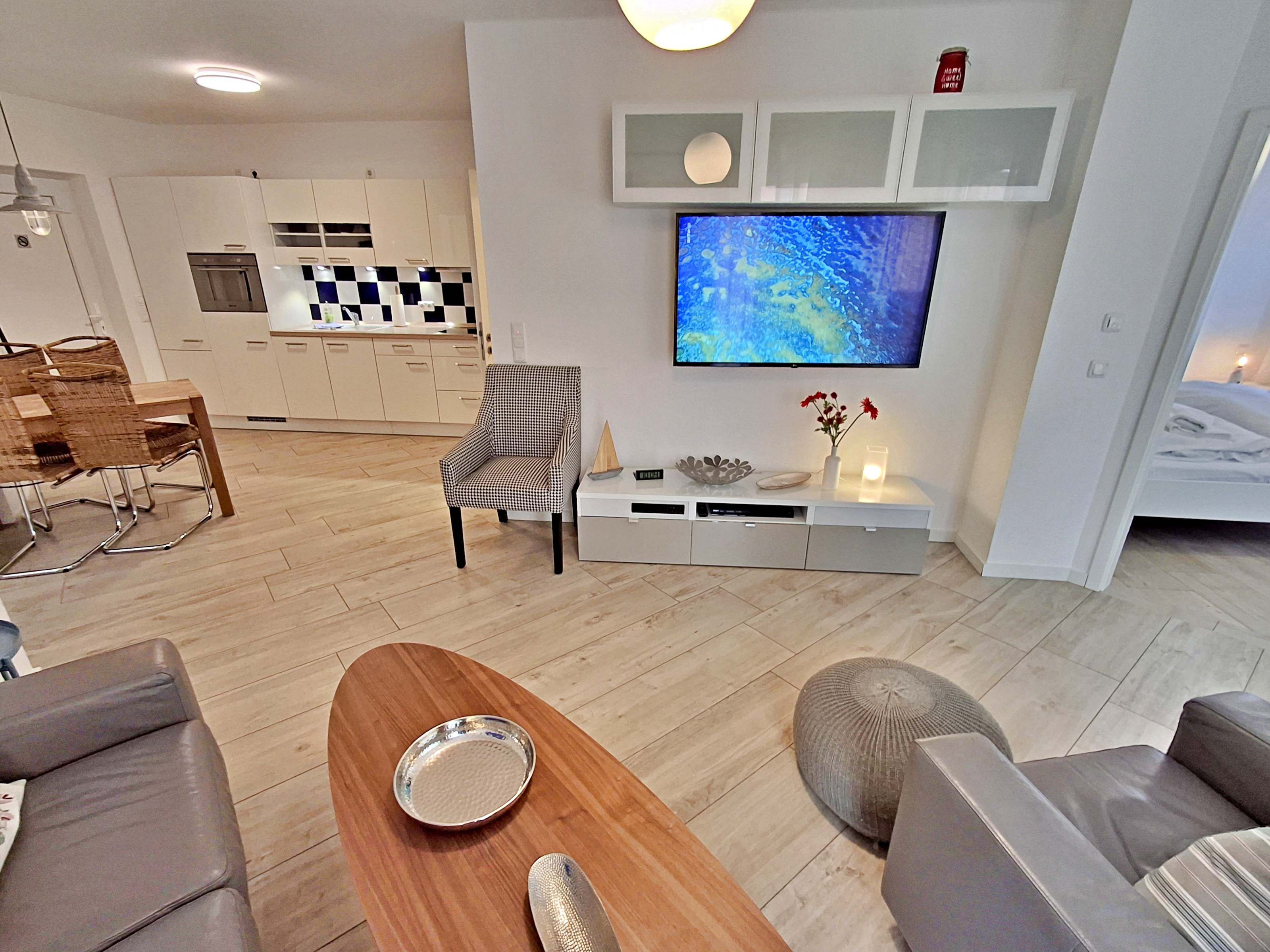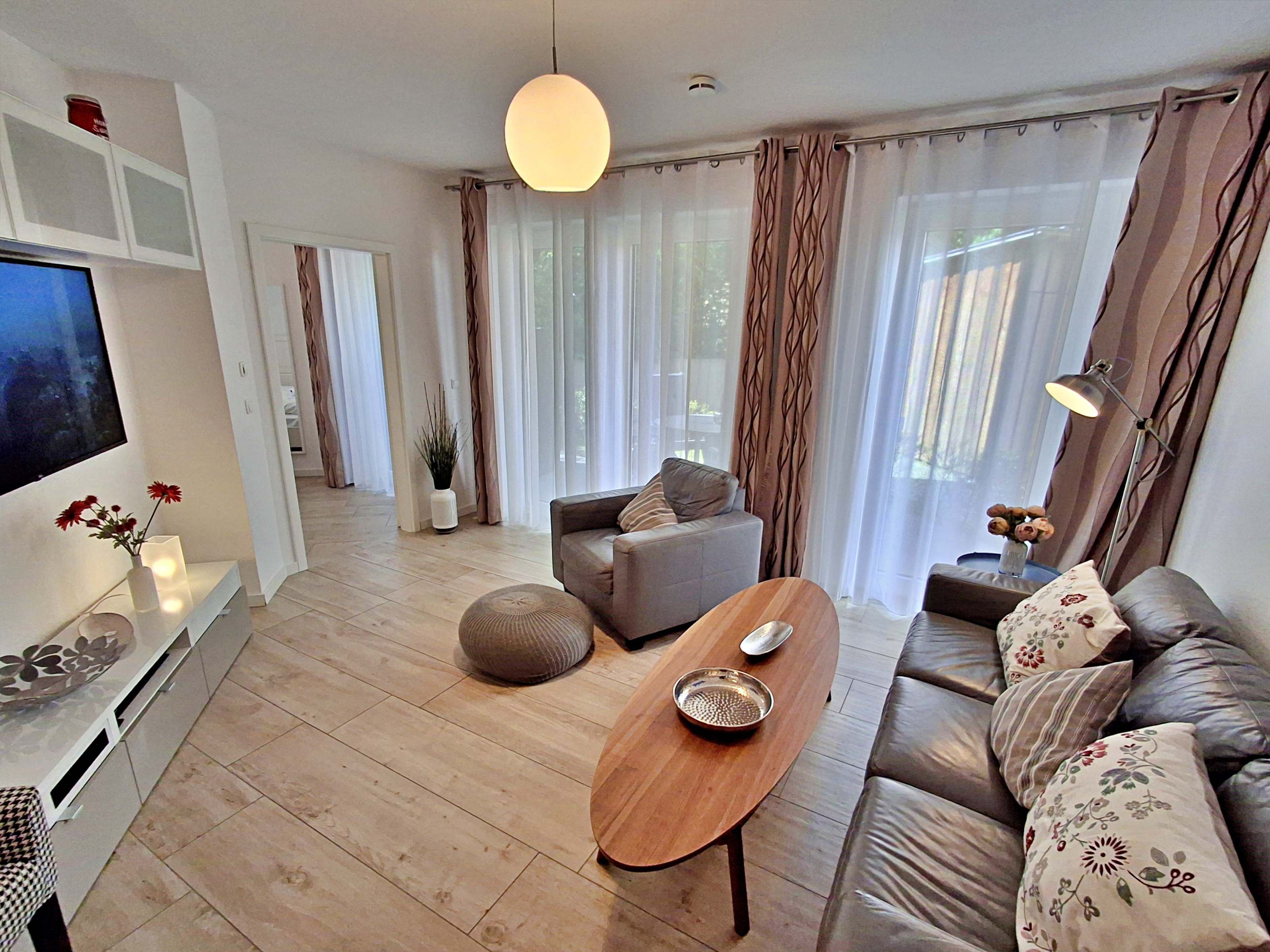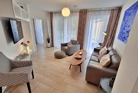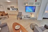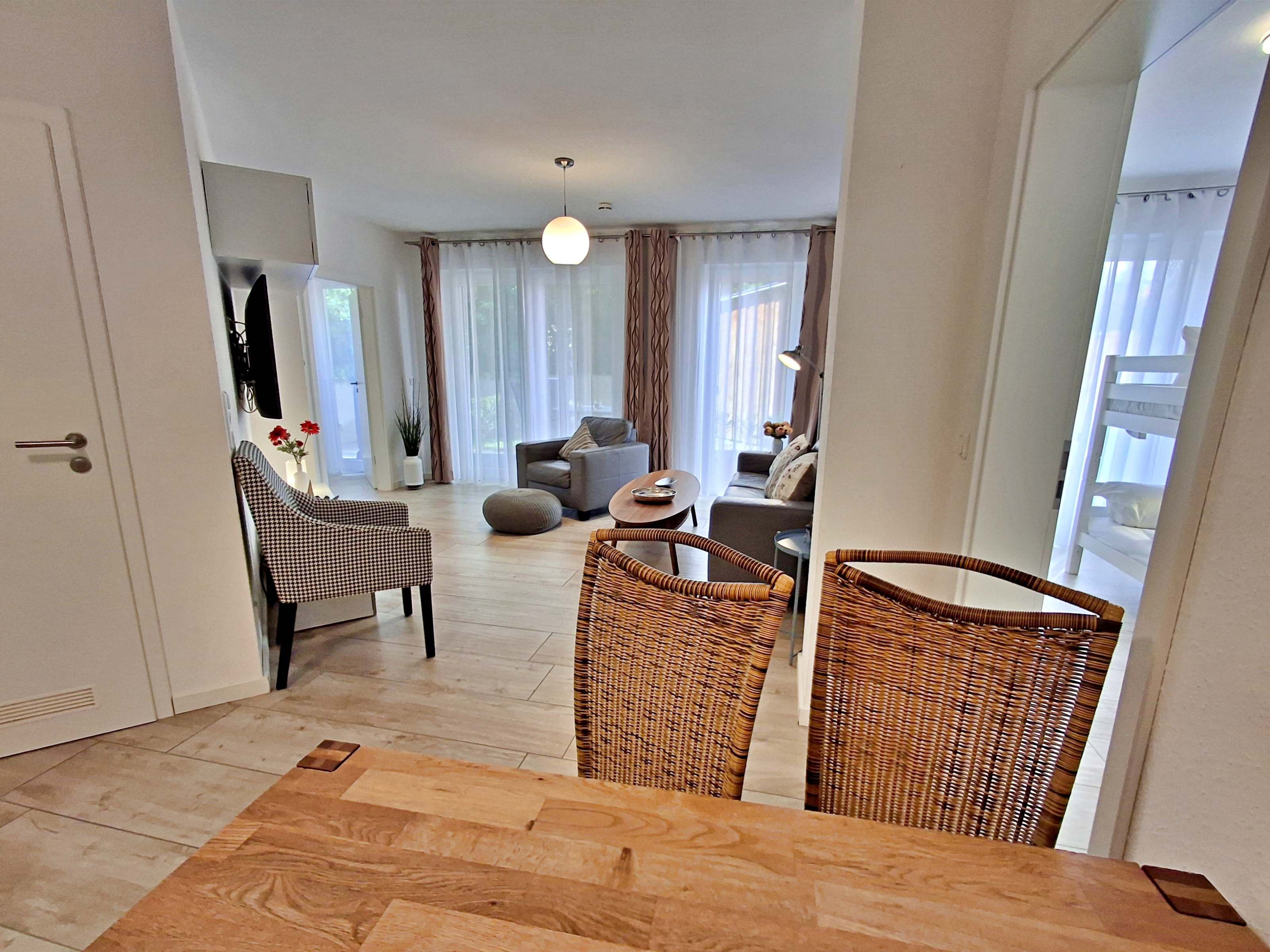 Diese gemütliche Unterkunft im Erdgeschoss bietet auf großzügigen 54 m² ausreichend Platz für bis zu 4 Personen - ideal für eine Familie mit 2 Erwachsenen und 2 Kindern. Im einladenden Wohn- und Essbereich finden Sie eine bequeme Couch, einen Sessel und einen großen Flachbild-TV (55 Zoll), der für entspannte Abende sorgt. Die offene Küche ist komplett ausgestattet und lässt keine Wünsche offen: sie verfügt über ein Induktionskochfeld, Mikrowelle, Heißluftofen, Kühlschrank und Geschirrspüler. Der Essplatz mit 4 Stühlen lädt zu gemeinsamen Mahlzeiten ein. Das erste Schlafzimmer ist mit einem gemütlichen Doppelbett (1,60 x 2 m) ausgestattet, während das zweite Schlafzimmer ein Etagenbett (jeweils 0,90 x 2 m), einen Sekretär und einen weiteren Flachbild-TV bietet. Das moderne Bad verfügt über eine ebenerdige Dusche/WC, eine Handtuchheizung, einen Waschtisch mit Spiegelschrank und einen Fön.