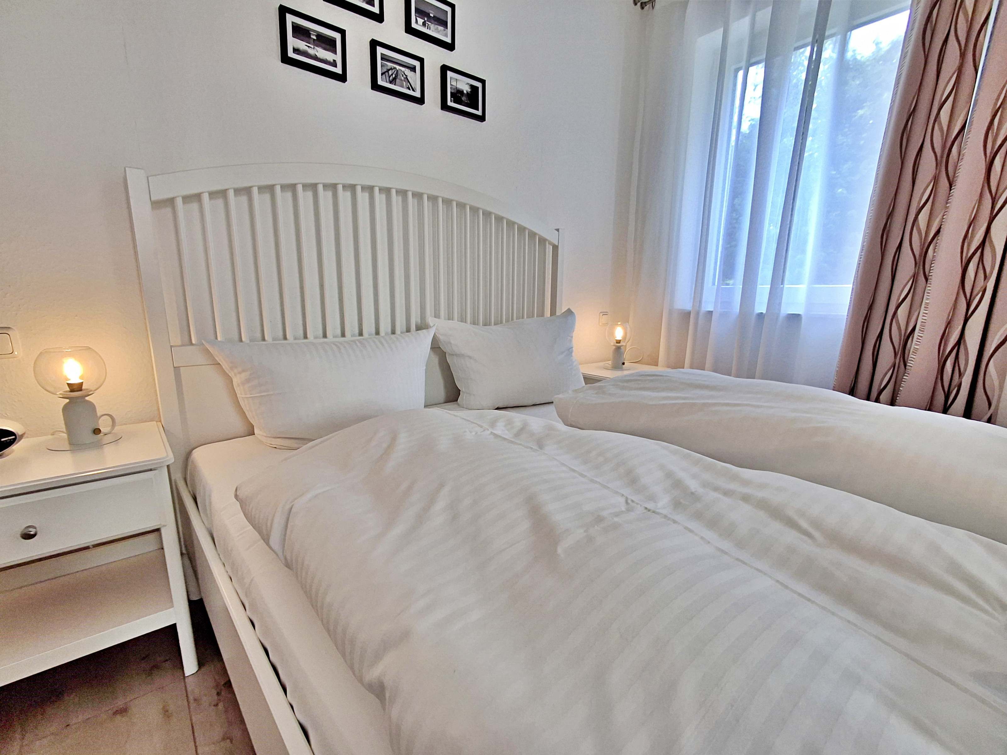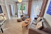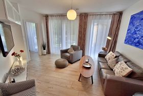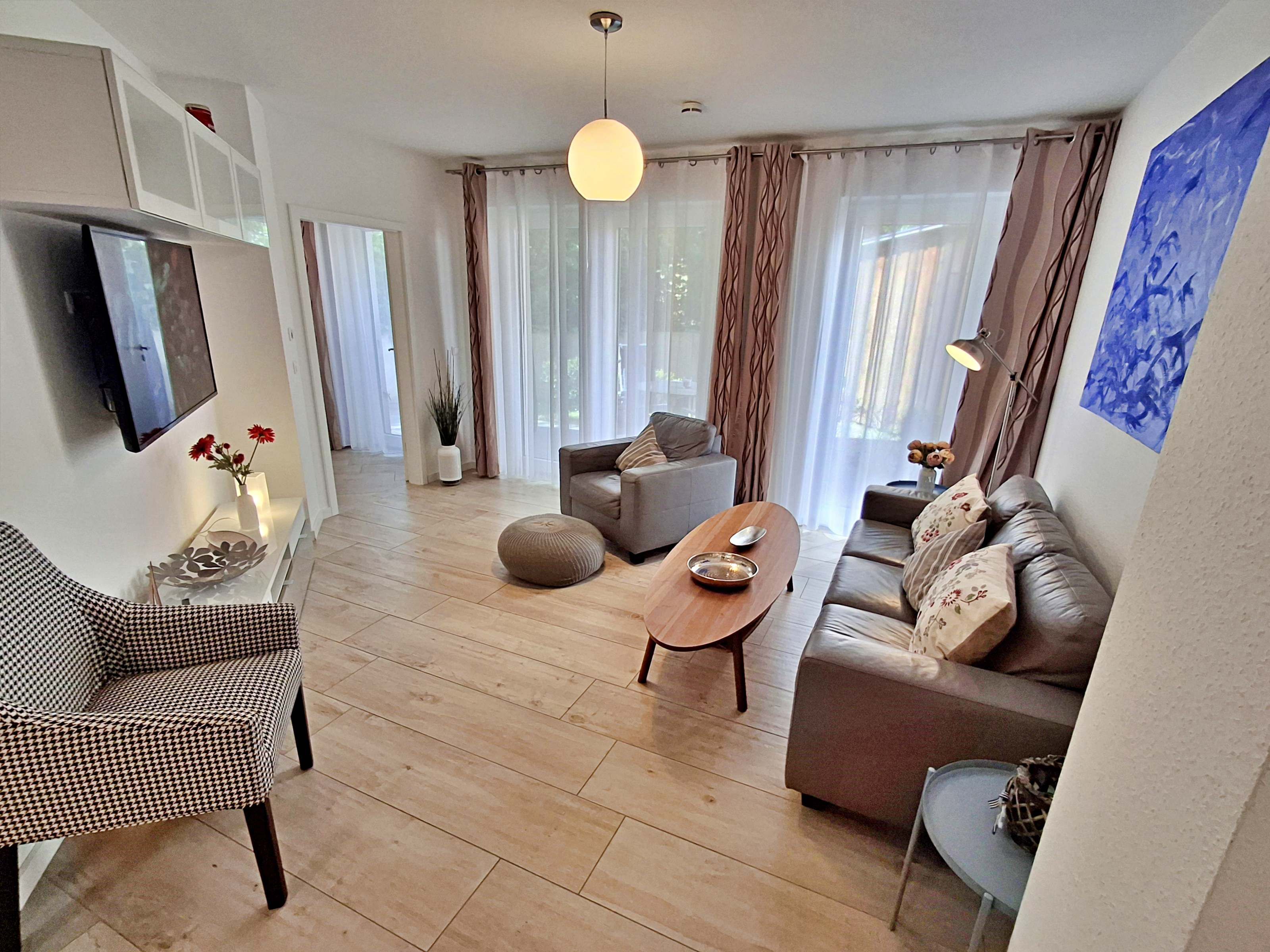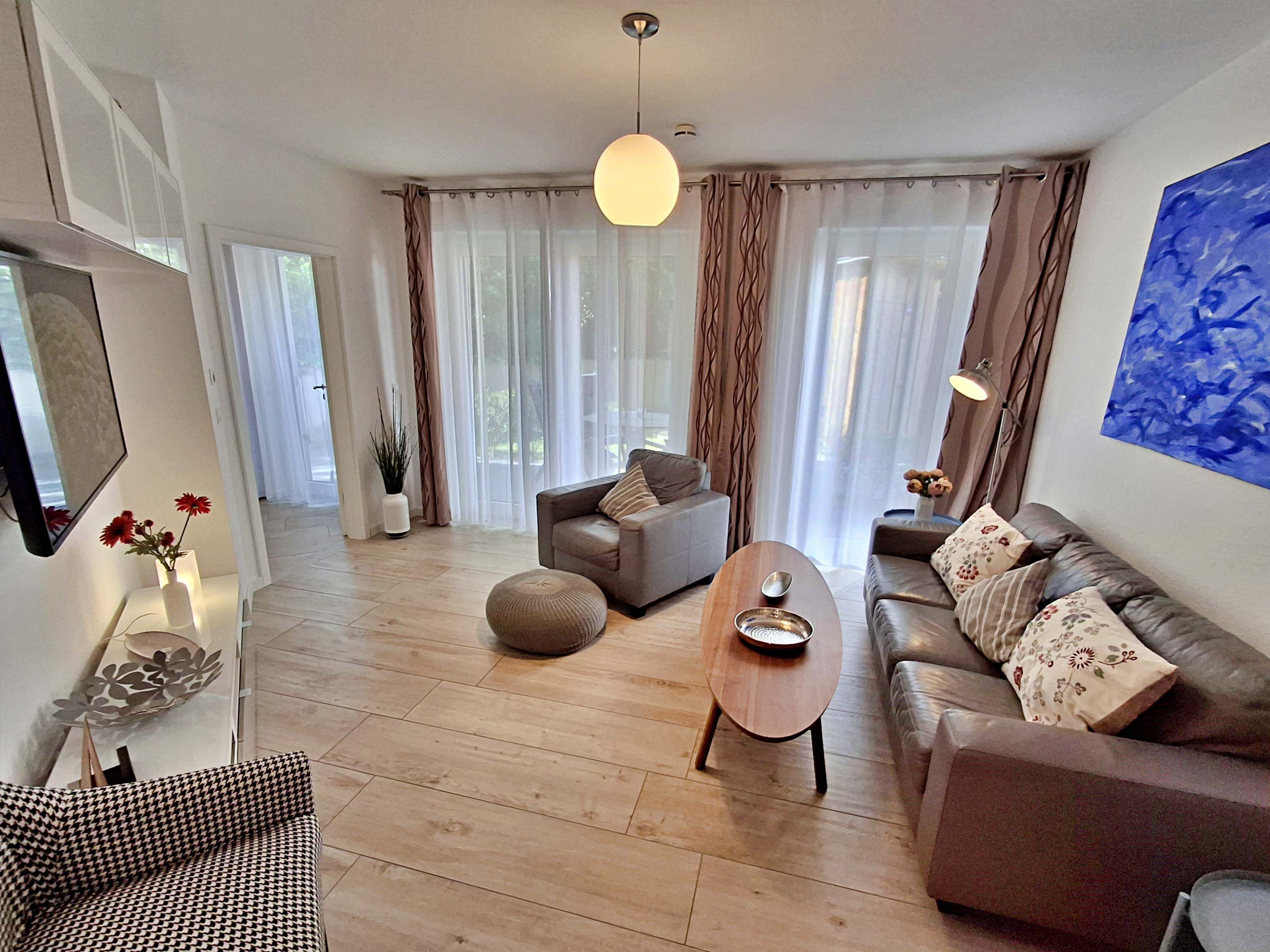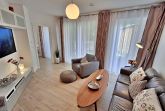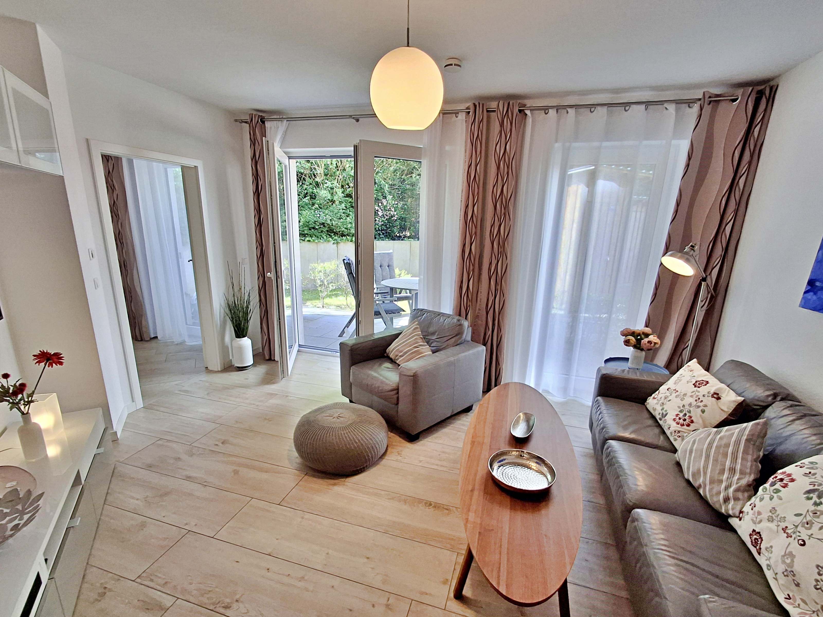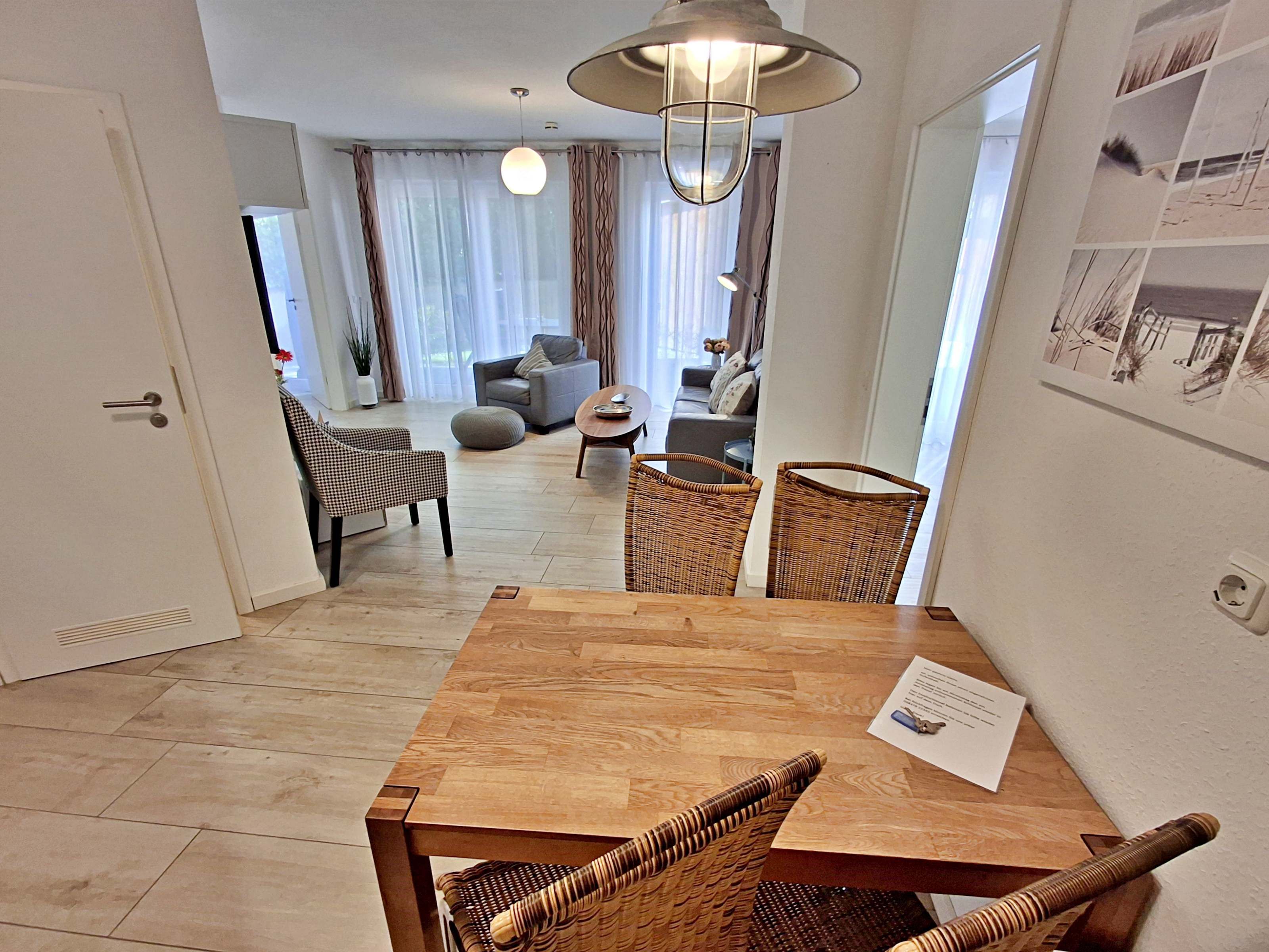 Diese gemütliche Unterkunft im Erdgeschoss bietet auf großzügigen 54 m² ausreichend Platz für bis zu 4 Personen - ideal für eine Familie mit 2 Erwachsenen und 2 Kindern. Im einladenden Wohn- und Essbereich finden Sie eine bequeme Couch, einen Sessel und einen großen Flachbild-TV (55 Zoll), der für entspannte Abende sorgt. Die offene Küche ist komplett ausgestattet und lässt keine Wünsche offen: sie verfügt über ein Induktionskochfeld, Mikrowelle, Heißluftofen, Kühlschrank und Geschirrspüler. Der Essplatz mit 4 Stühlen lädt zu gemeinsamen Mahlzeiten ein. Das erste Schlafzimmer ist mit einem gemütlichen Doppelbett (1,60 x 2 m) ausgestattet, während das zweite Schlafzimmer ein Etagenbett (jeweils 0,90 x 2 m), einen Sekretär und einen weiteren Flachbild-TV bietet. Das moderne Bad verfügt über eine ebenerdige Dusche/WC, eine Handtuchheizung, einen Waschtisch mit Spiegelschrank und einen Fön.
