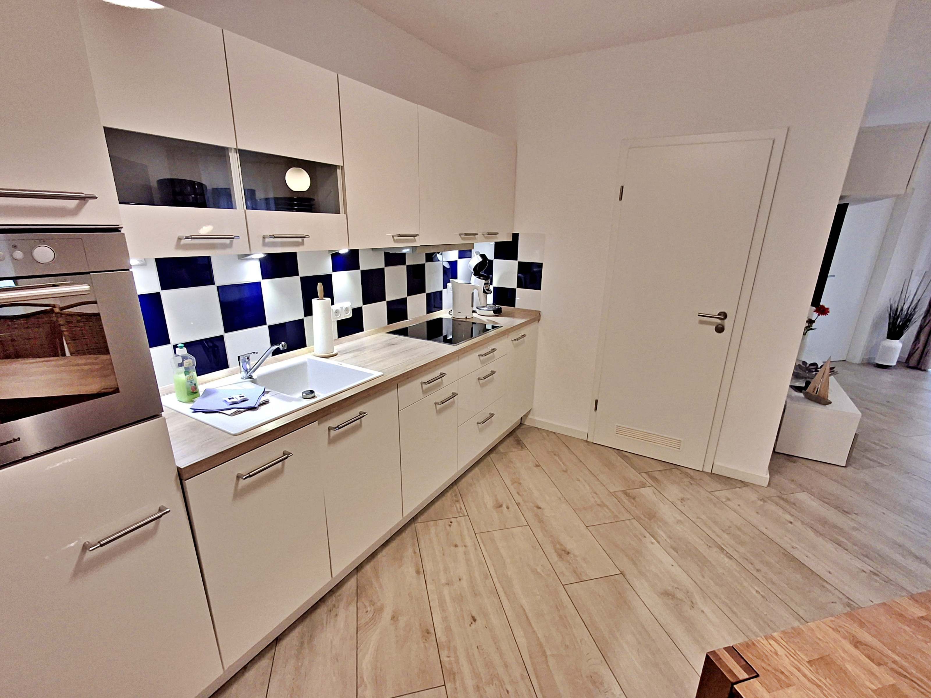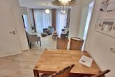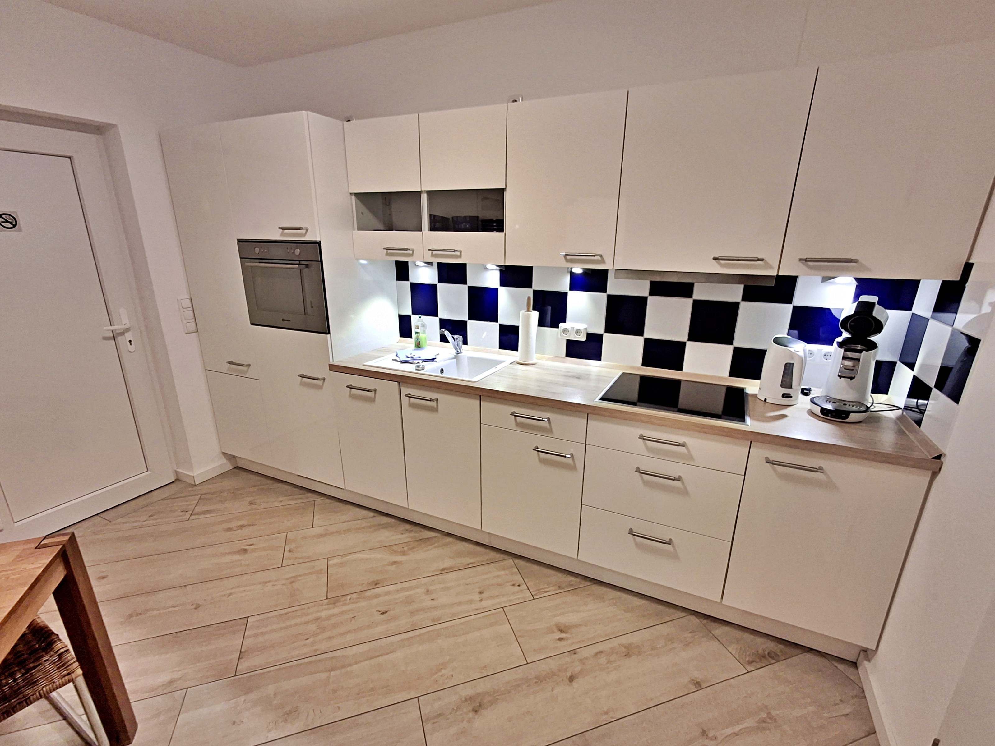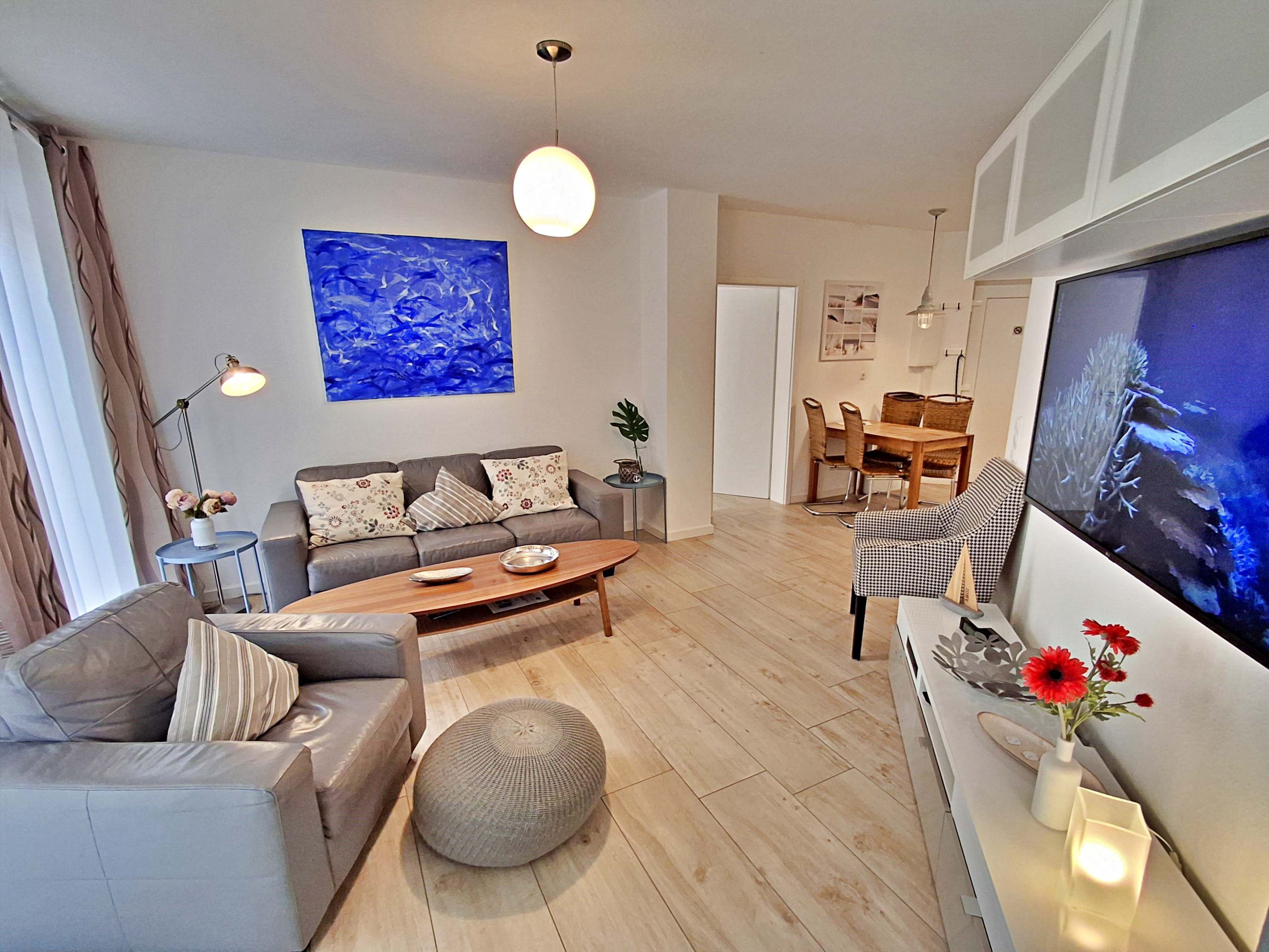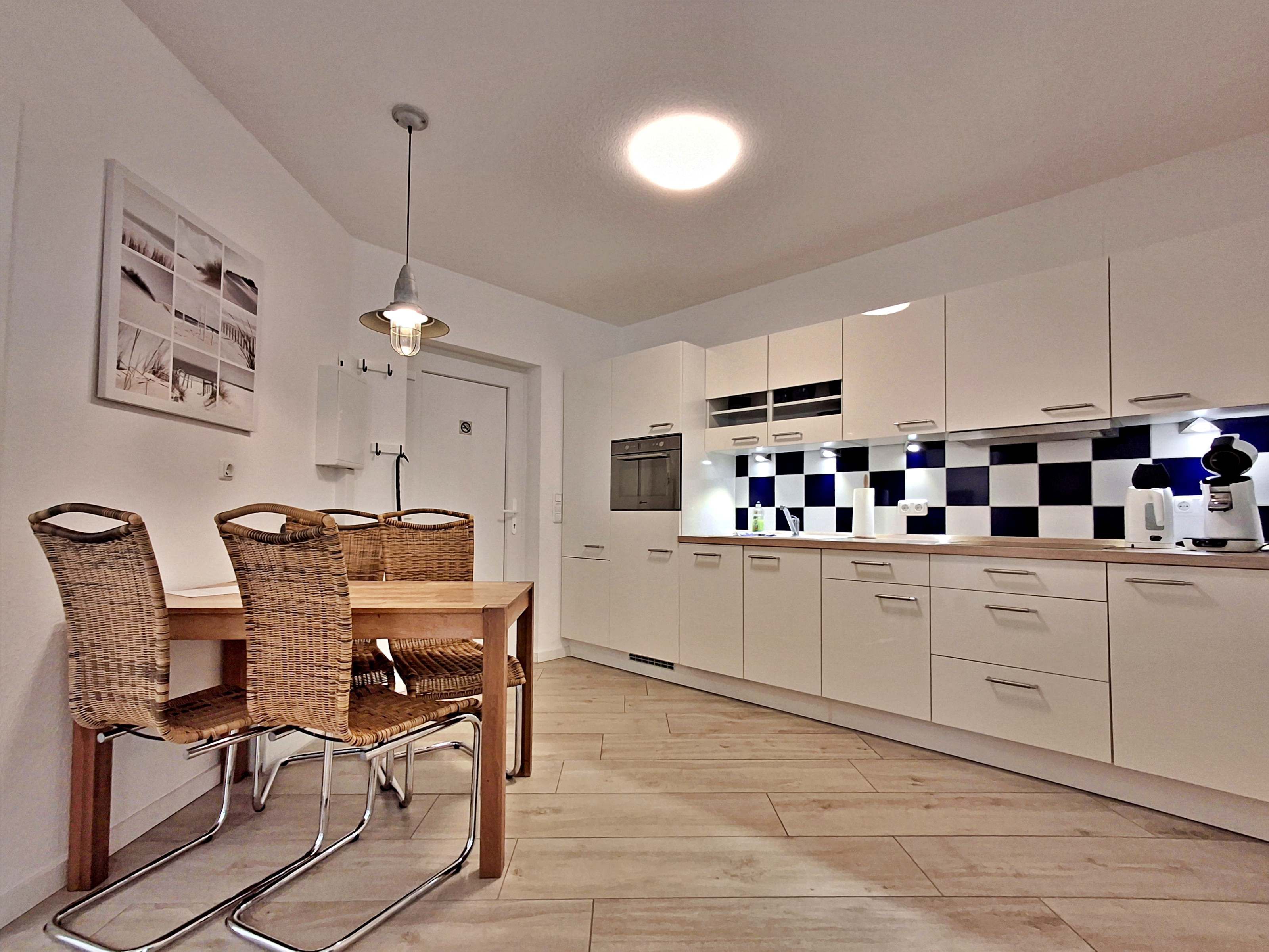 Diese gemütliche Unterkunft im Erdgeschoss bietet auf großzügigen 54 m² ausreichend Platz für bis zu 4 Personen - ideal für eine Familie mit 2 Erwachsenen und 2 Kindern. Im einladenden Wohn- und Essbereich finden Sie eine bequeme Couch, einen Sessel und einen großen Flachbild-TV (55 Zoll), der für entspannte Abende sorgt. Die offene Küche ist komplett ausgestattet und lässt keine Wünsche offen: sie verfügt über ein Induktionskochfeld, Mikrowelle, Heißluftofen, Kühlschrank und Geschirrspüler. Der Essplatz mit 4 Stühlen lädt zu gemeinsamen Mahlzeiten ein. Das erste Schlafzimmer ist mit einem gemütlichen Doppelbett (1,60 x 2 m) ausgestattet, während das zweite Schlafzimmer ein Etagenbett (jeweils 0,90 x 2 m), einen Sekretär und einen weiteren Flachbild-TV bietet. Das moderne Bad verfügt über eine ebenerdige Dusche/WC, eine Handtuchheizung, einen Waschtisch mit Spiegelschrank und einen Fön.