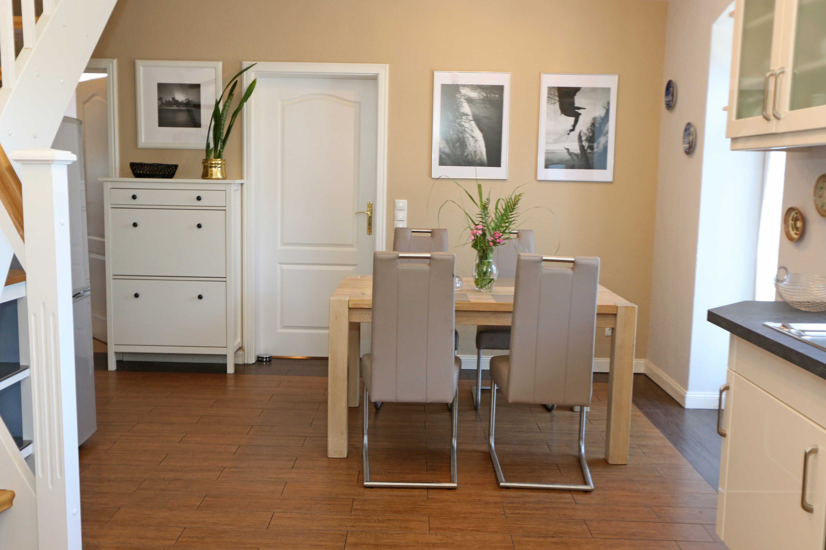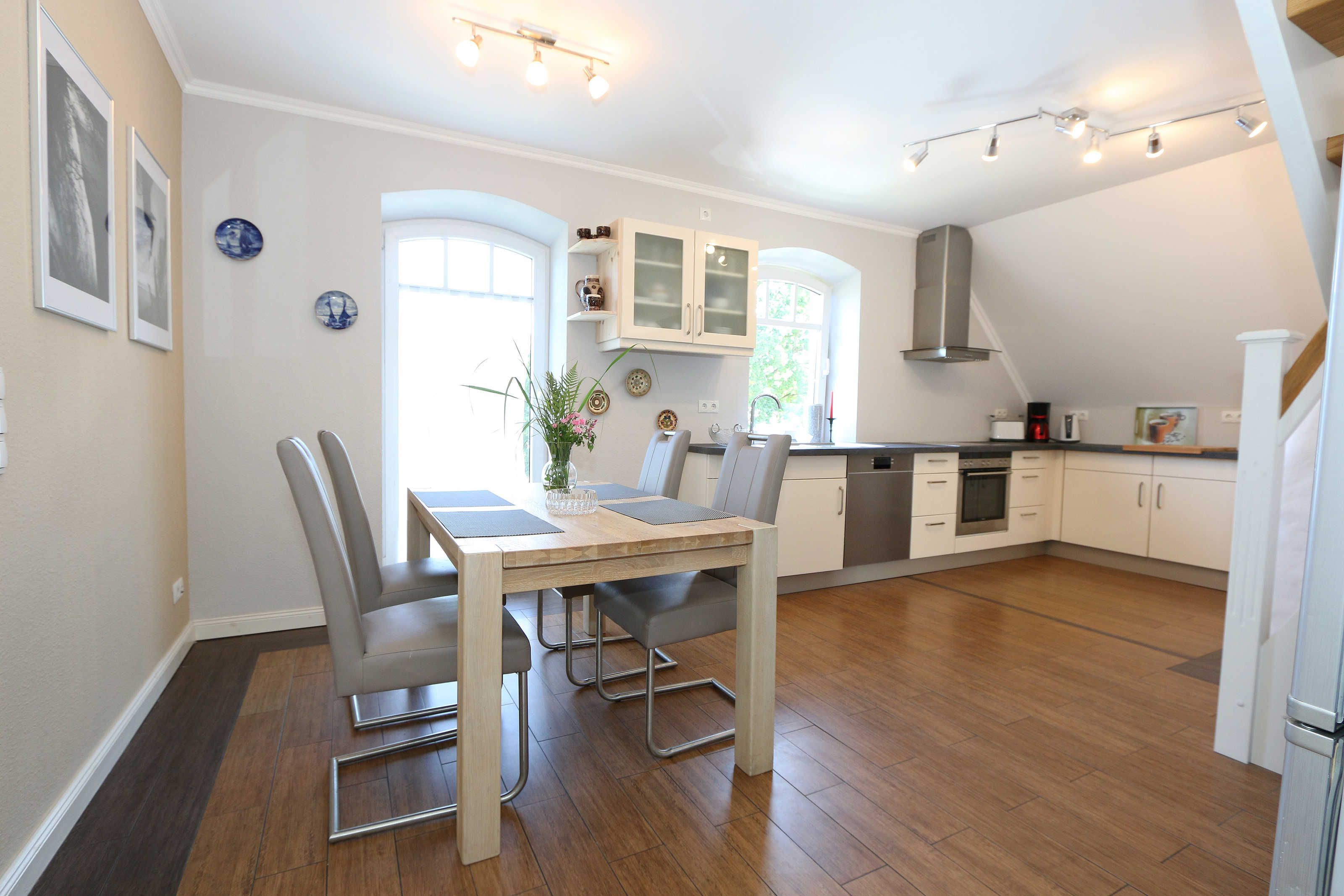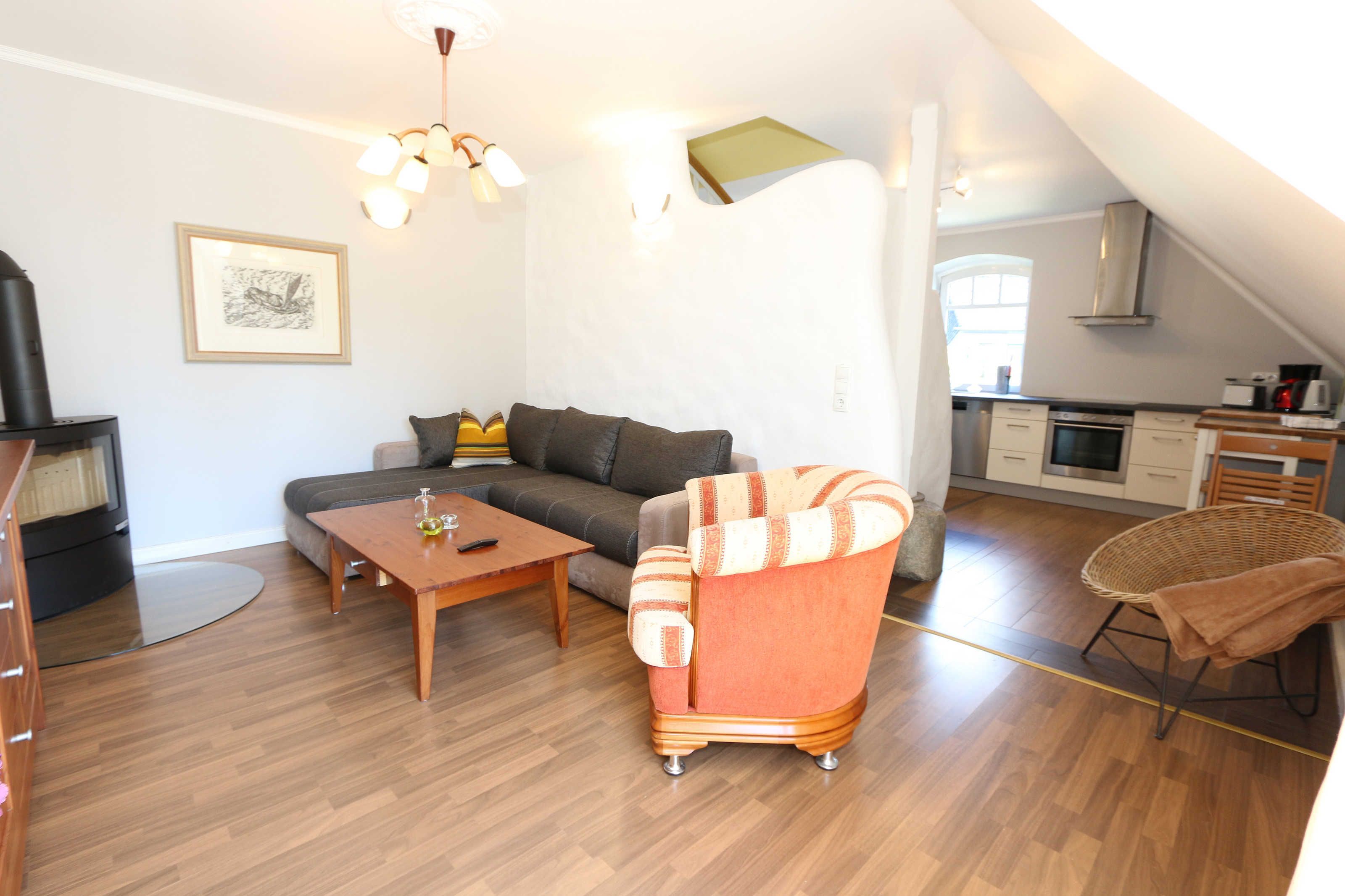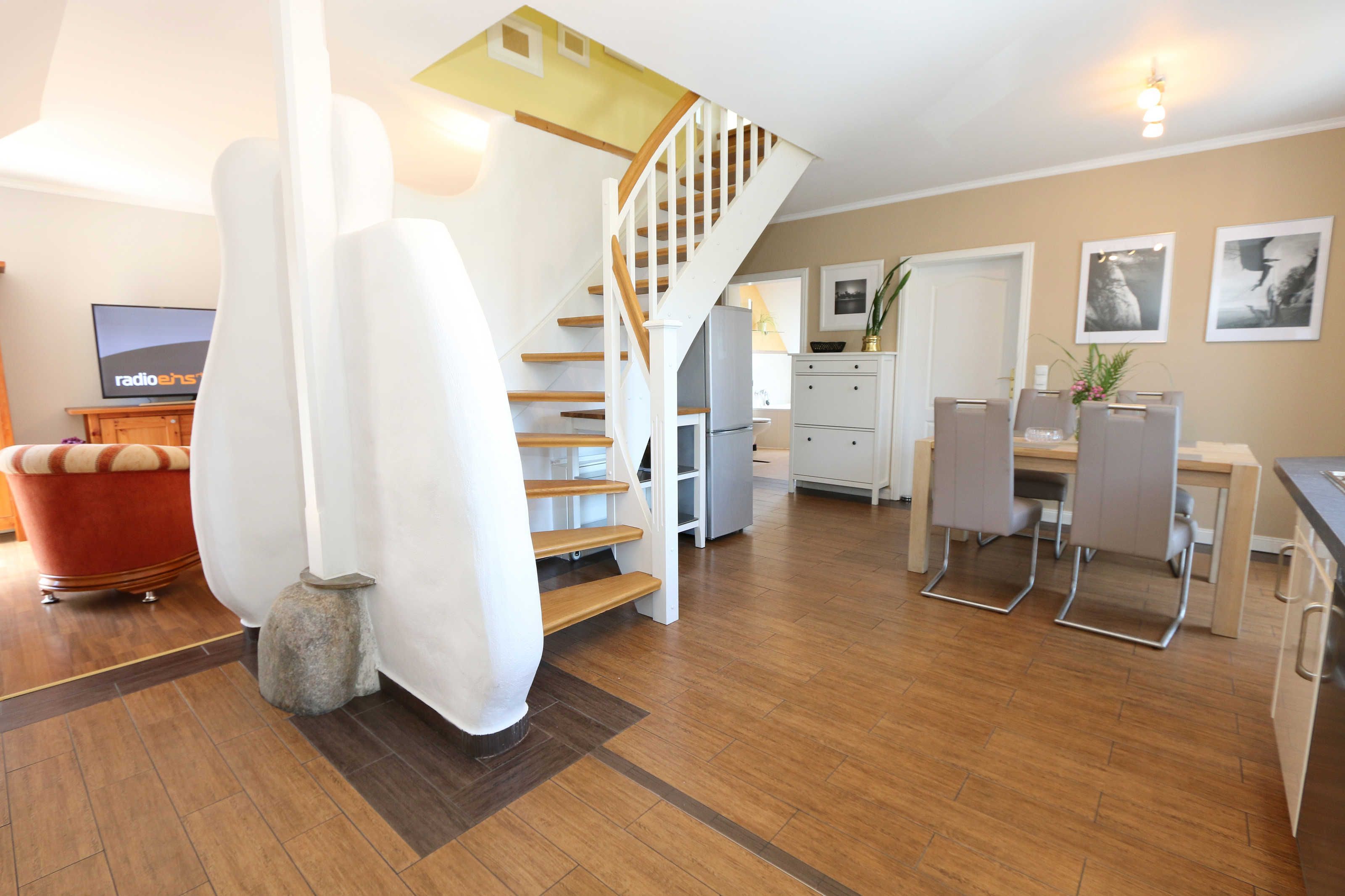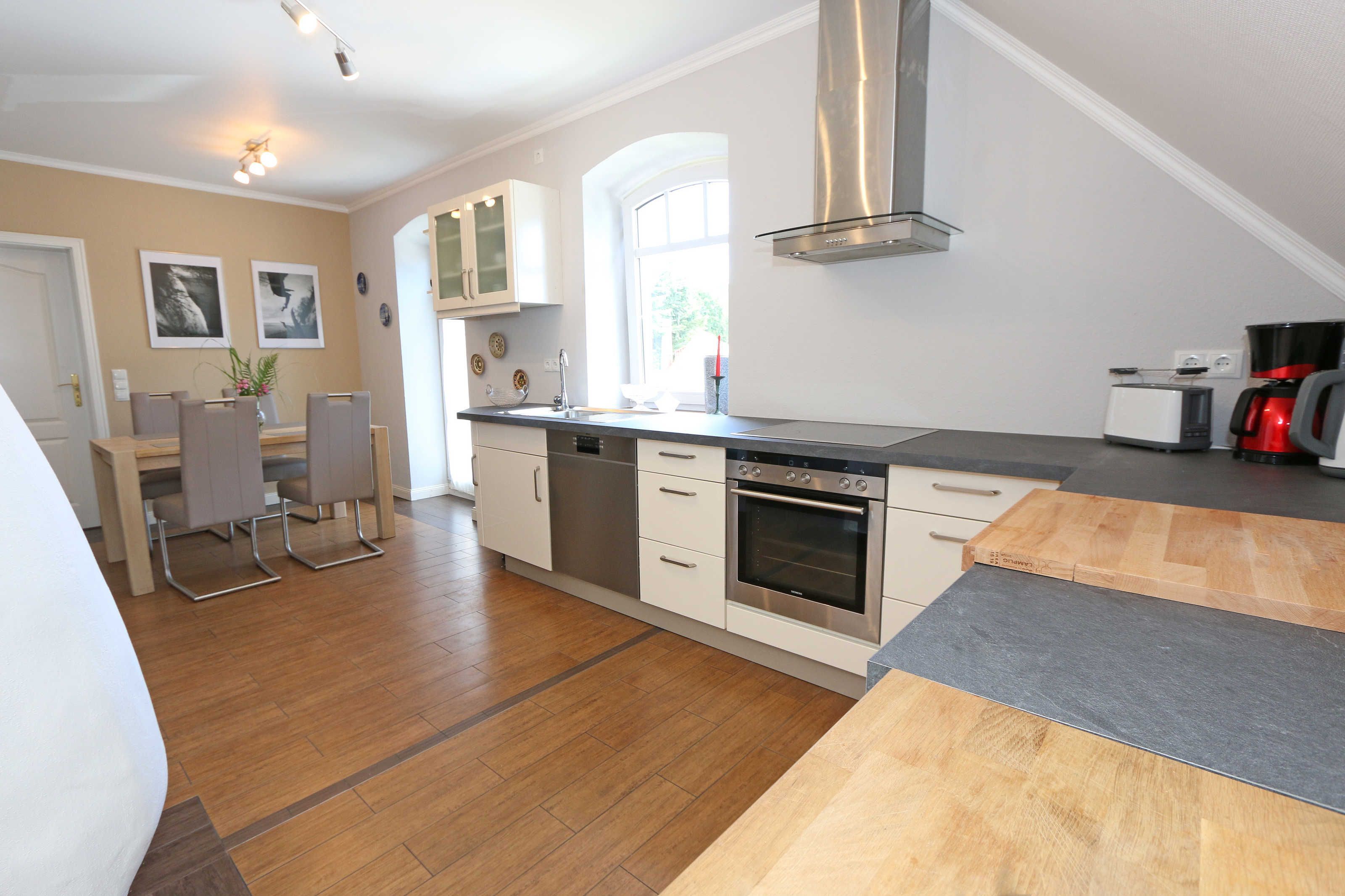 Die großzügige Nichtraucherferienwohnung 02, welche sich über 2 Etagen erstreckt, befindet sich in der 1. Etage des Hauses. Mit Ihren ca. 90 m² bietet Sie ausreichend Platz für max. 6 Erwachsene + 2 Kleinkinder bis 3 Jahre im Kinderreisebett. Auf einer Ebene befinden sich ein Schlafzimmer, ein großes Bad sowie die großzügige Küche mit angrenzendem Wohnbereich. Der gemütliche Wohnbereich umfasst eine große Couchecke mit Couchtisch, Leselampe, Sideboard, Smart-TV sowie eine Mini-Stereo-Anlage. An kühleren Tagen sorgt ein Kamin für Gemütlichkeit und Wärme. Auch auf einen Internetanschluss (WLAN) brauchen Sie im Urlaub nicht verzichten. Dieser ist inklusive für Sie. Von hier gelangen Sie auf den bestuhlten Süd/West Balkon. Die angrenzende und vollausgestattete Küche verfügt über einen Geschirrspüler, Backofen mit Ceranfeld und Abzugshaube, einen großen Kühlschrank mit Eisfach, Mikrowelle, Kaffeemaschine, Toaster, Wasserkocher und diverse Küchenutensilien. Ein Esstisch rundet diesen Bereich ab. Das 1. Schlafzimmer verfügt über ein Doppelbett (1,80 m x 2,00 m), verstellbare Lattenroste, Nachttischablagen, einen Kleiderschrank, Verdunklungsmöglichkeit sowie ein Smart-TV. Das großzügige Tageslicht-Bad umfasst eine Eckbadewanne, eine Dusche, ein WC, einen Waschtisch sowie einen Fön. Über eine Treppe vom Küchenbereich gelangen Sie in die obere Etage. Das 2. Schlafzimmer mit Dachschrägen verfügt über ein Doppelbett (1,80 m x 2,00 m), einen Kleiderschrank, Verdunklungsmöglichkeiten sowie einen Schreibtisch. Das 3. Schlafzimmer verfügt über ein Doppelbett (1,60 m x 2,00 m), verstellbare Lattenroste, Nachttischablagen, einen Kleiderschrank, Verdunklungsmöglichkeiten sowie einen Smart-TV. Ein Gäste-WC mit kleinem Waschbecken rundet die obere Etage ab. Alle Räumlichkeiten wurden mit Fliesen sowie einer Fußbodenheizung ausgestattet. Mit einem eigenen und mitgebrachten Schlafplatz sind max. 2 Haustiere gegen eine Gebühr gern gesehene Gäste. Ihre mitgebrachten oder auch geliehenen Fahrräder können Sie im Schuppen unterstellen. Im separaten Waschhaus können Sie gegen eine Kasse des Vertrauens eine Waschmaschine und einen Trockner nutzen. Ein PKW-Stellplatz mit Ladestation befindet sich direkt am Haus. Die Erstausstattung eines Wäschepaketes (komplette Bettwäsche, 1 Duschhandtuch, 1 kleines Handtuch) können Sie bis 14 Tage vor Anreise gegen einen Aufpreis dazu buchen oder durch eigene ergänzen. Ab 2 gebuchten Paketen erhalten Sie einmalig 1 Geschirrhandtuch und 1 Duschvorleger hinzu.