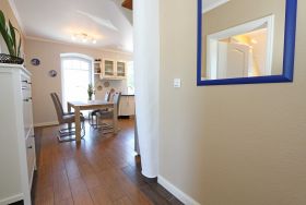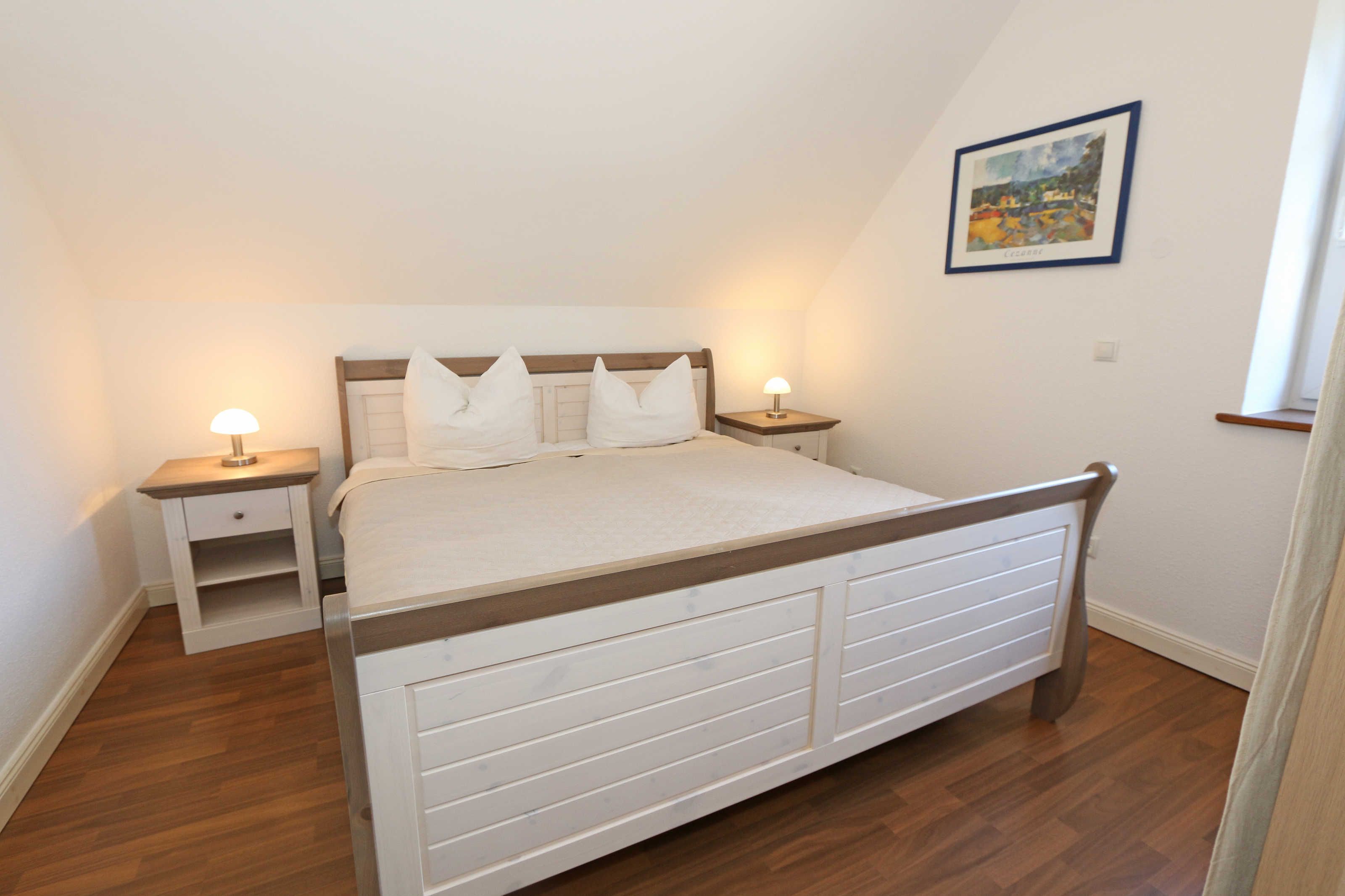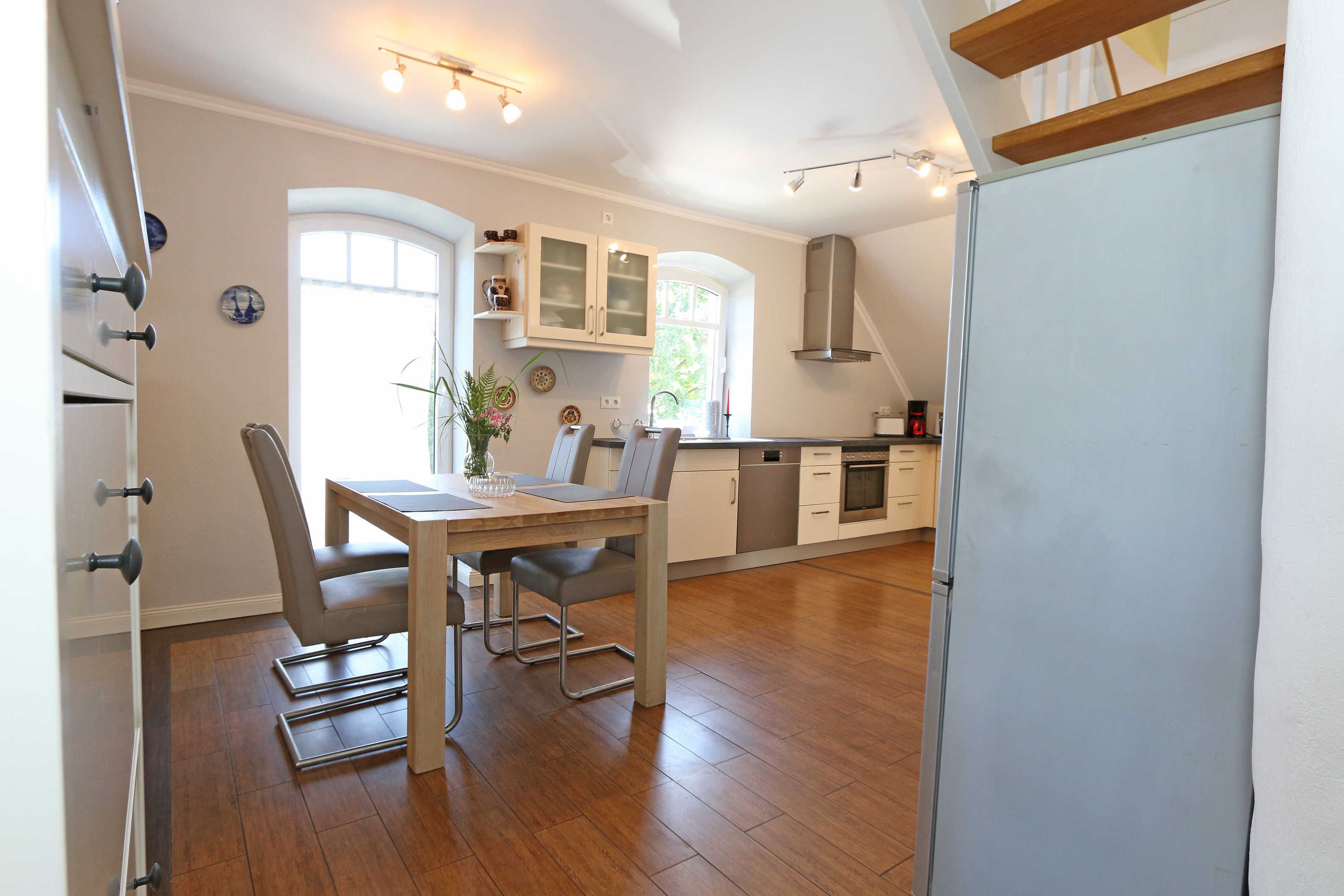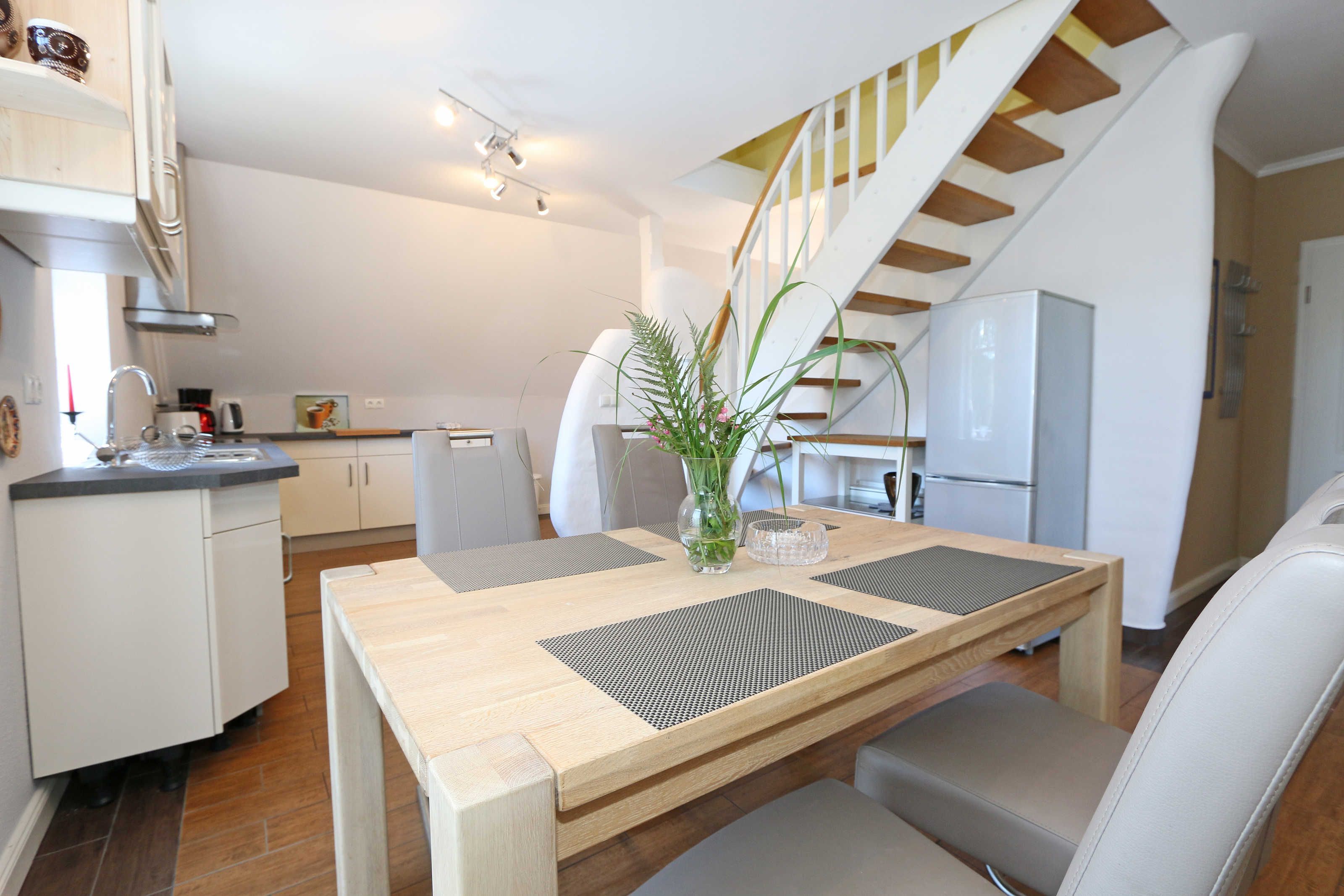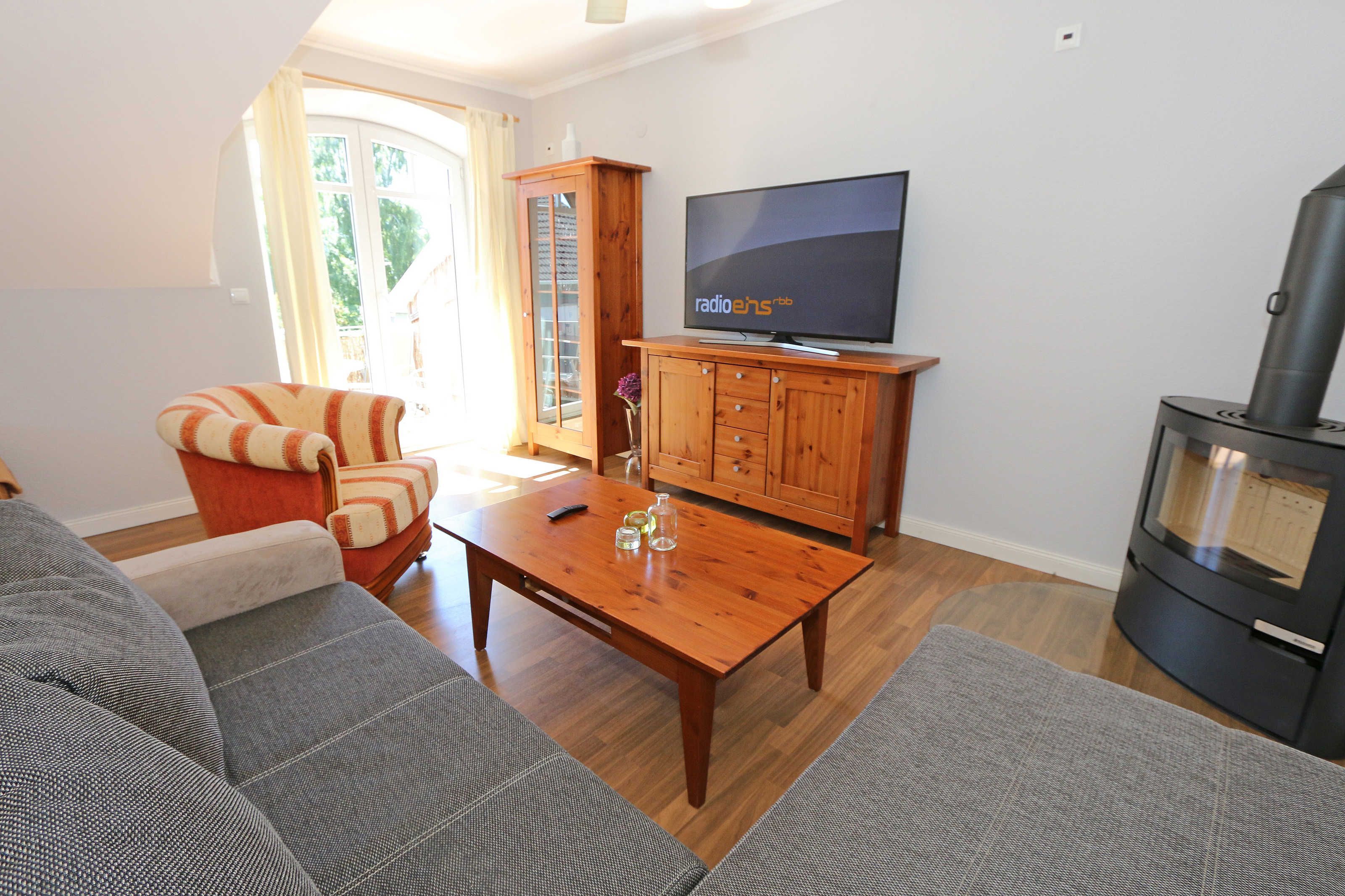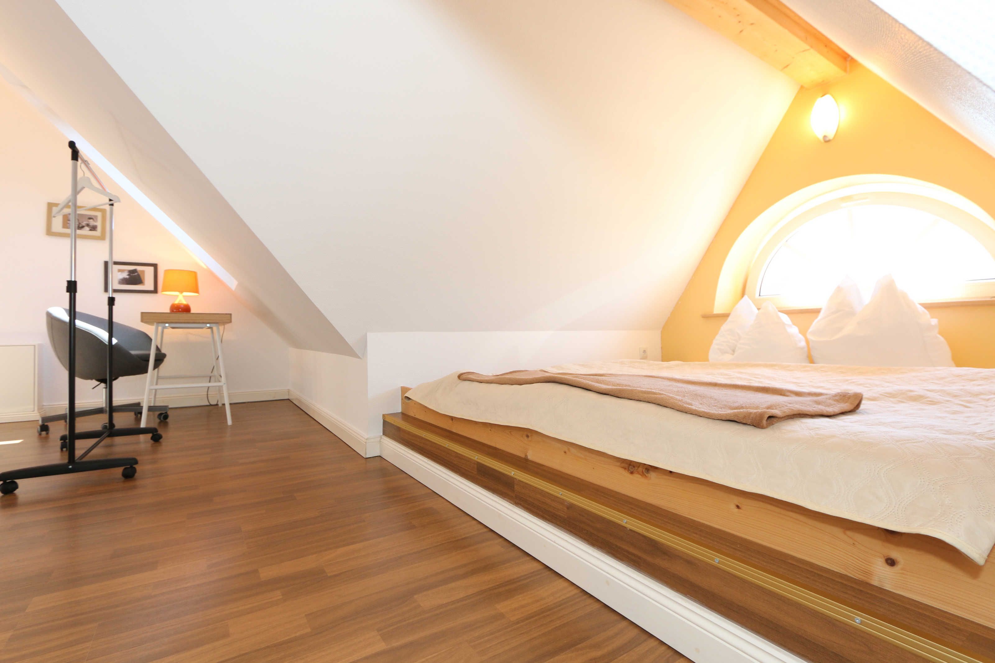 Die großzügige Nichtraucherferienwohnung 02, welche sich über 2 Etagen erstreckt, befindet sich in der 1. Etage des Hauses. Mit Ihren ca. 90 m² bietet Sie ausreichend Platz für max. 6 Erwachsene + 2 Kleinkinder bis 3 Jahre im Kinderreisebett. Auf einer Ebene befinden sich ein Schlafzimmer, ein großes Bad sowie die großzügige Küche mit angrenzendem Wohnbereich. Der gemütliche Wohnbereich umfasst eine große Couchecke mit Couchtisch, Leselampe, Sideboard, Smart-TV sowie eine Mini-Stereo-Anlage. An kühleren Tagen sorgt ein Kamin für Gemütlichkeit und Wärme. Auch auf einen Internetanschluss (WLAN) brauchen Sie im Urlaub nicht verzichten. Dieser ist inklusive für Sie. Von hier gelangen Sie auf den bestuhlten Süd/West Balkon. Die angrenzende und vollausgestattete Küche verfügt über einen Geschirrspüler, Backofen mit Ceranfeld und Abzugshaube, einen großen Kühlschrank mit Eisfach, Mikrowelle, Kaffeemaschine, Toaster, Wasserkocher und diverse Küchenutensilien. Ein Esstisch rundet diesen Bereich ab. Das 1. Schlafzimmer verfügt über ein Doppelbett (1,80 m x 2,00 m), verstellbare Lattenroste, Nachttischablagen, einen Kleiderschrank, Verdunklungsmöglichkeit sowie ein Smart-TV. Das großzügige Tageslicht-Bad umfasst eine Eckbadewanne, eine Dusche, ein WC, einen Waschtisch sowie einen Fön. Über eine Treppe vom Küchenbereich gelangen Sie in die obere Etage. Das 2. Schlafzimmer mit Dachschrägen verfügt über ein Doppelbett (1,80 m x 2,00 m), einen Kleiderschrank, Verdunklungsmöglichkeiten sowie einen Schreibtisch. Das 3. Schlafzimmer verfügt über ein Doppelbett (1,60 m x 2,00 m), verstellbare Lattenroste, Nachttischablagen, einen Kleiderschrank, Verdunklungsmöglichkeiten sowie einen Smart-TV. Ein Gäste-WC mit kleinem Waschbecken rundet die obere Etage ab. Alle Räumlichkeiten wurden mit Fliesen sowie einer Fußbodenheizung ausgestattet. Mit einem eigenen und mitgebrachten Schlafplatz sind max. 2 Haustiere gegen eine Gebühr gern gesehene Gäste. Ihre mitgebrachten oder auch geliehenen Fahrräder können Sie im Schuppen unterstellen. Im separaten Waschhaus können Sie gegen eine Kasse des Vertrauens eine Waschmaschine und einen Trockner nutzen. Ein PKW-Stellplatz mit Ladestation befindet sich direkt am Haus. Die Erstausstattung eines Wäschepaketes (komplette Bettwäsche, 1 Duschhandtuch, 1 kleines Handtuch) können Sie bis 14 Tage vor Anreise gegen einen Aufpreis dazu buchen oder durch eigene ergänzen. Ab 2 gebuchten Paketen erhalten Sie einmalig 1 Geschirrhandtuch und 1 Duschvorleger hinzu.