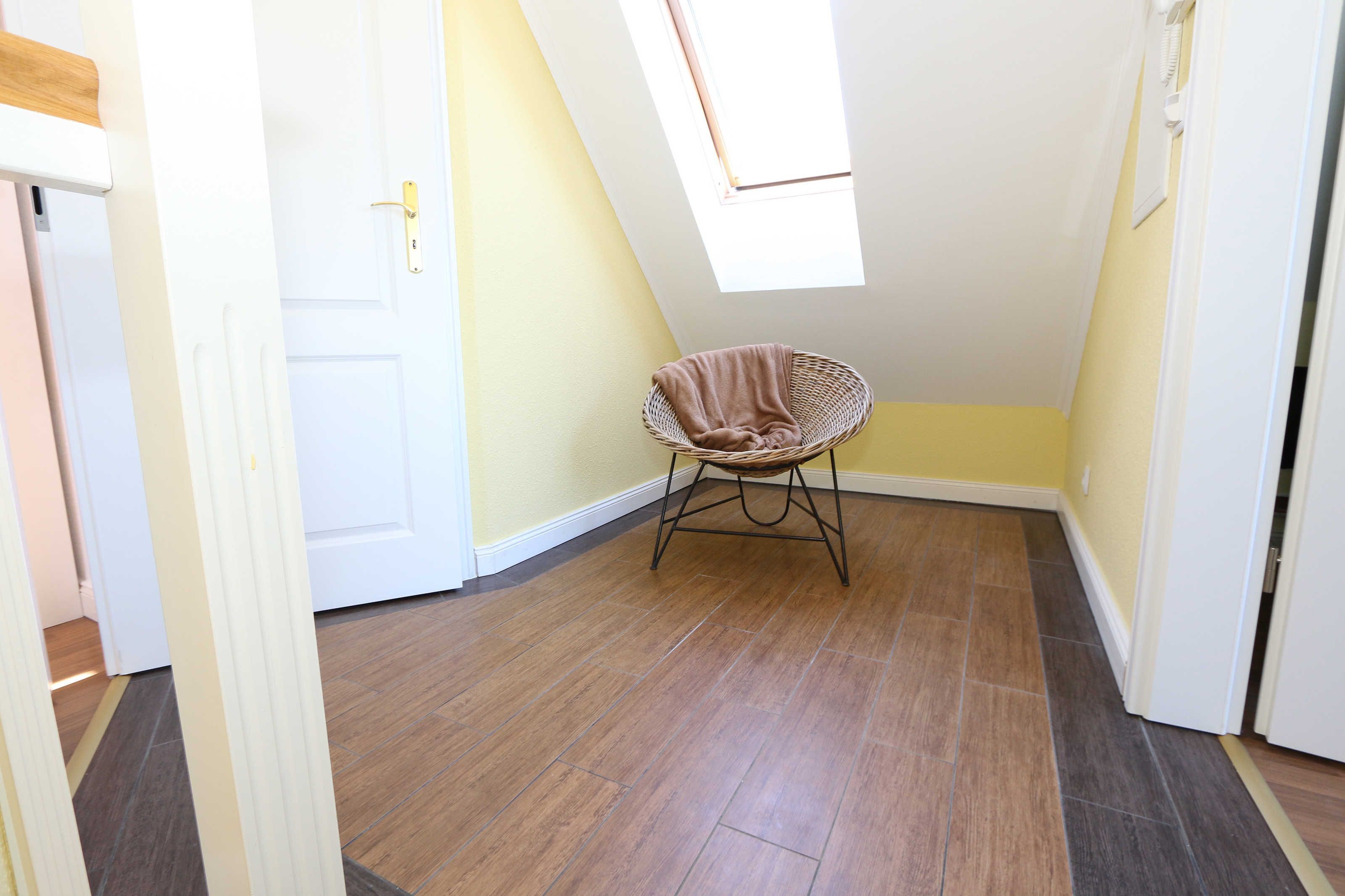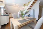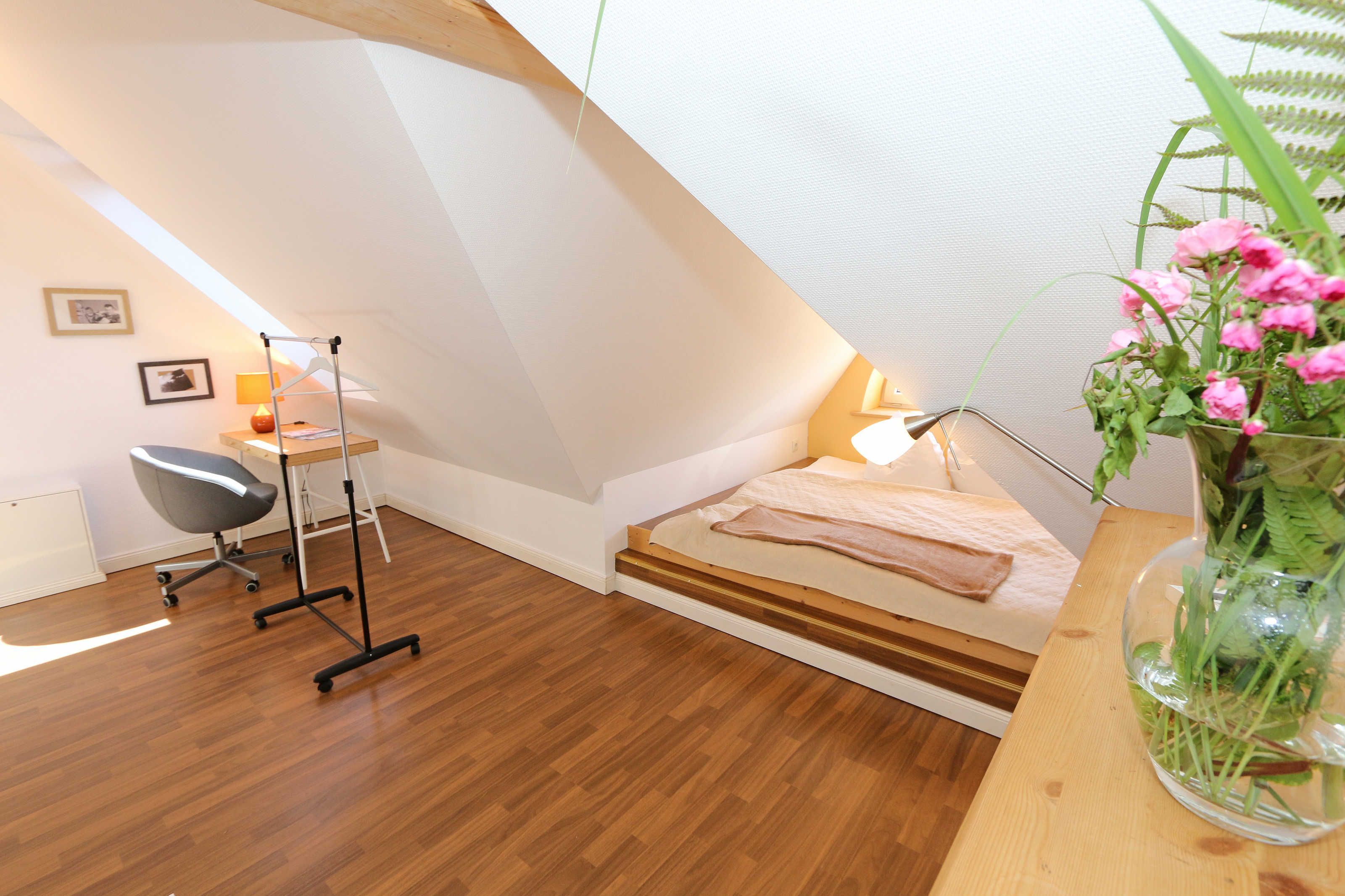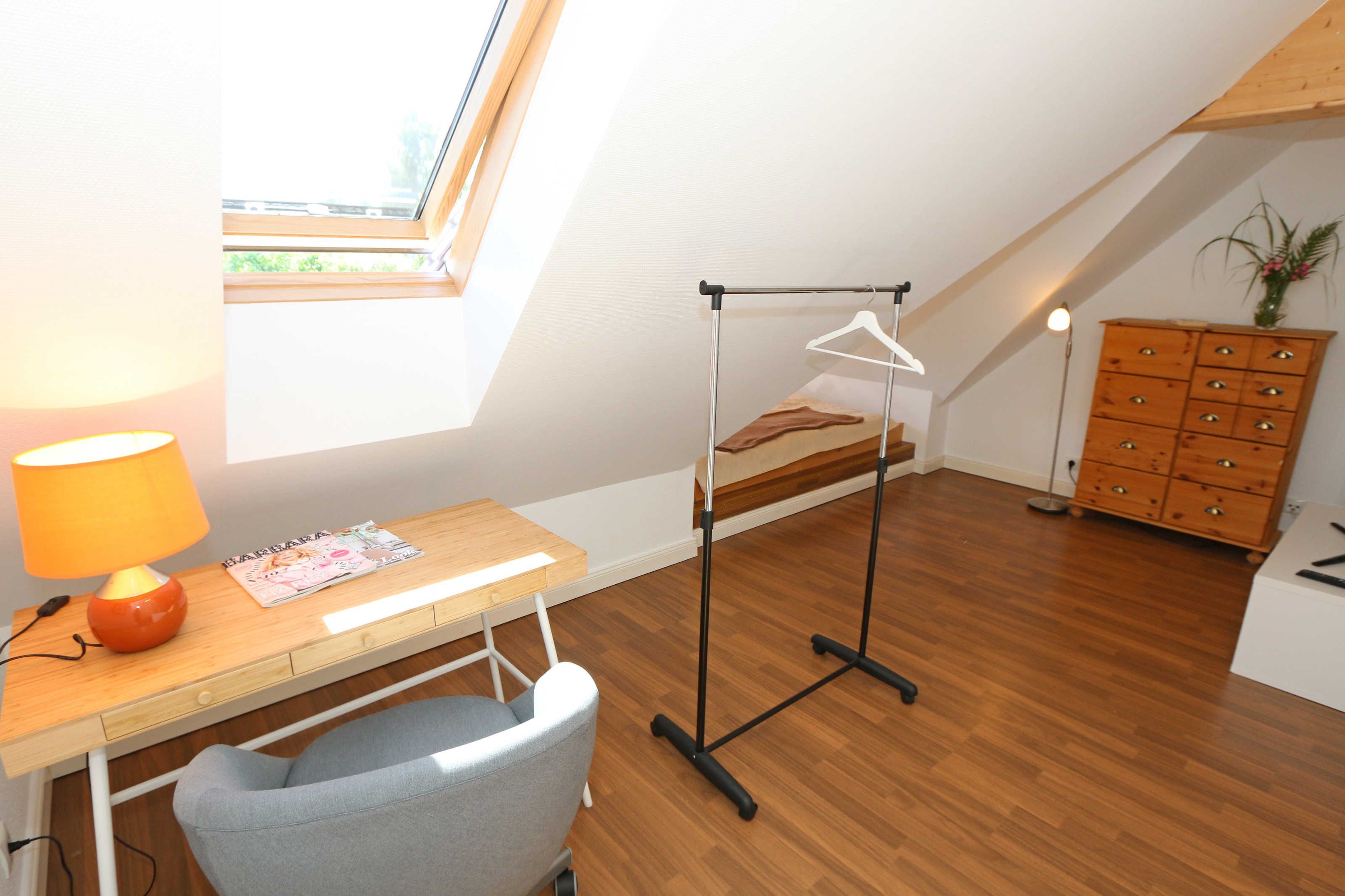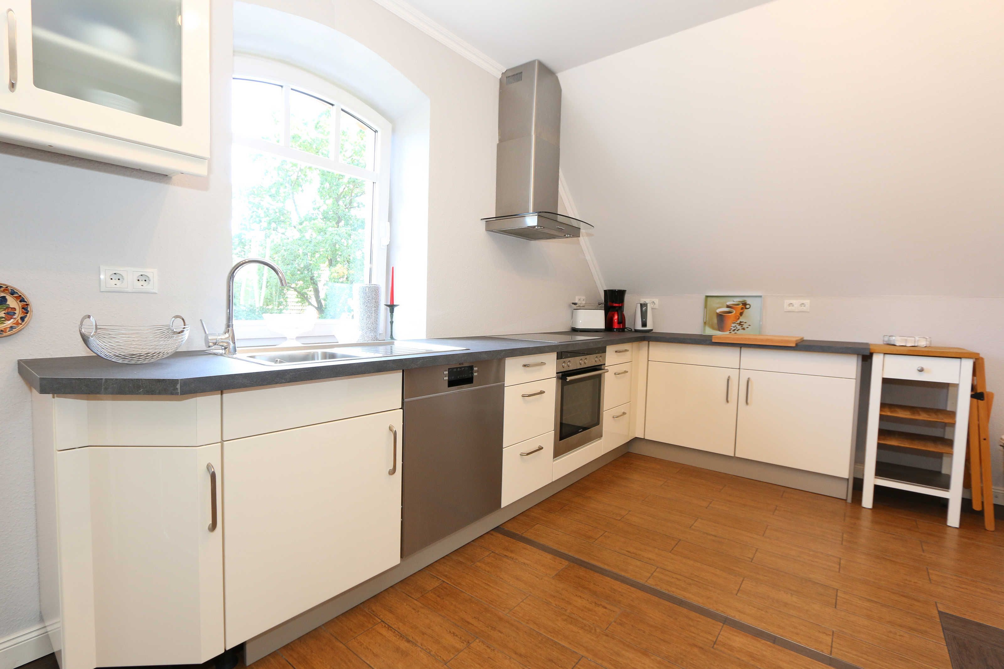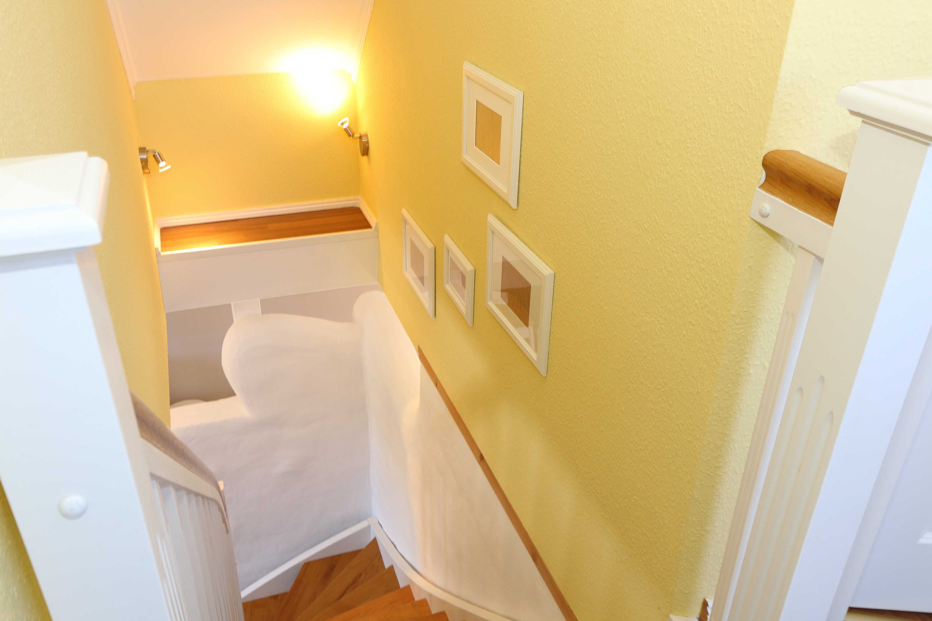Die großzügige Nichtraucherferienwohnung 02, welche sich über 2 Etagen erstreckt, befindet sich in der 1. Etage des Hauses. Mit Ihren ca. 90 m² bietet Sie ausreichend Platz für max. 6 Erwachsene + 2 Kleinkinder bis 3 Jahre im Kinderreisebett. Auf einer Ebene befinden sich ein Schlafzimmer, ein großes Bad sowie die großzügige Küche mit angrenzendem Wohnbereich. Der gemütliche Wohnbereich umfasst eine große Couchecke mit Couchtisch, Leselampe, Sideboard, Smart-TV sowie eine Mini-Stereo-Anlage. An kühleren Tagen sorgt ein Kamin für Gemütlichkeit und Wärme. Auch auf einen Internetanschluss (WLAN) brauchen Sie im Urlaub nicht verzichten. Dieser ist inklusive für Sie. Von hier gelangen Sie auf den bestuhlten Süd/West Balkon. Die angrenzende und vollausgestattete Küche verfügt über einen Geschirrspüler, Backofen mit Ceranfeld und Abzugshaube, einen großen Kühlschrank mit Eisfach, Mikrowelle, Kaffeemaschine, Toaster, Wasserkocher und diverse Küchenutensilien. Ein Esstisch rundet diesen Bereich ab. Das 1. Schlafzimmer verfügt über ein Doppelbett (1,80 m x 2,00 m), verstellbare Lattenroste, Nachttischablagen, einen Kleiderschrank, Verdunklungsmöglichkeit sowie ein Smart-TV. Das großzügige Tageslicht-Bad umfasst eine Eckbadewanne, eine Dusche, ein WC, einen Waschtisch sowie einen Fön. Über eine Treppe vom Küchenbereich gelangen Sie in die obere Etage. Das 2. Schlafzimmer mit Dachschrägen verfügt über ein Doppelbett (1,80 m x 2,00 m), einen Kleiderschrank, Verdunklungsmöglichkeiten sowie einen Schreibtisch. Das 3. Schlafzimmer verfügt über ein Doppelbett (1,60 m x 2,00 m), verstellbare Lattenroste, Nachttischablagen, einen Kleiderschrank, Verdunklungsmöglichkeiten sowie einen Smart-TV. Ein Gäste-WC mit kleinem Waschbecken rundet die obere Etage ab. Alle Räumlichkeiten wurden mit Fliesen sowie einer Fußbodenheizung ausgestattet. Mit einem eigenen und mitgebrachten Schlafplatz sind max. 2 Haustiere gegen eine Gebühr gern gesehene Gäste. Ihre mitgebrachten oder auch geliehenen Fahrräder können Sie im Schuppen unterstellen. Im separaten Waschhaus können Sie gegen eine Kasse des Vertrauens eine Waschmaschine und einen Trockner nutzen. Ein PKW-Stellplatz mit Ladestation befindet sich direkt am Haus. Die Erstausstattung eines Wäschepaketes (komplette Bettwäsche, 1 Duschhandtuch, 1 kleines Handtuch) können Sie bis 14 Tage vor Anreise gegen einen Aufpreis dazu buchen oder durch eigene ergänzen. Ab 2 gebuchten Paketen erhalten Sie einmalig 1 Geschirrhandtuch und 1 Duschvorleger hinzu.